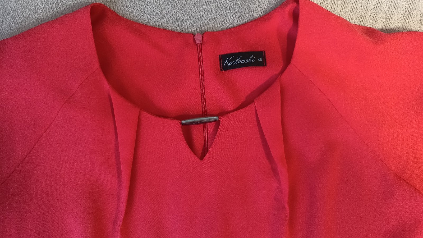Farba: V skutočnosti sú šaty tlmenej ružovej farby. Na fotografiách kvôli svetlu pôsobia ako krikľavo červené, no reálne je odtieň jemnejší, elegantný a tlmenejší.
