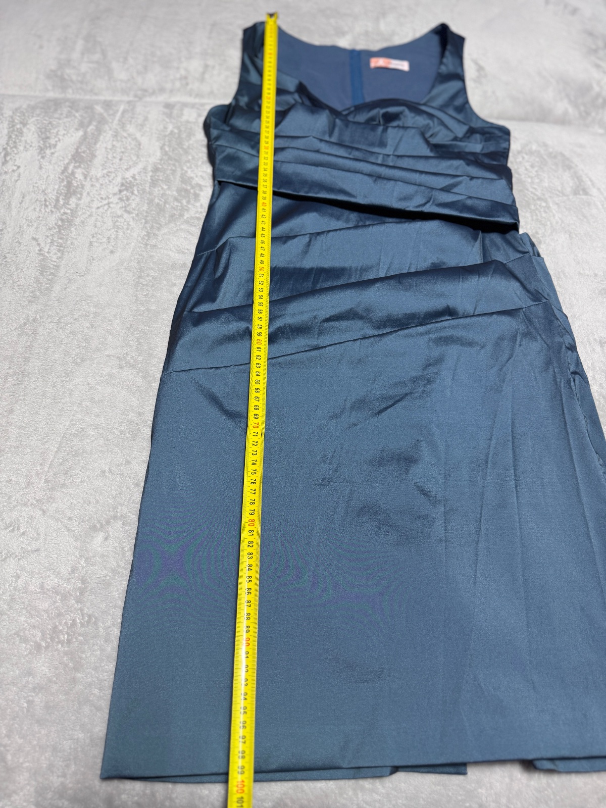 Popis tovaru: Dámske oceľovomodré šaty značky Numoco , prekladaný spodok šiat strih do A, v páse opasok je súčasťou šiat, krátke rukávy, okrúhly výstrih. Vzadu všitý zips, mäkká a príjemná látka, m...