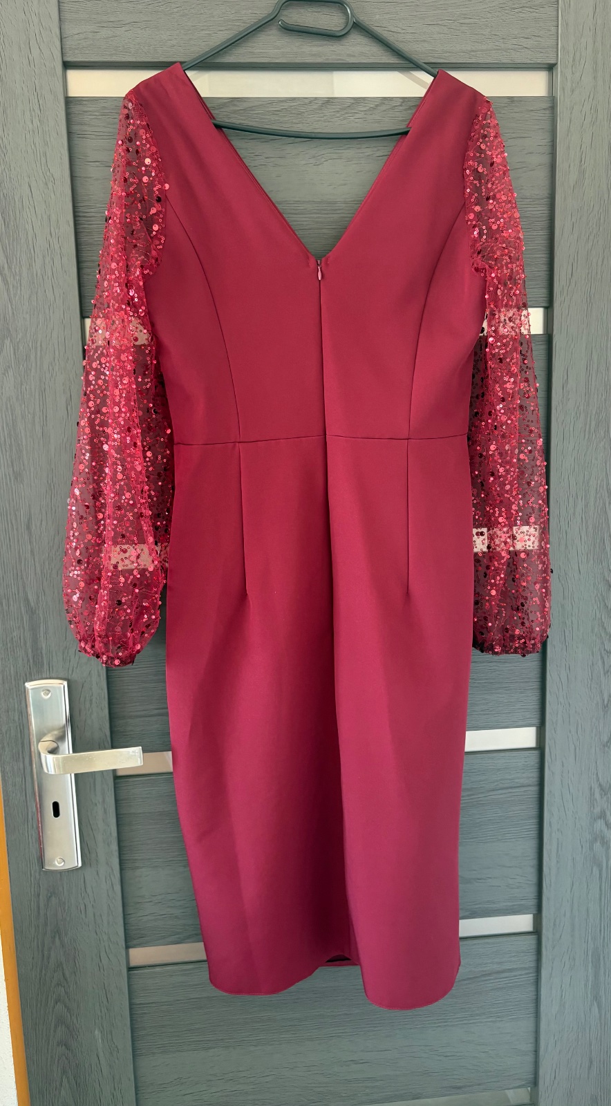 Šaty, ktoré s tebou do miestnosti prinesú obrovskú nádielku elegancie, rafinovanosti, noblesy. Flitre, ktoré zdobia rukávy k vám zaručene pritiahnu pozornosť. Materiál šiat je mierne elastický a vzadu sa zapínajú zipsom. Šaty sú veľkosť 42, sedia ako dokonale L Raz oblečené, vyčistené, bez známok používania.