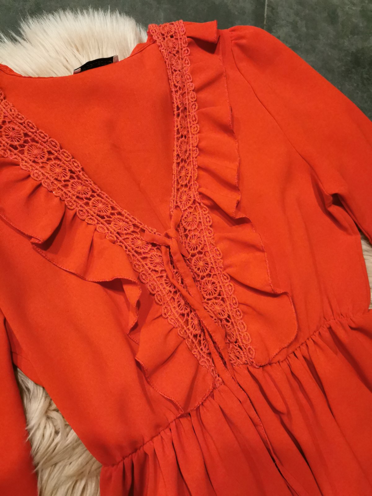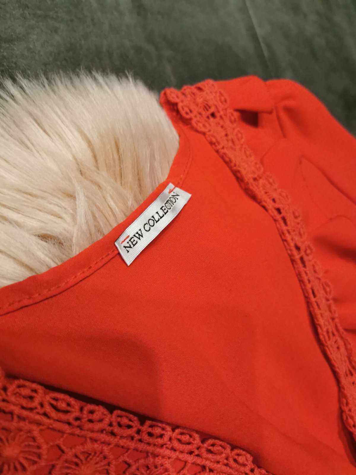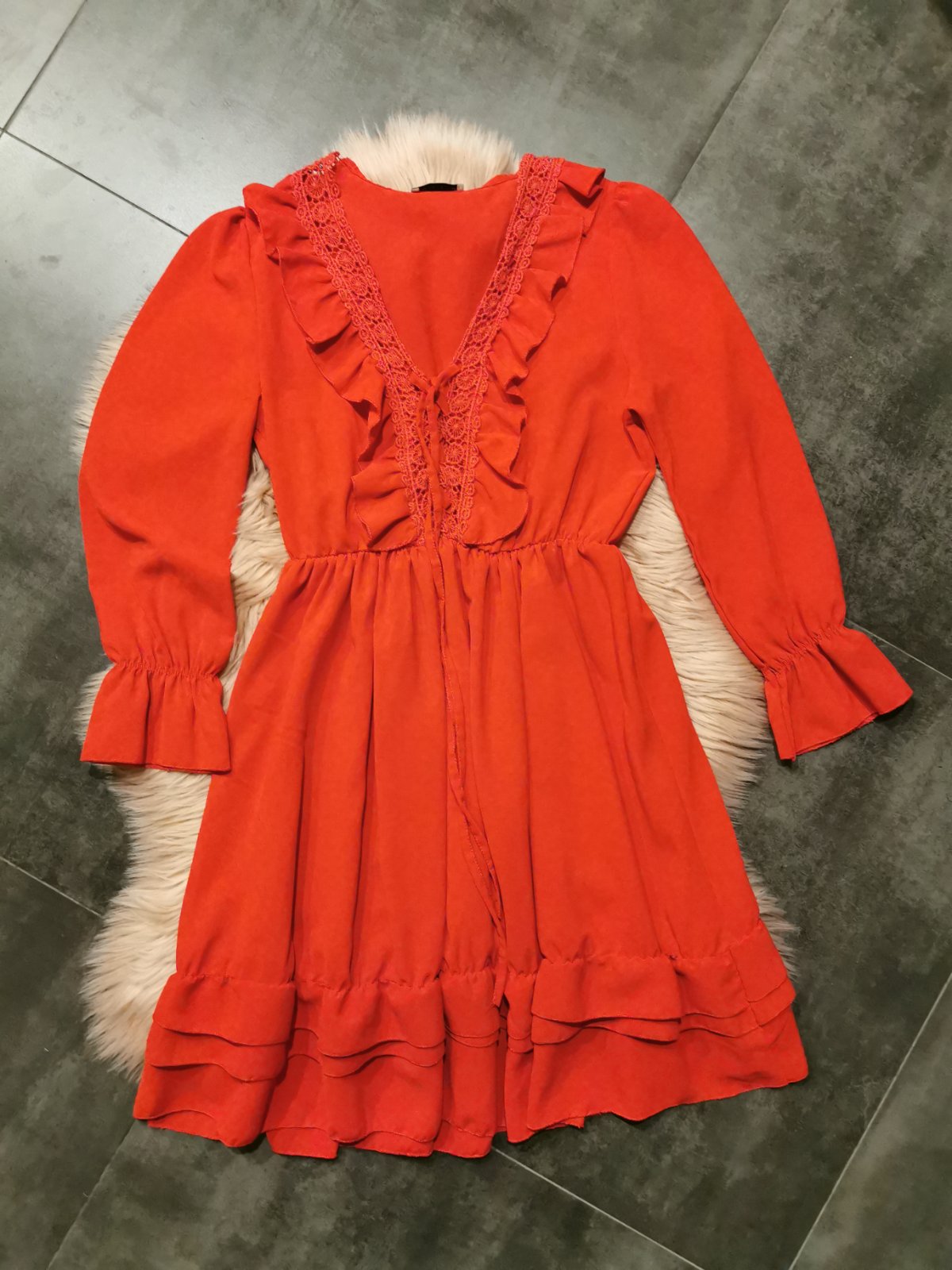 Šaty sú nové, nenosené. Len som akčne strhla visačku. Sú krásne červené, na fotke fotené pod umelým svetlom, preto farba trosku skresluje. V prípade záujmu odfotim pri dennom svetle.