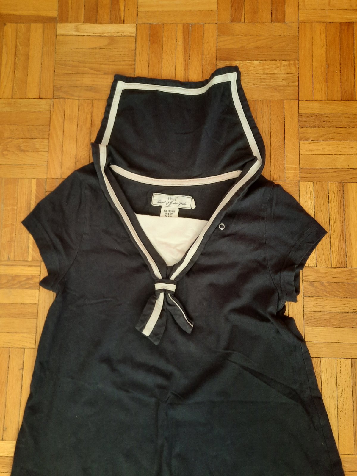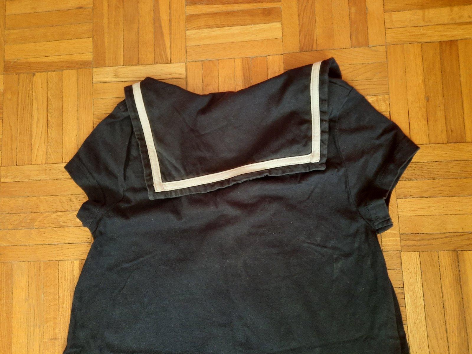 Veľmi pekné dievčenské šaty na "námornícky" štýl. Má väčší golier. Je to bavlnený, elastický úpletový materiál. Výborný stav.