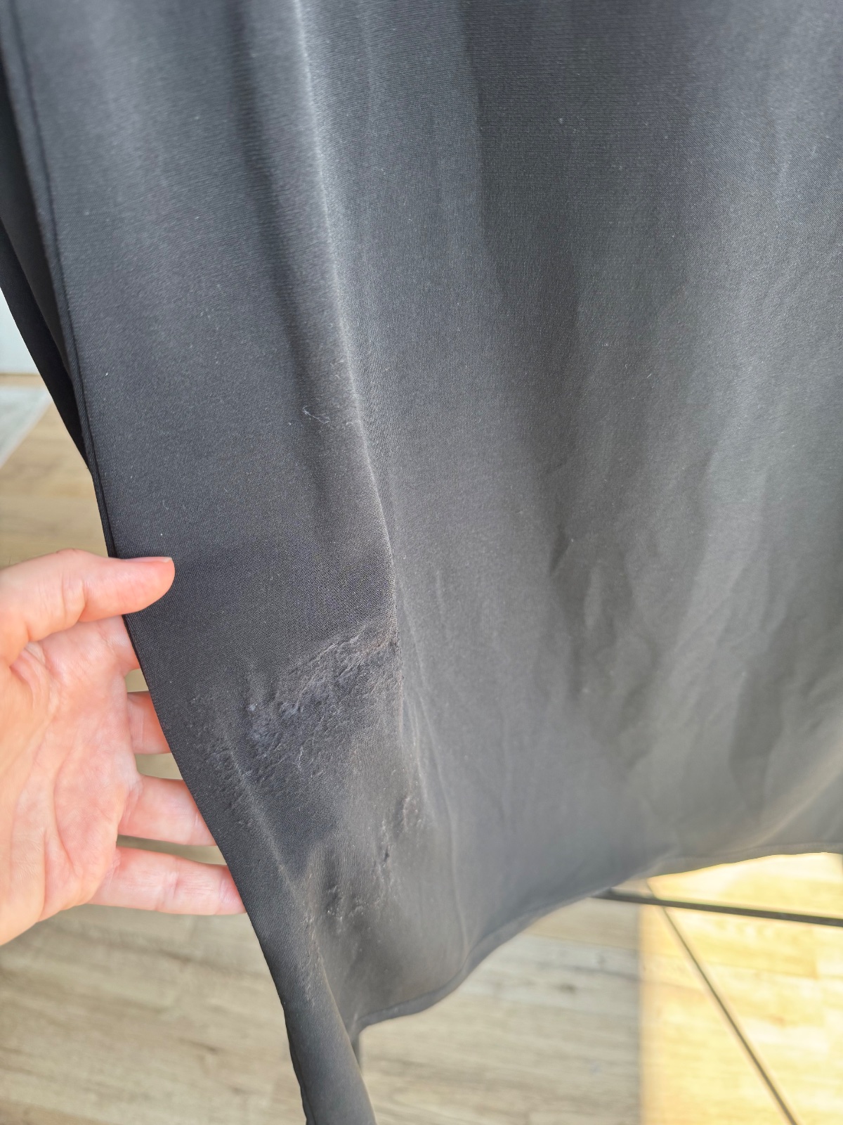 Šaty majú síce visačku, ale boli zakúpené s poškodením - na zadnej strane vľavo dole majú ošúchaný materiál. Mierne ošúchaný material majú aj na pleci. Všetko vidno na fotkách. Vzhľadom na tmavú farbu šiat to pri nosení nebude vidno + je možné skúsiť material ošetriť napr. odžmolkovačom. Každopádne poškodenia sú zohľadnené v cene.