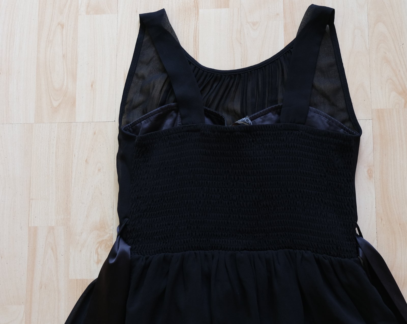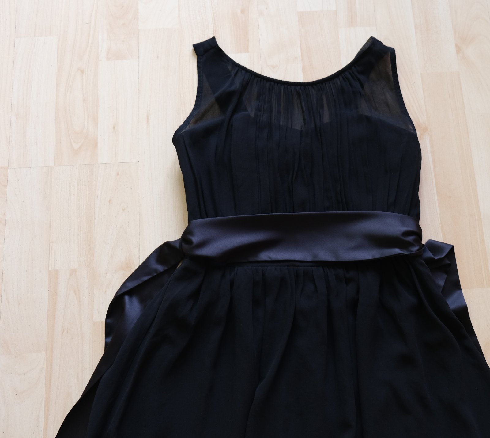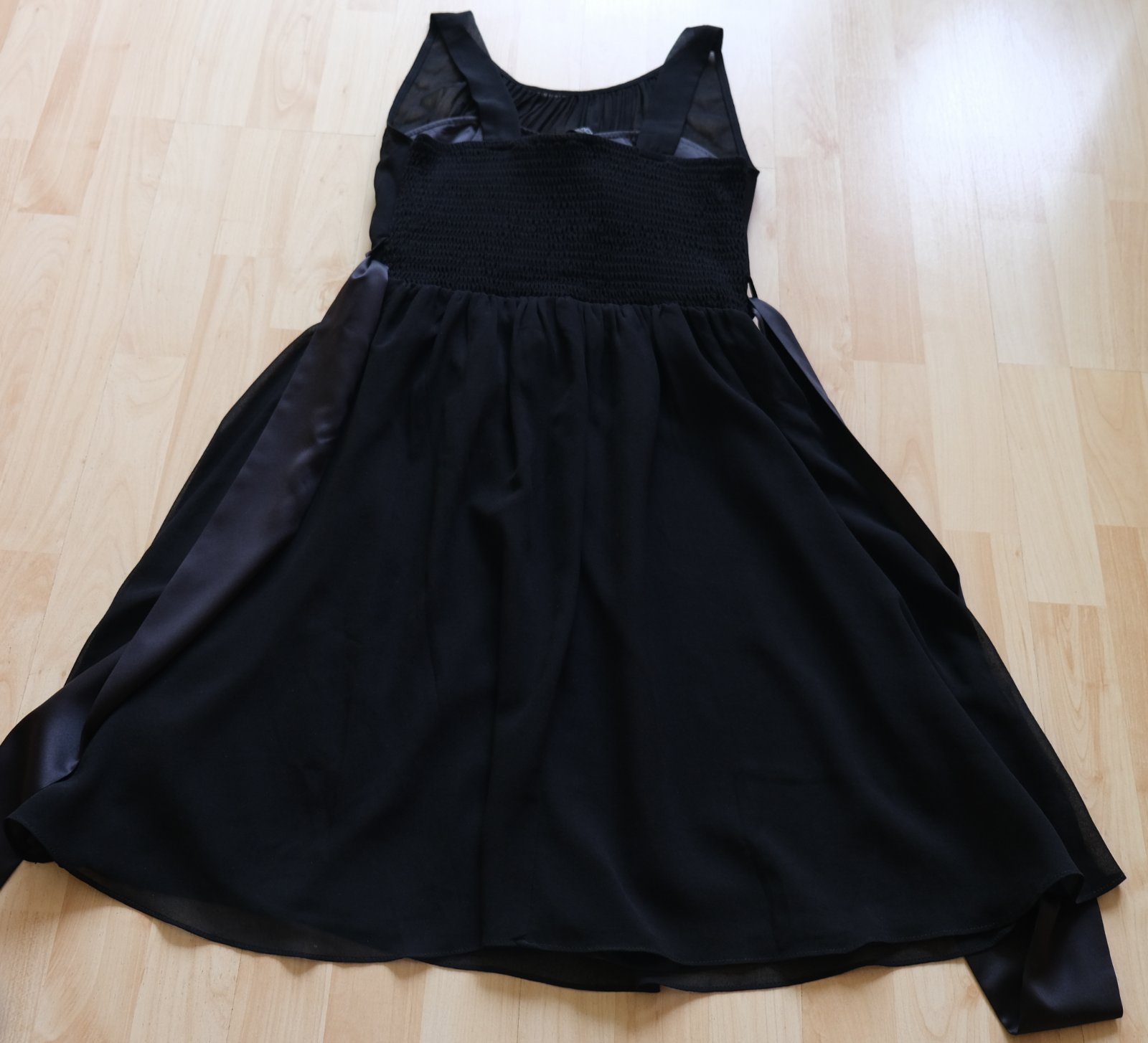 Popis tovaru: Čierne šifónové elegantné šaty , vystužené na prsiach a vzadu na ramienka a na chrbte riasená guma čiže sa prispôsobia postave, na páse saténová stuha dá sa uviazať,
