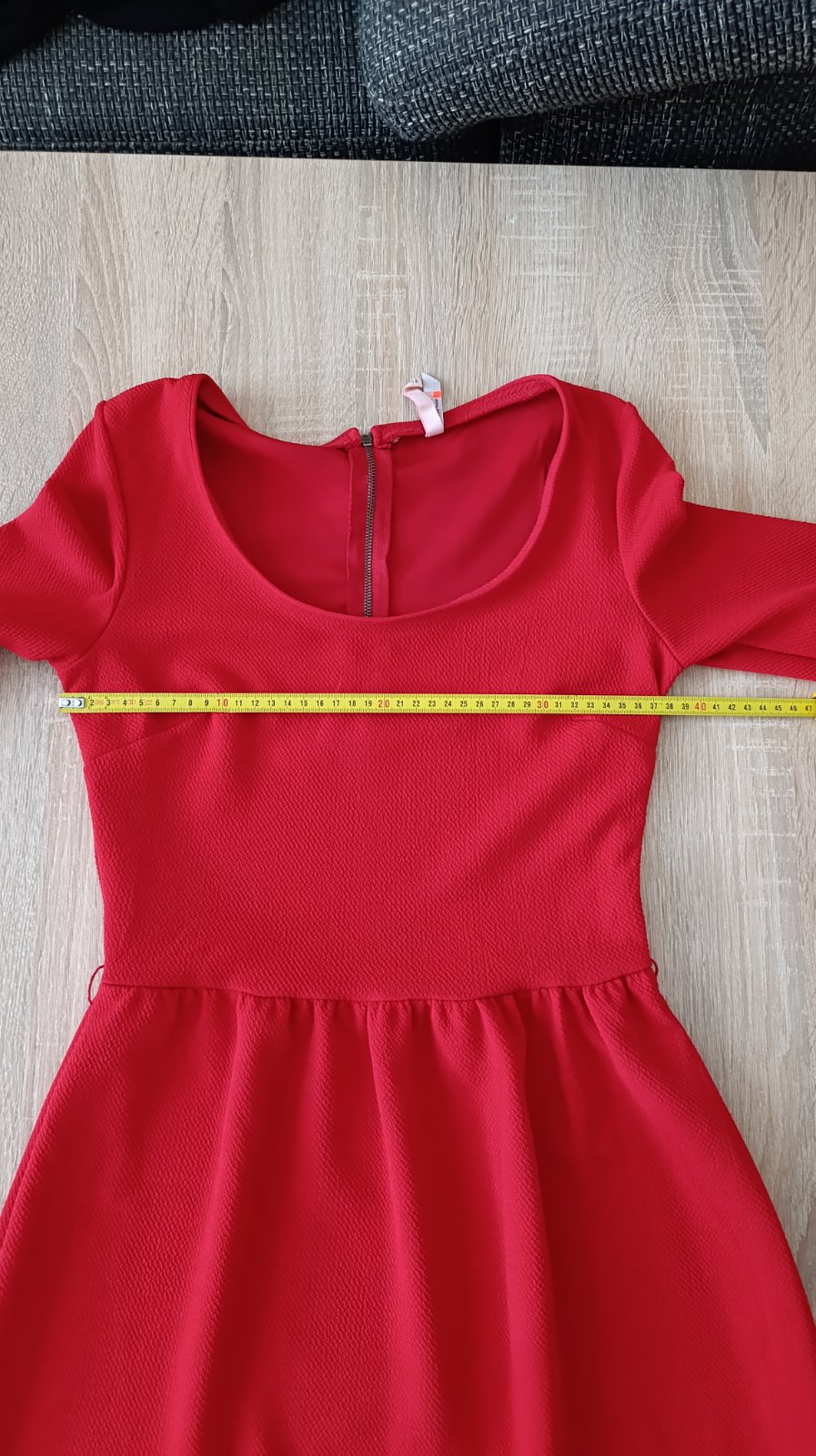 Krasne vinovocervene saty zn Bershka vhodne na spolocensku udalost alebo vianocny vecierok Sirka pod pazuskami 45 Dlzka 85 Rukav od krku aj s volanom 62 Pekne sedia, material jemne vrubkovity, p...