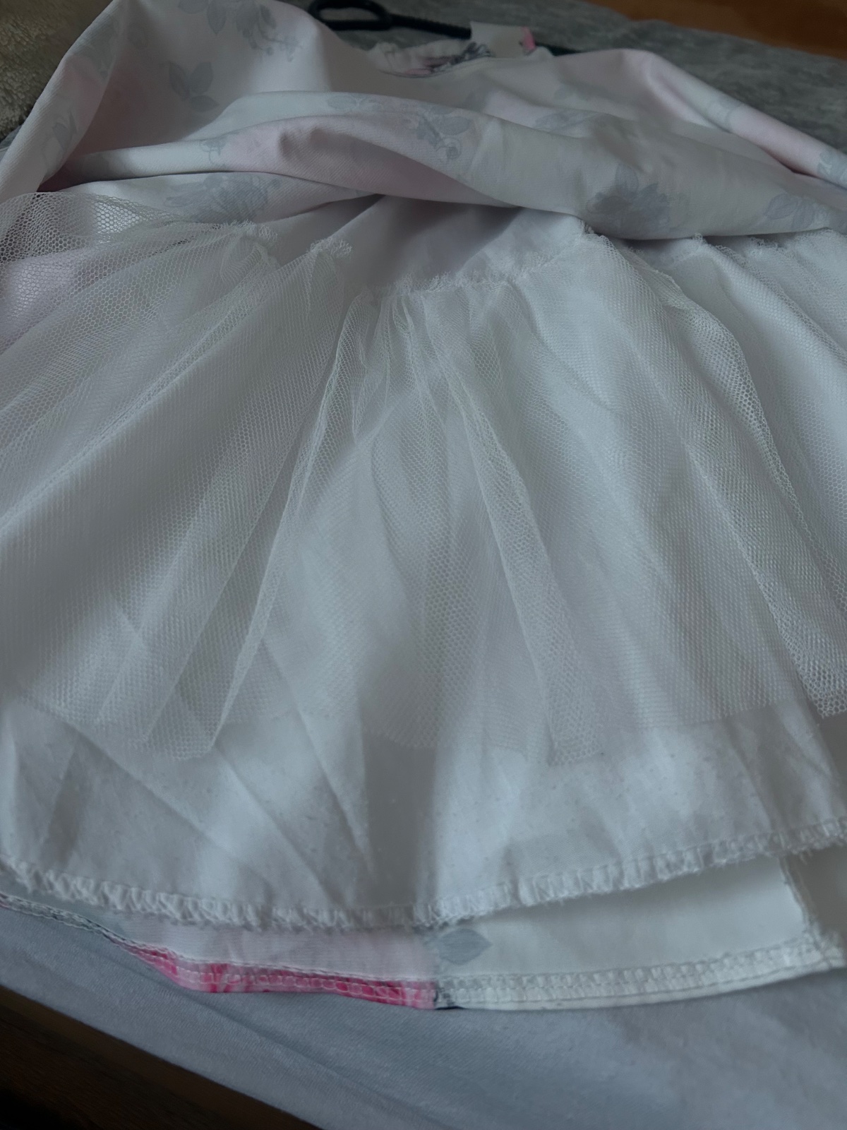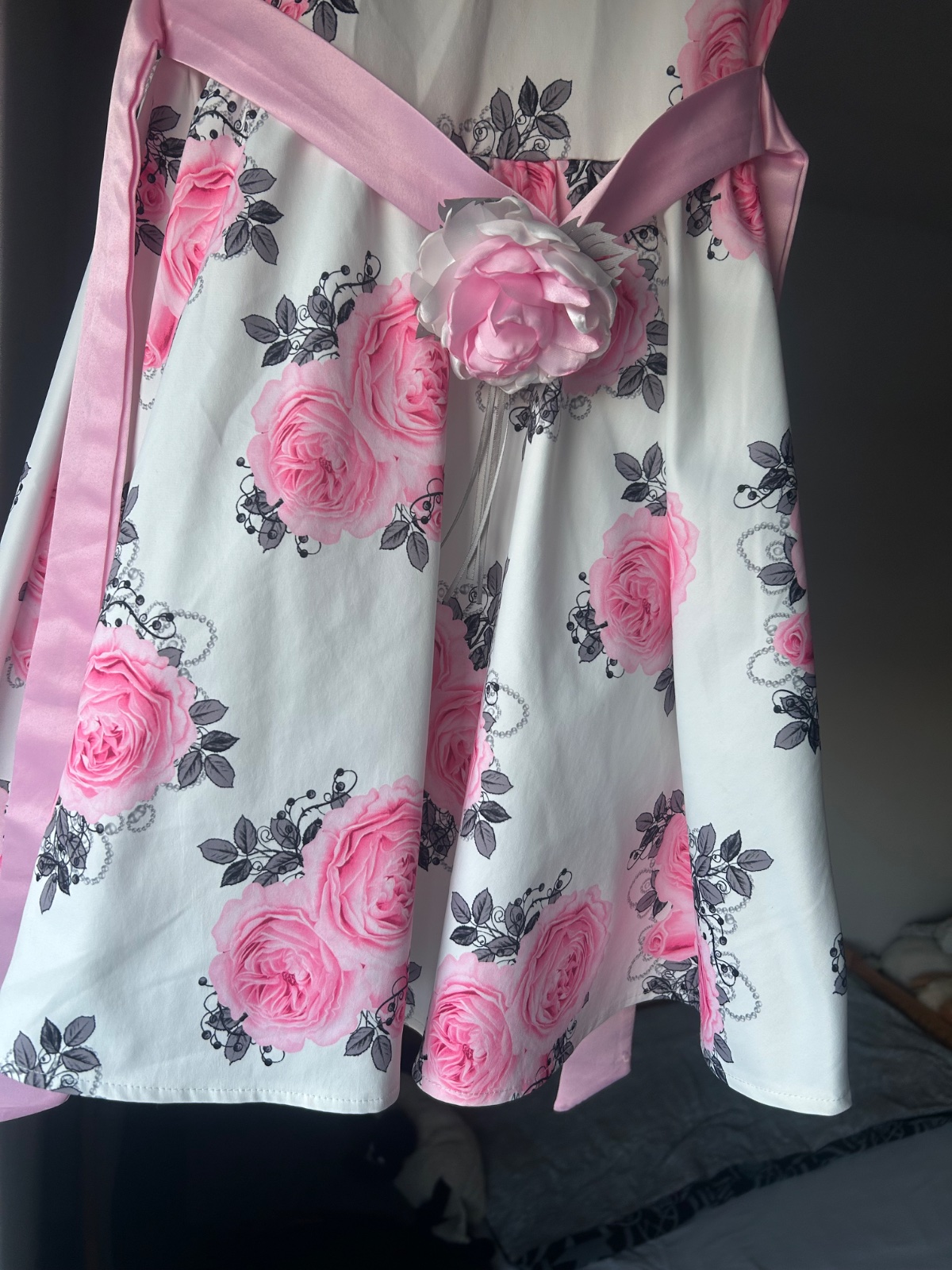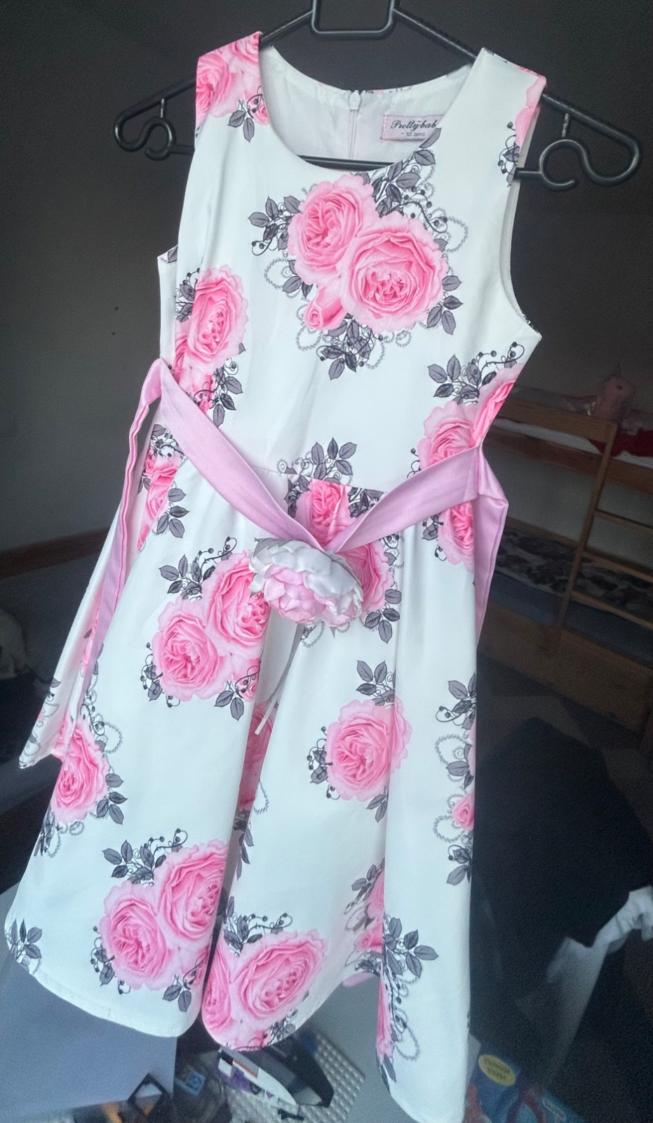 Dievčenské spoločenské šatôčky, oblečené raz. Nepoškodené! brošňa ruža na opasku sa da odopnuť, vďaka spodničke s tylom posobi sukňa objemne. celková dlžka šiat 72 cm. vhodna cca 8-9 rokov