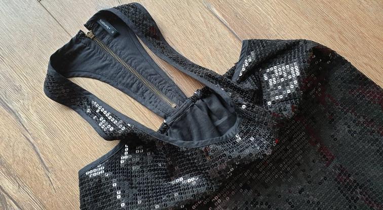 len vyskúšané, nositeľné ako mini šaty alebo ako tunika na legíny, voľný strih, písaná veľkosť M ale kľudne M/L(fotené na postave veľkosti L), podšívka je bavlnená vrchný diel je z oboch strán posypaný flitrami, spodná časť je nariasená, vzadu na chrbte s gumkou, ktorá sa pekne prispôsobi, majú bočné vačky, sú bez vysačky, poštovné 3€