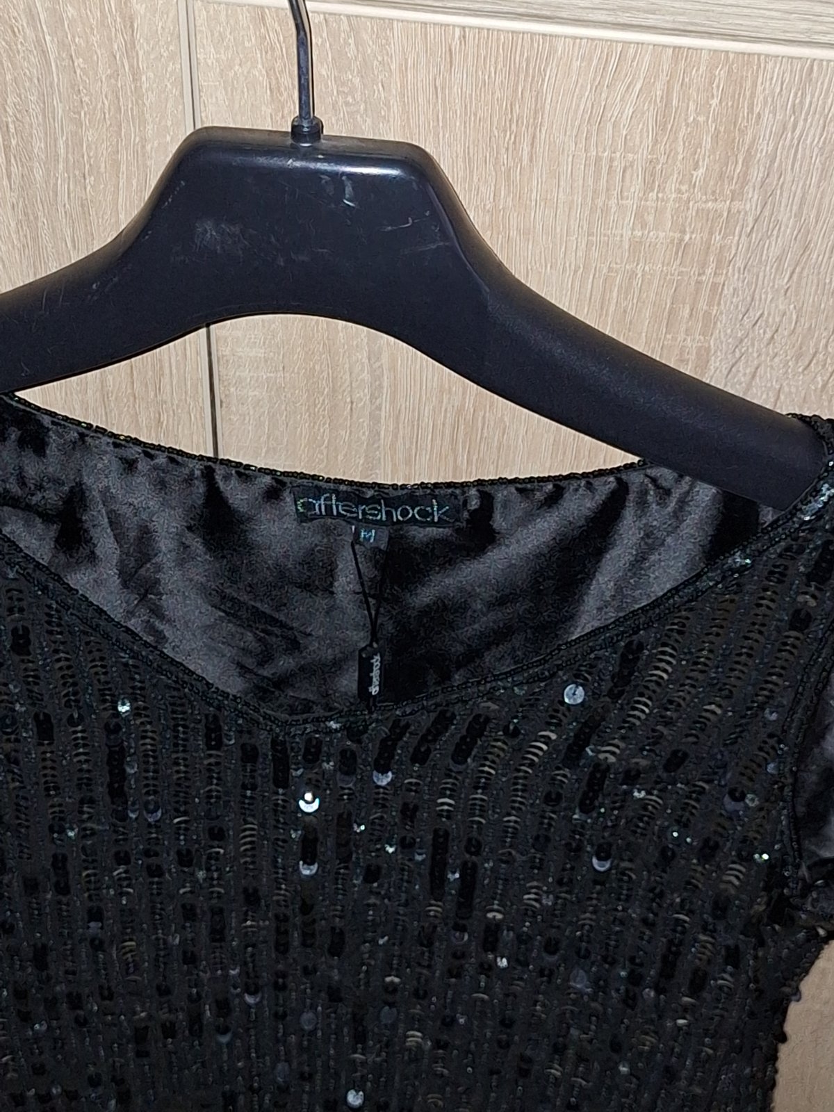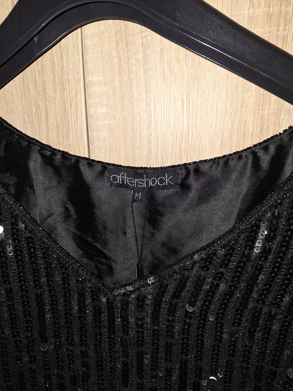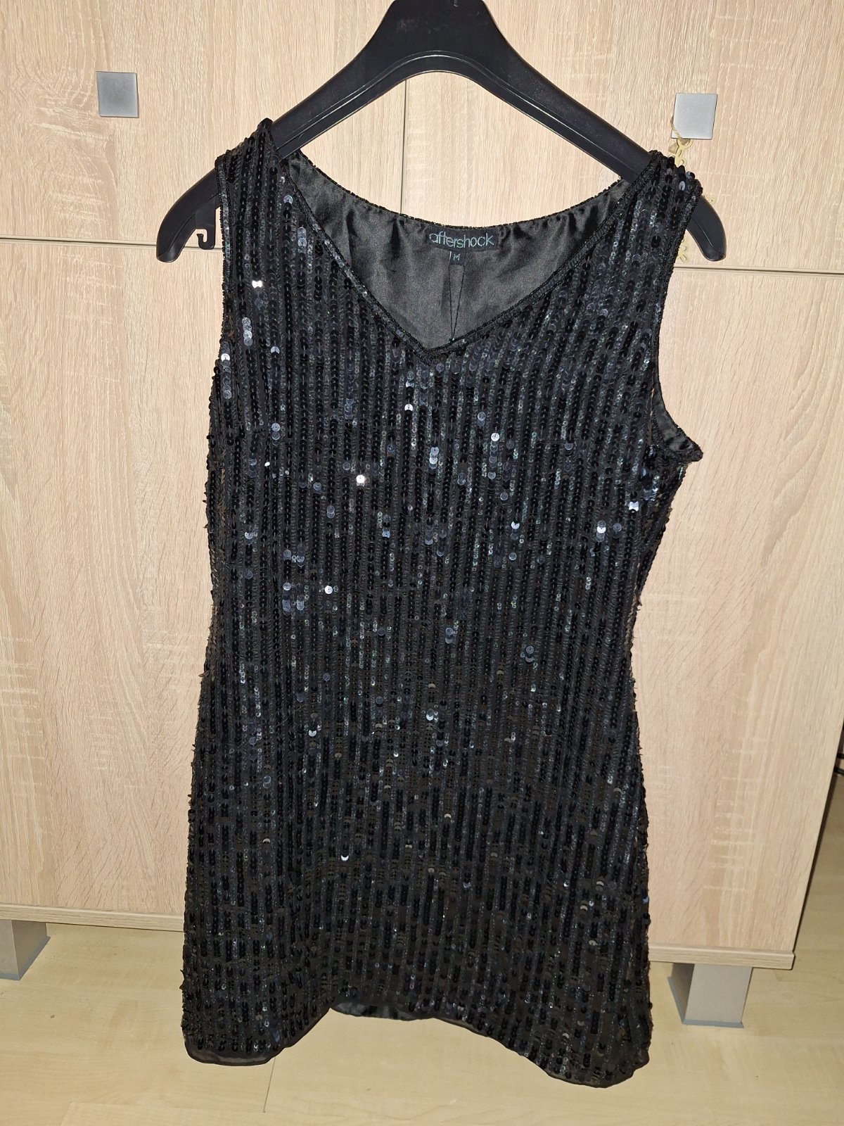 Modne flitrované,trblietavé saty,kvalitnej značky AFTERSHOCK London. Veľkosť pisana M,nobsu tak volnejšie S,obtiahnutejšie M-ko. Velmi kvalitné,celopodšité kvalitnou hrubšou satenovou podšívkou. Zvršok kvalitne prevedený z flitrov a koráliek. Zboku zips.