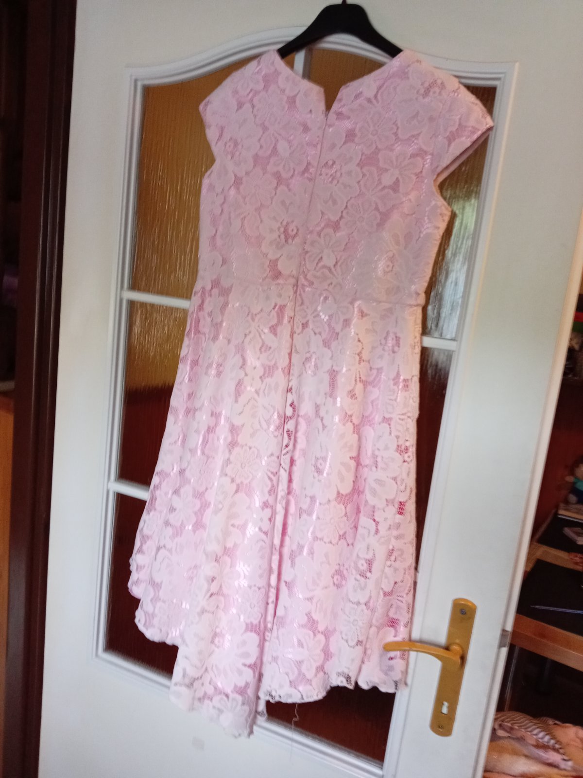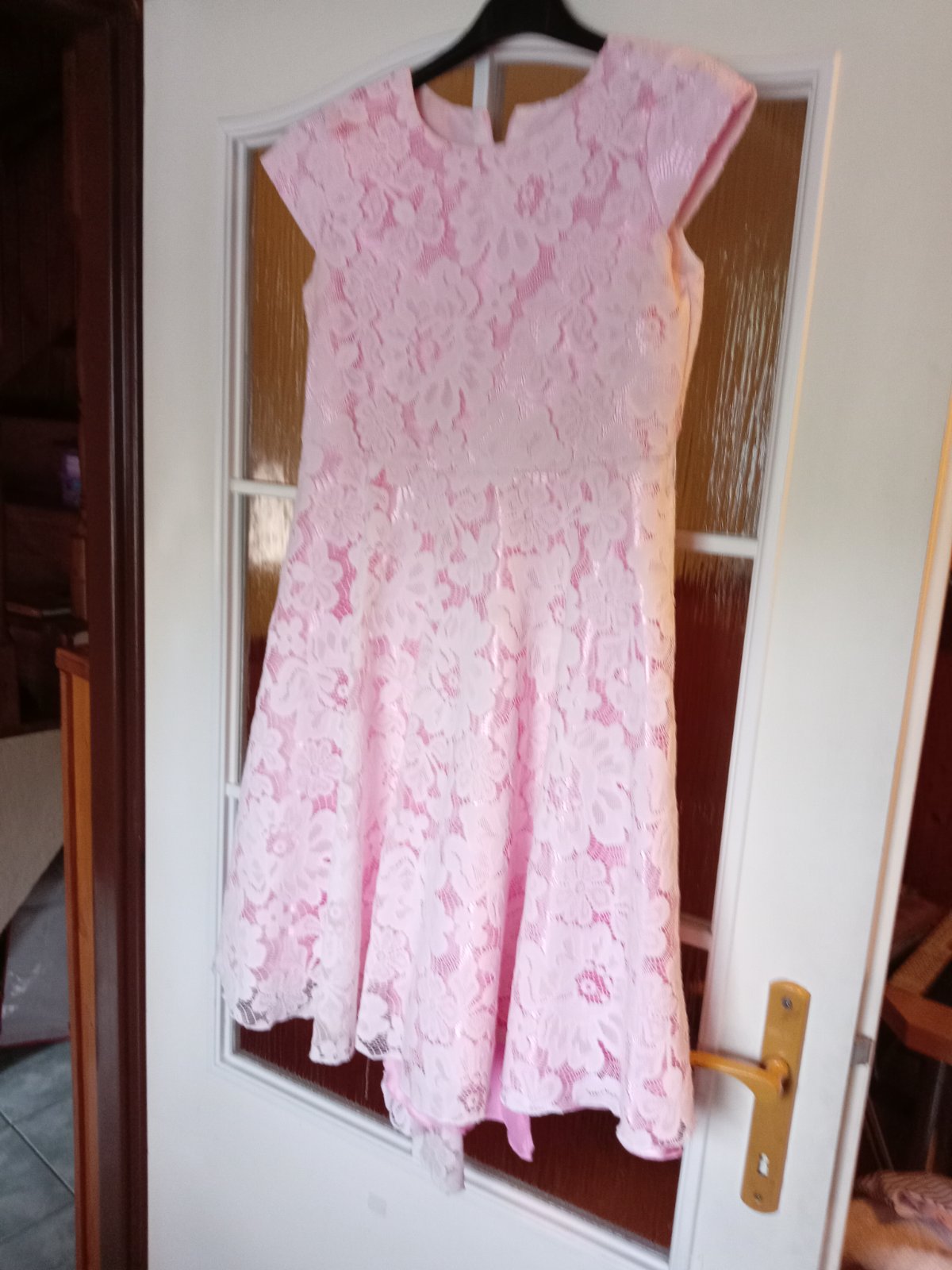 Krásne slávnostné šaty, majú spodnicku, oblečené párkrát na svadbe, krste, a na fotení. Veľkosť neudana, cca 152, celková dĺžka od ramena 90cm, pás 2x34cm, hruď 2x38cm.Vzadu trochu predĺžené a zapínanie vzadu na zips.