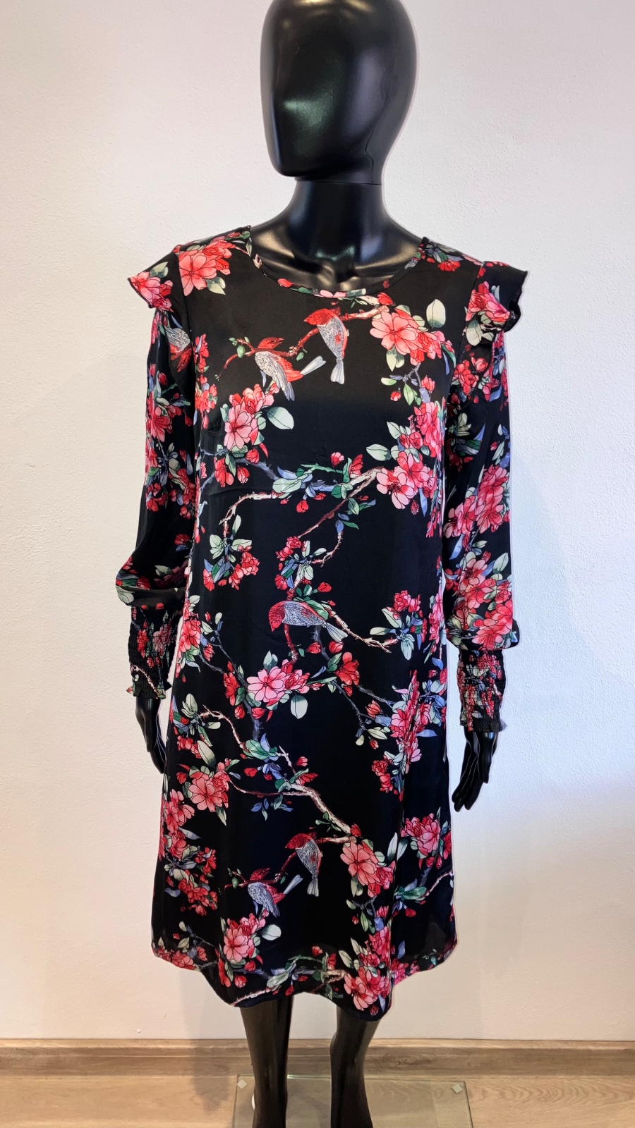 Čierne šaty od Lindexu s kvetinovým vzorom a vtákmi. Šaty majú dlhé rukávy s gumičkou a malým volánikom na ramene. Má malý otvor s gombíkom pri krku a je podšitý (okrem rukávy).