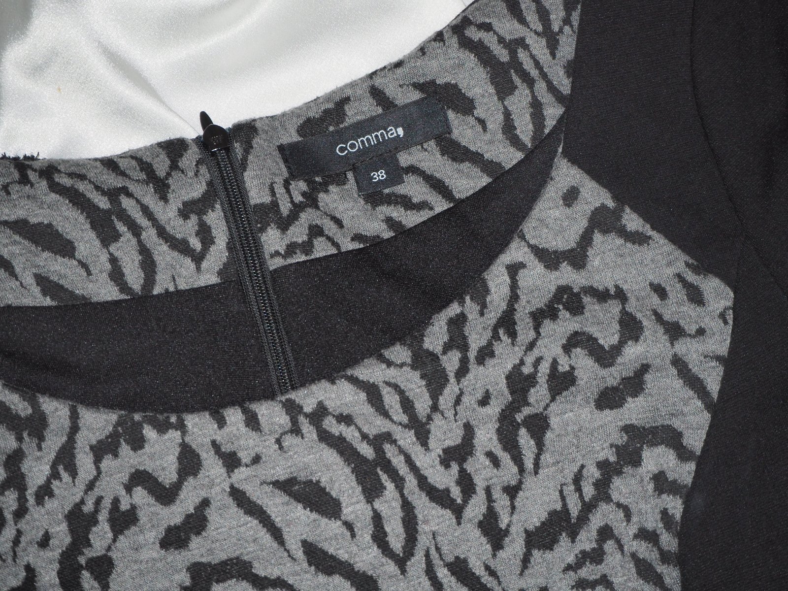 Luxusné úpletové šaty čierno-sivej farby, zapínanie na zips vzadu, podšité, materiál 65% polyester, 30% viskóza, 5% elastan, super stav.