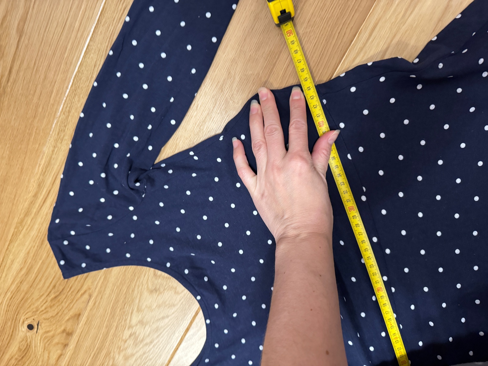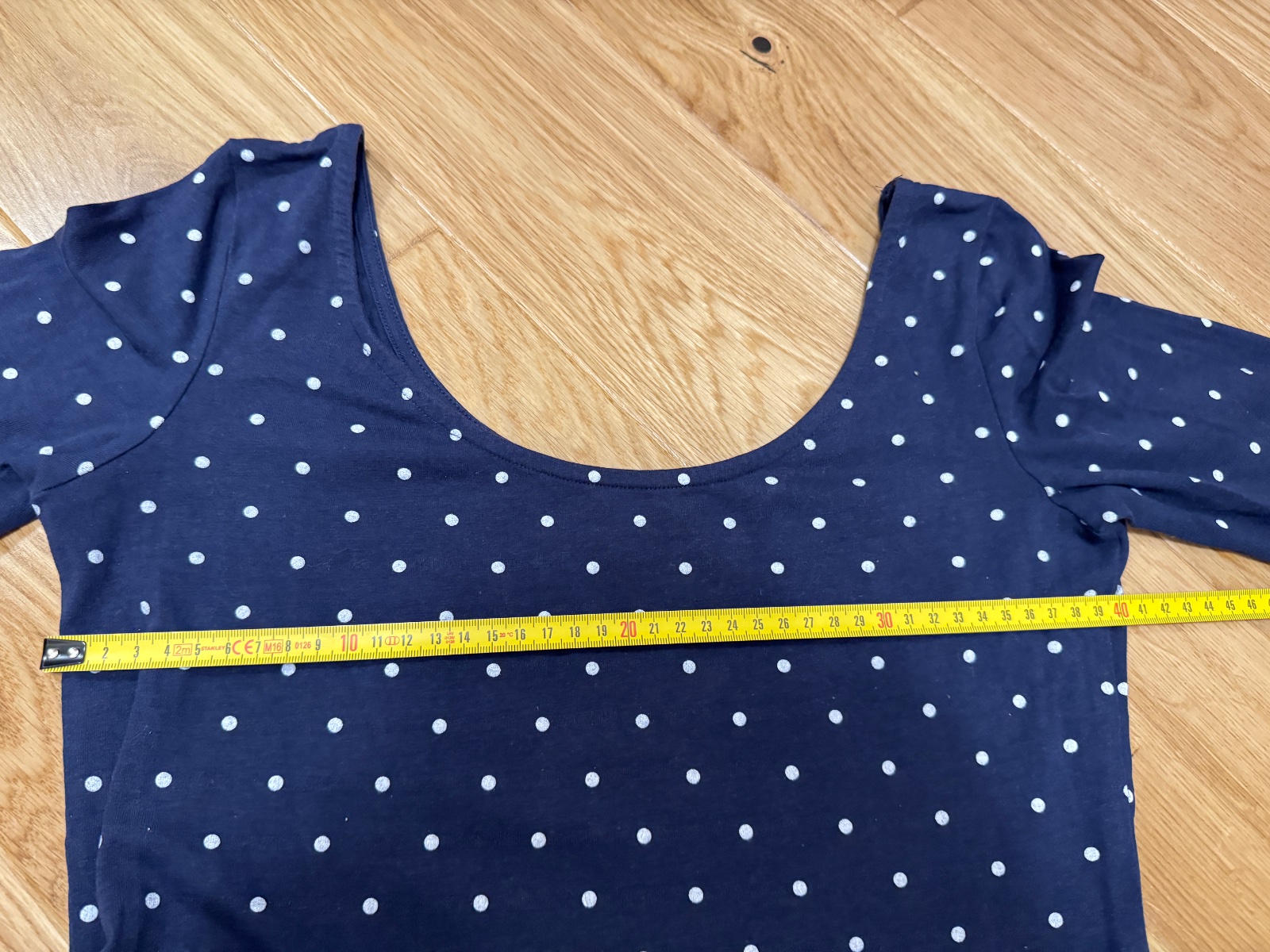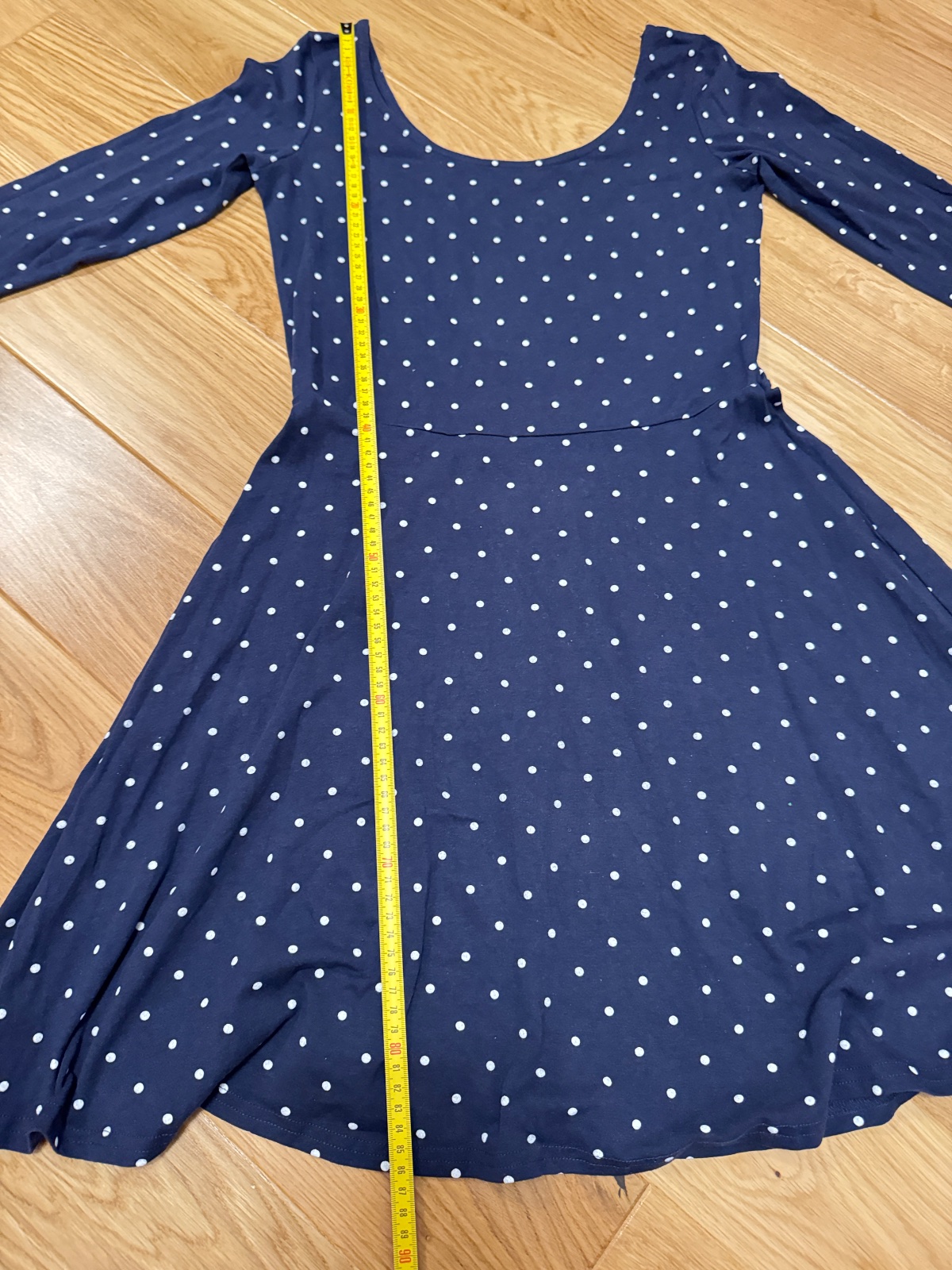 Šaty modré s bodkami. Krásny dievčenský strih. Písaná je veľkosť L, ale podľa mňa je to veľkosť M - presné rozmery na foto. Sú elastické, foto v páse v kľudnom stave, aj pri natiahnutom.