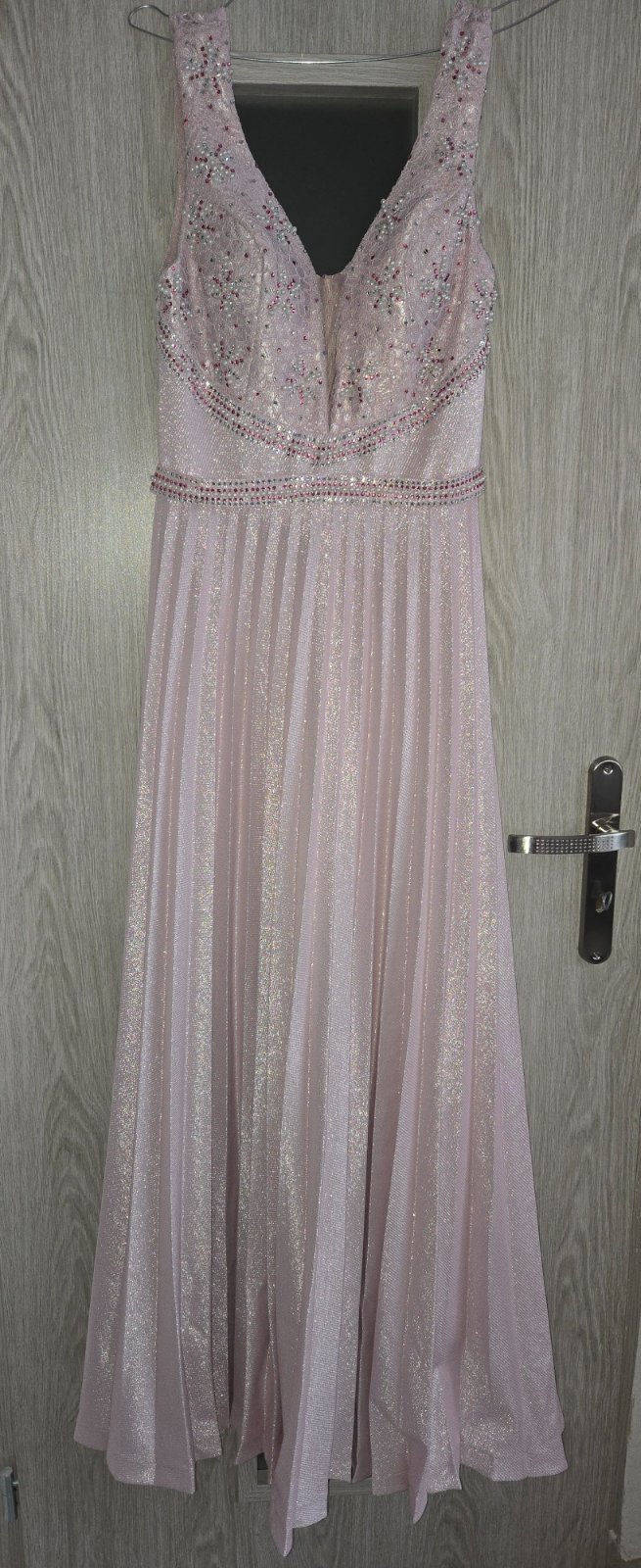 Krásne trblietavé šaty ružovo púdrovej farby, veľkosť písaná S, ja nosím 36/38. Vrch skôr 38. Na moju výšku 168cm boli akurát po zem. Šaty sú nádherné s rozparkom pri stehne. K šatám je aj opasok. ...