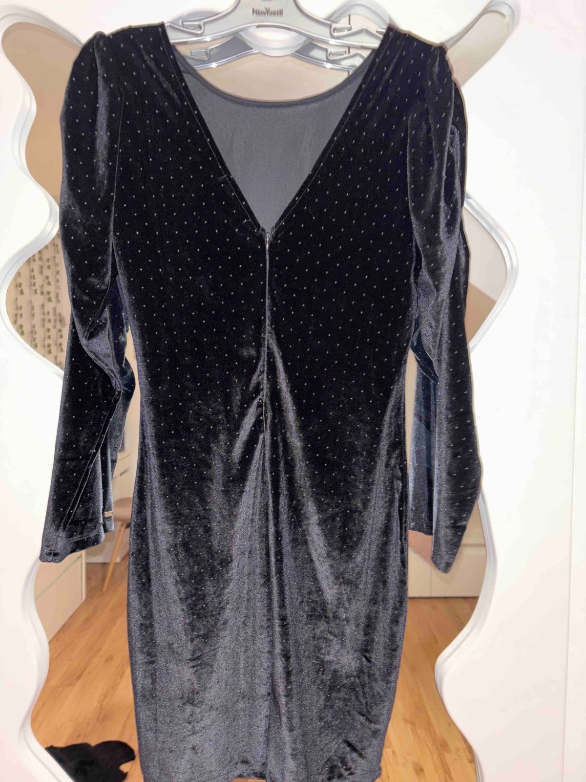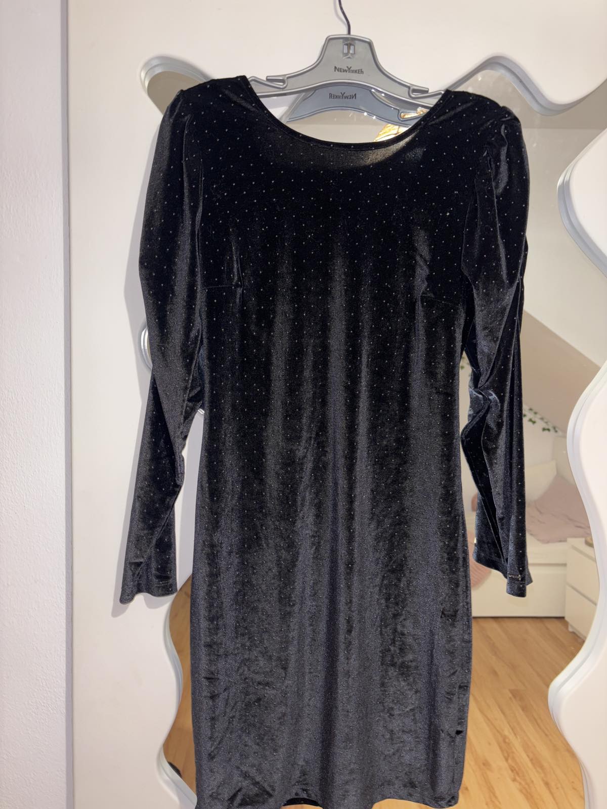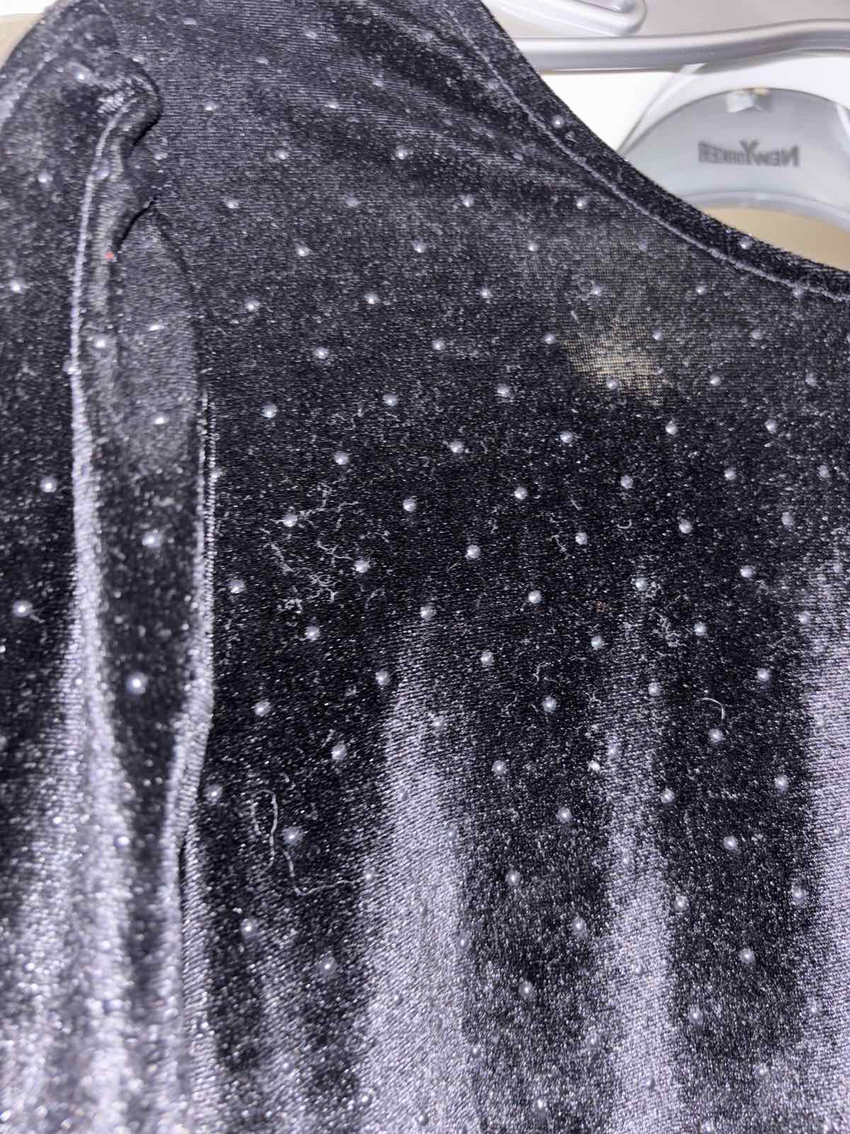 Nové bez visačky, čierne, zamatové so striebornými bodkami, pružné, vzadu v-výstrih, veľkosť S, šírka pod pazuchami 43 cm, dĺžka 90 cm