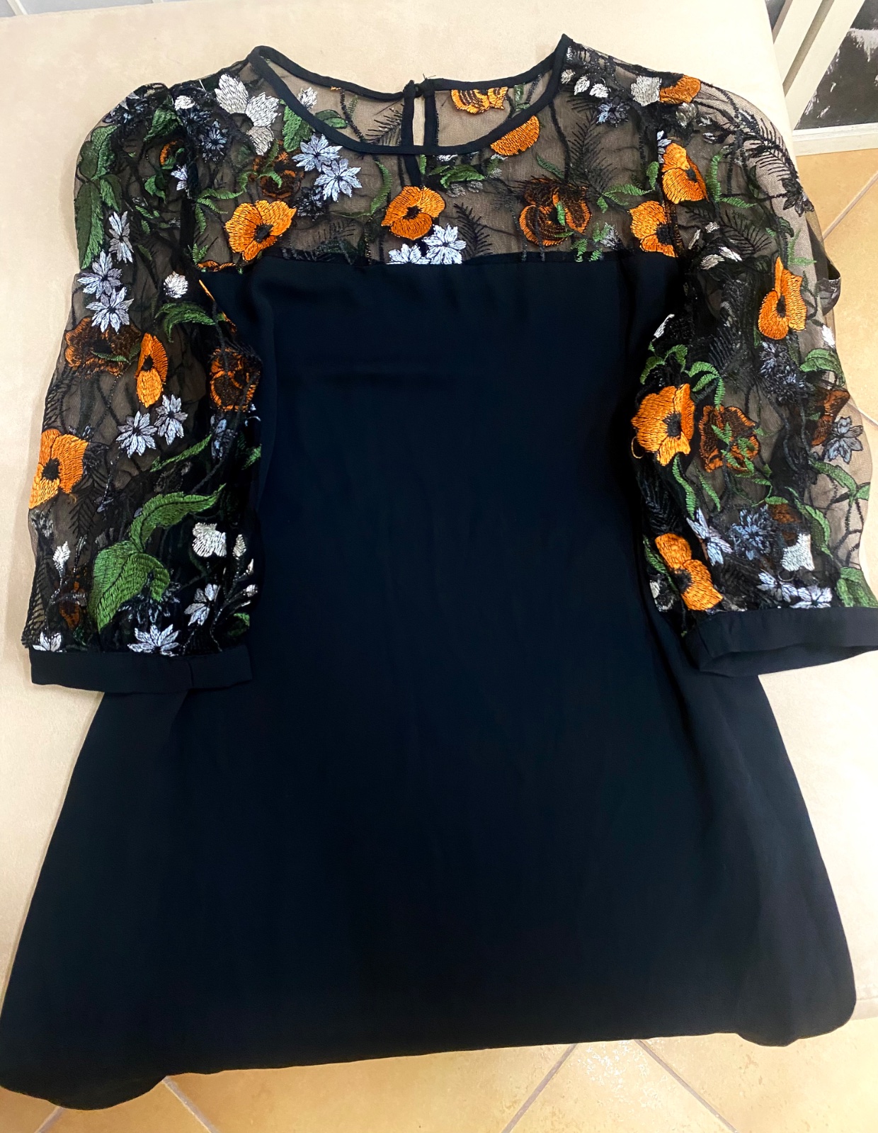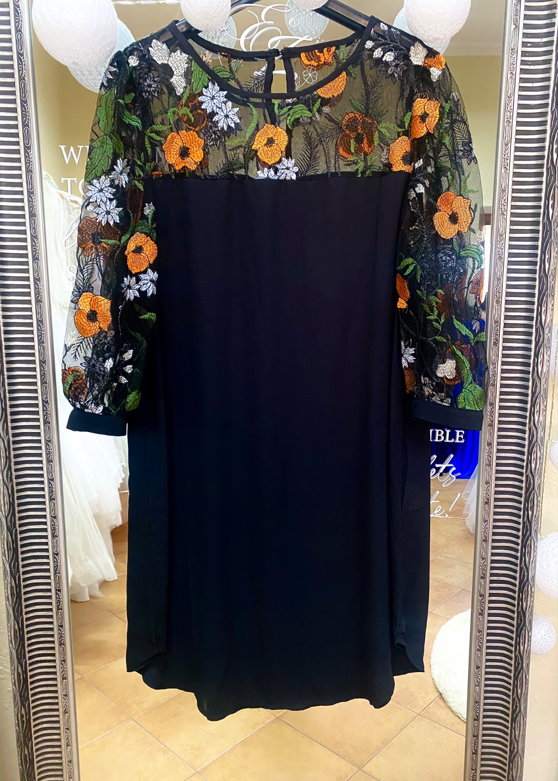 Elegantné čierne šaty s priehľadnou vrchnou časťou a rukávmi z tylu s farebnou výšivkou.