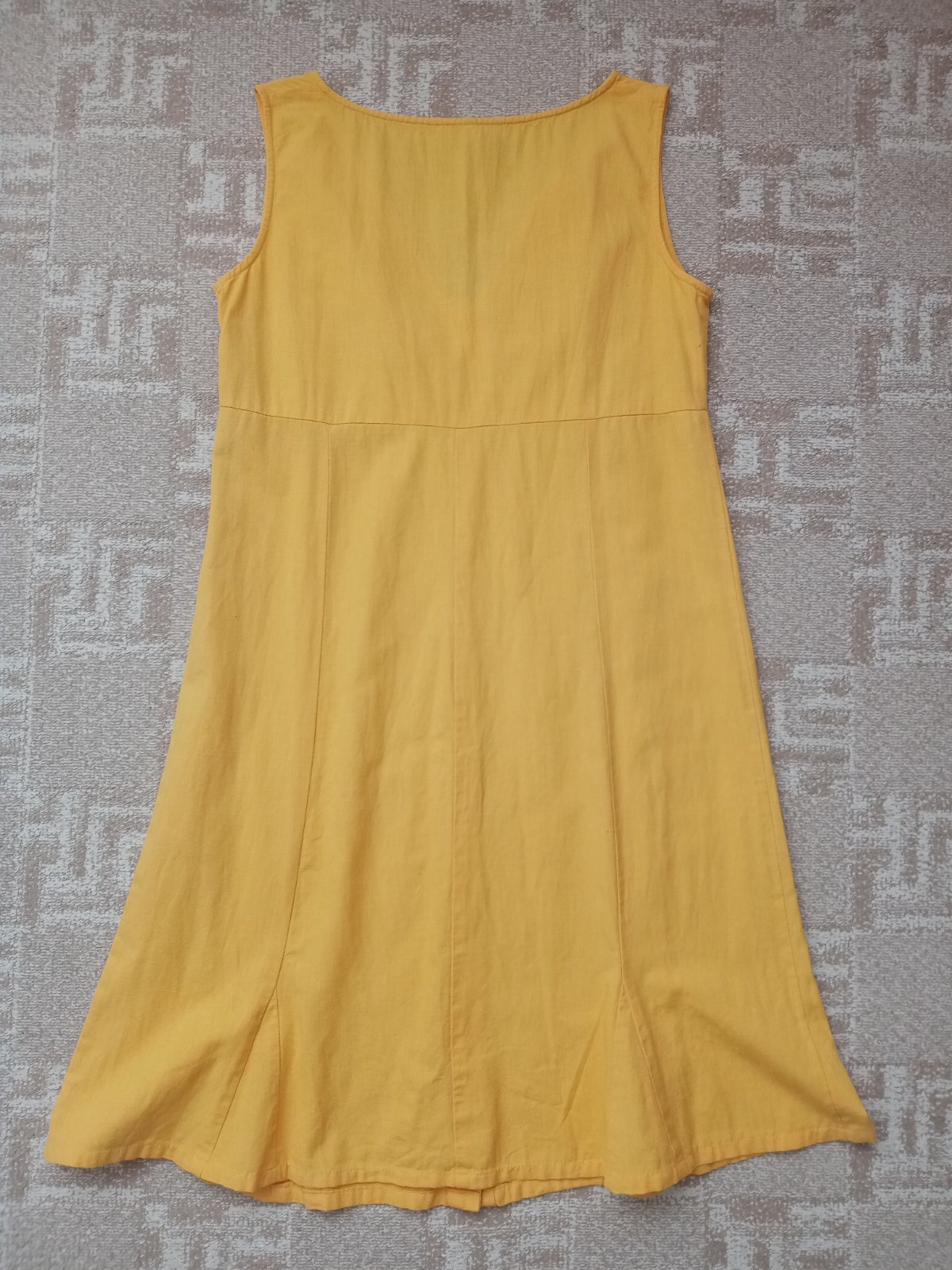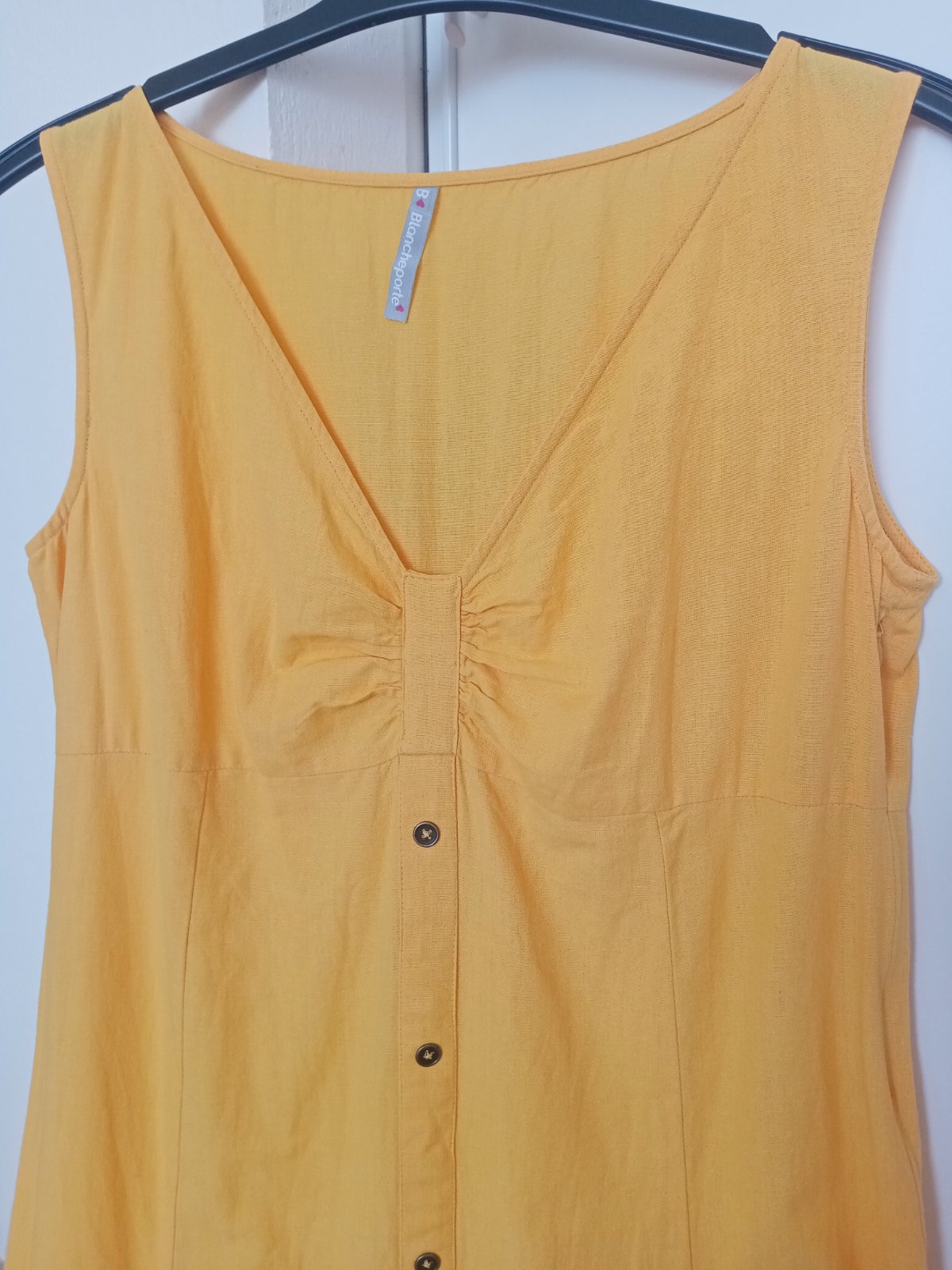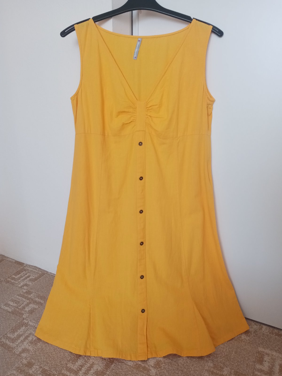Sýto žlté bavlnené letné šaty s gombičkami, strih mierne do A, na boku zapošitý zips. Dĺžka 97 cm, šírka pod pazuchami 48 cm. Značka Blanche Porte.