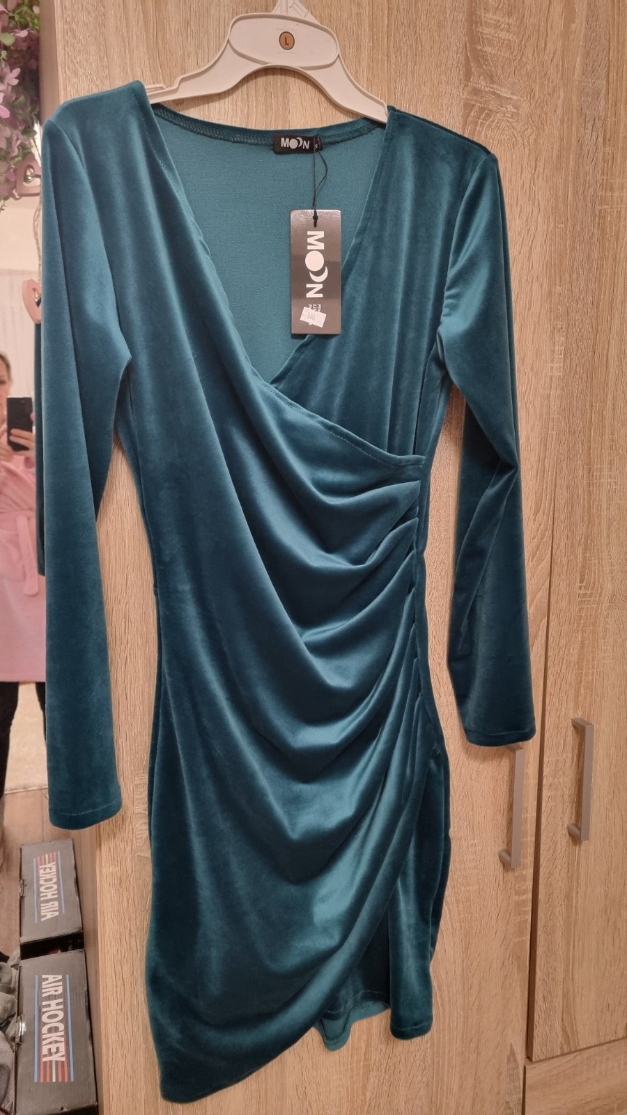 Pekné šaty tmavo zelenej farby. Uplne nové . Bohužiaľ je na nich mini dierka ( viď foto), tá je tam už od nova. Kúpila som ich cez internet a nejak som na to zabudla.