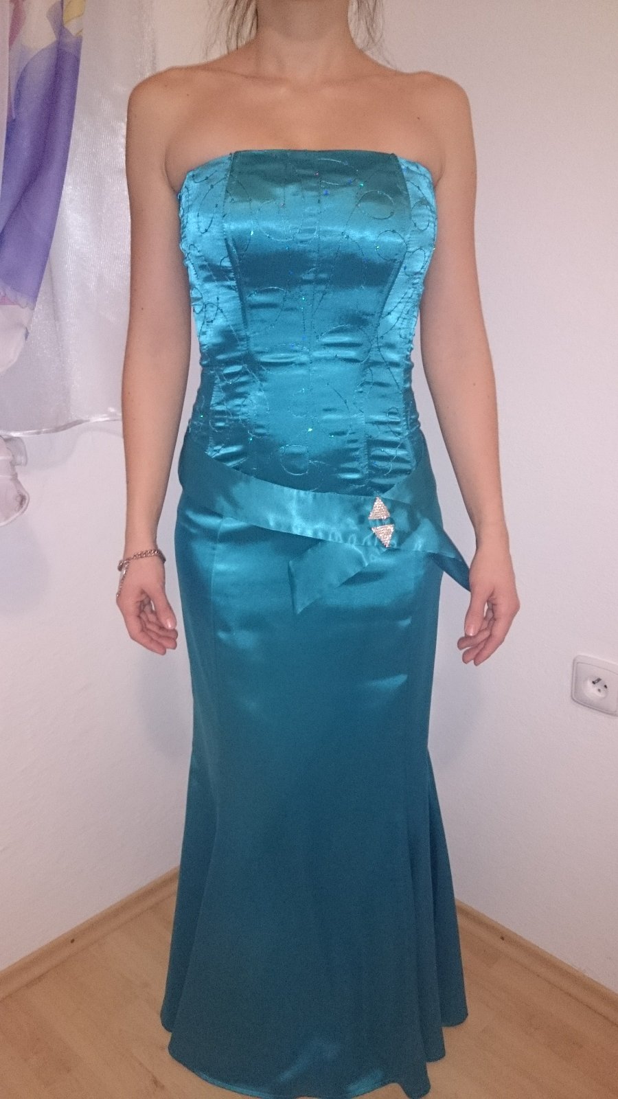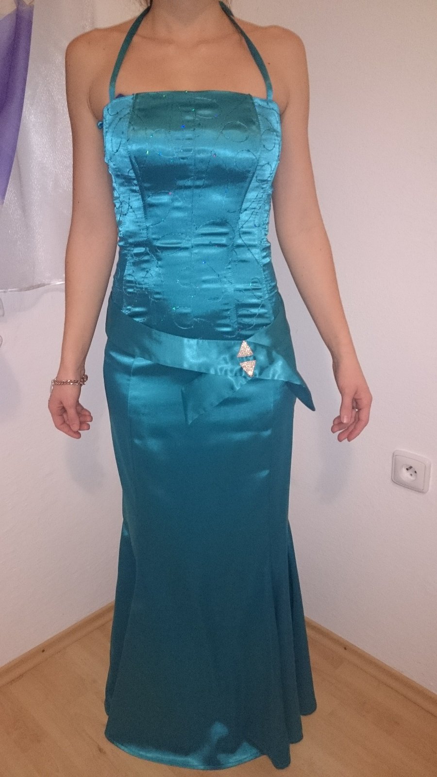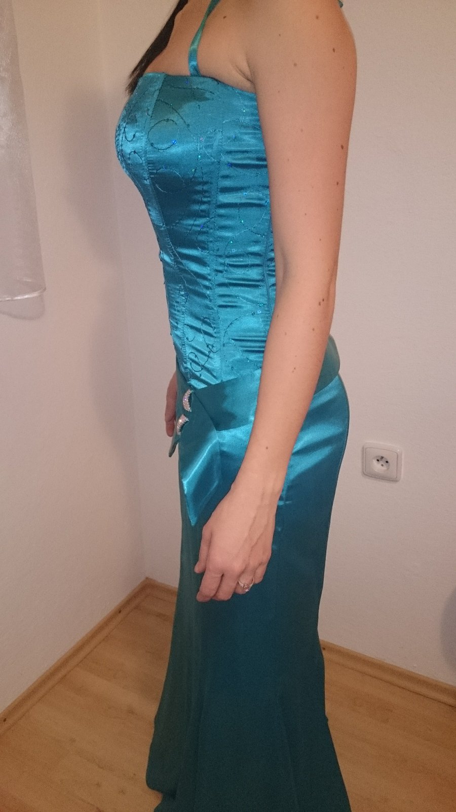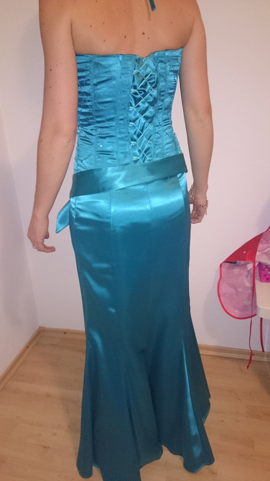 Predám spoločenské šaty.Šaty boli raz oblečené na stužkovej.Zboku sú na zips zozadu sú na šnurovačku. Veľkosť je tak 36-38.dajú sa aj zaviazať okolo krku alebo držia len ako klasické korzetové šaty. Presne rozmery na vyžiadanie.Šaty sú úplne bez poškodení.