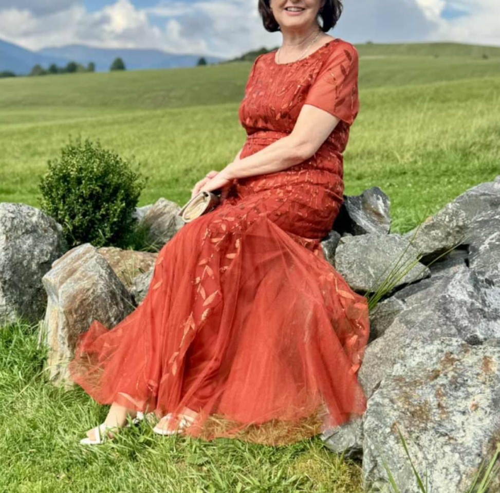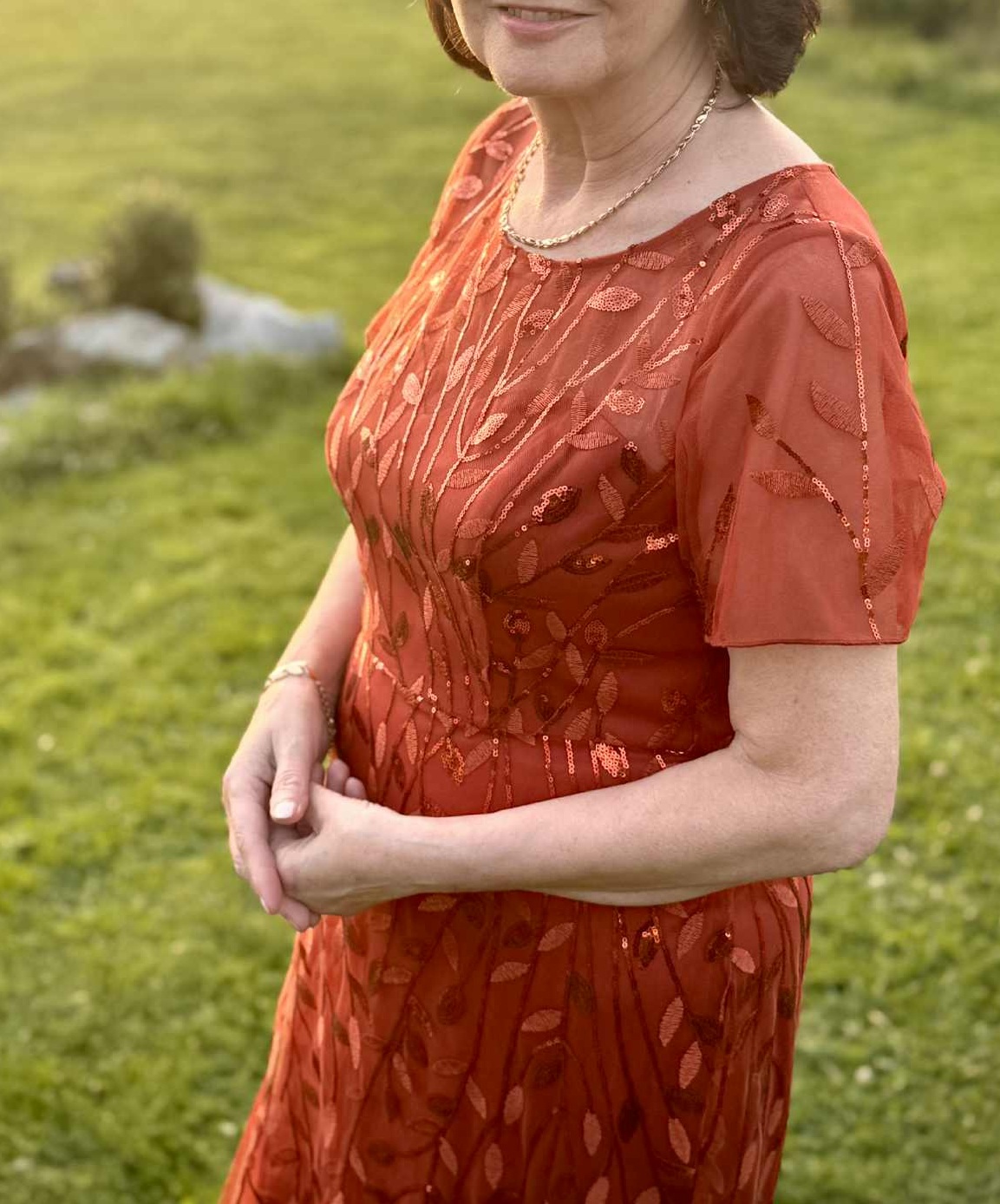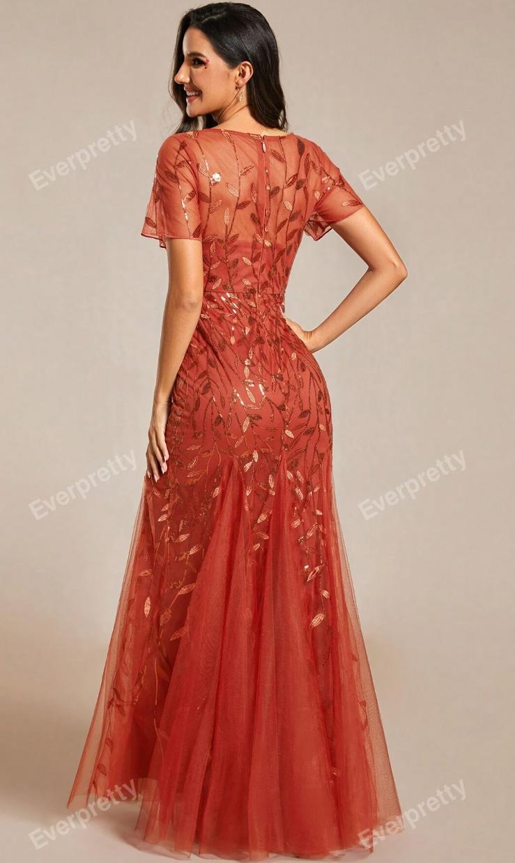 Spoločenské šaty, v tehlovo červenej farbe (spálený pomaranč), s flitrami v zlatistej farbe. Krátky rukáv, na chrbáte zips, sukňa v štýle morskej panny. Veľkostne sedia na 40/42, upravené na výšku 164cm+ opatky, boli oblečené len 1x, nepoškodené.