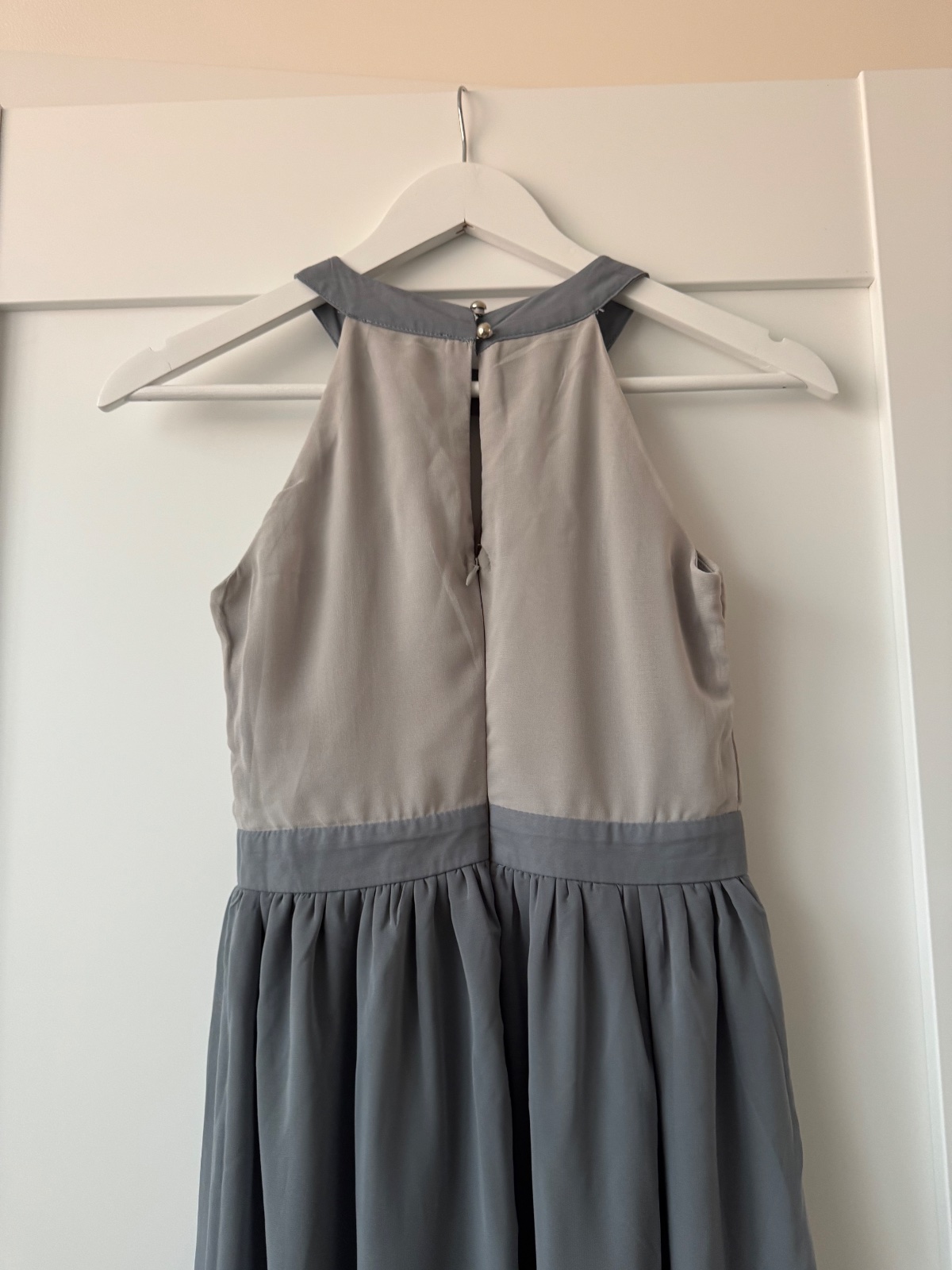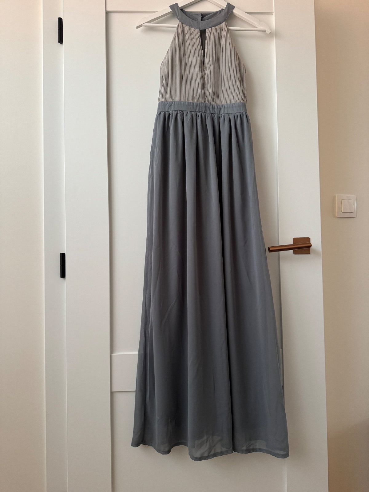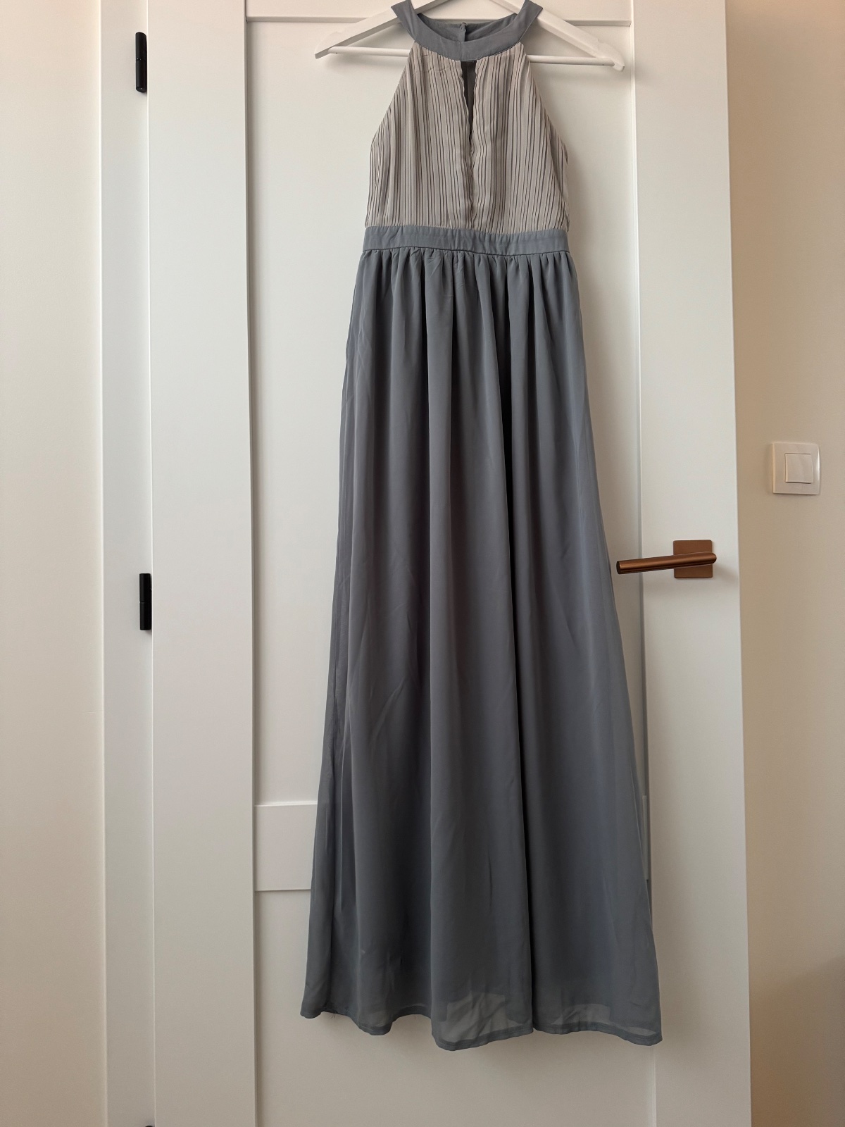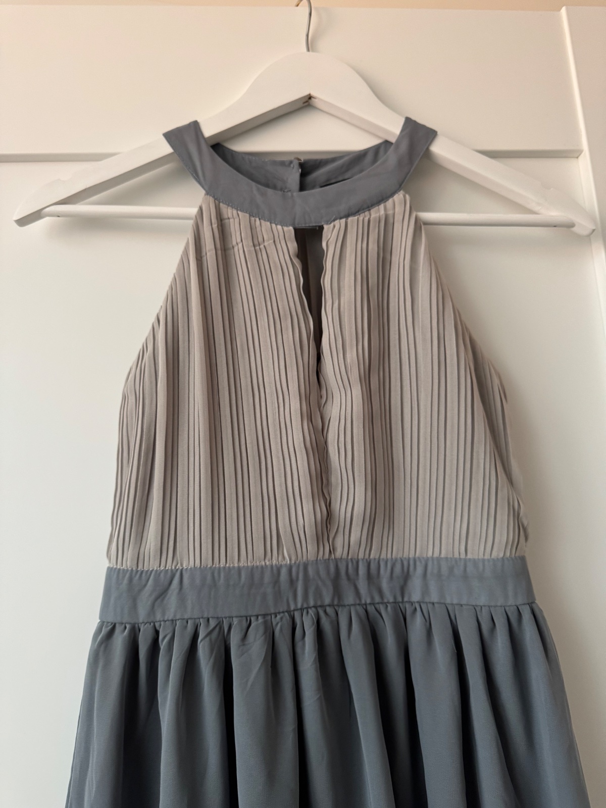 Je tam jedna nedokonalosť (viď posledné foto), zatiahli mi ich opatkom, ale je to opravene krajcirkou a nie je to viditeľne. Šaty su krasne strihane okolo krku a urcite este poslúžia - pre jednu nedokonalosť odpredavam za symbolickú cenu. Farby sivo/zelena. Značka Asos.