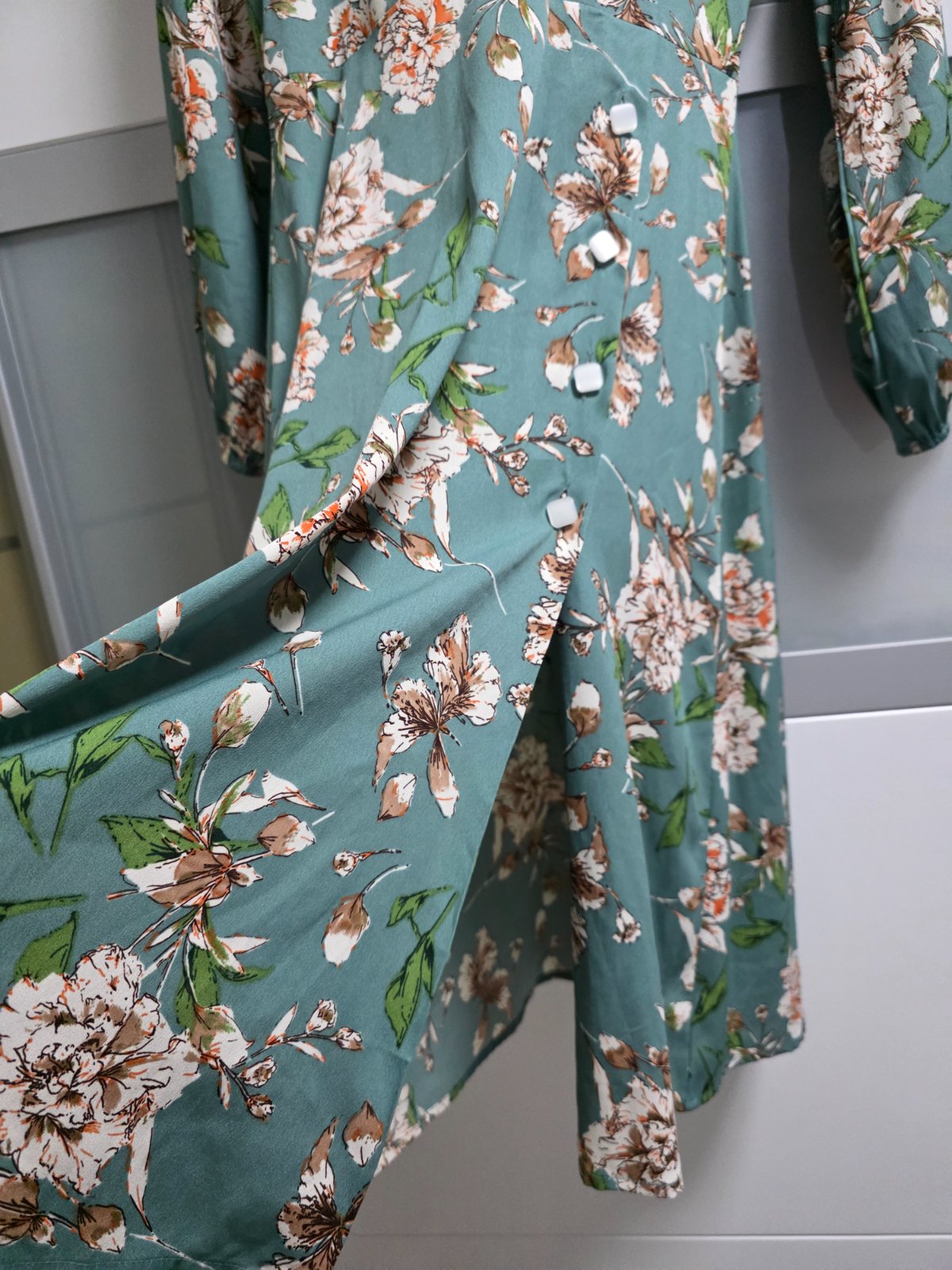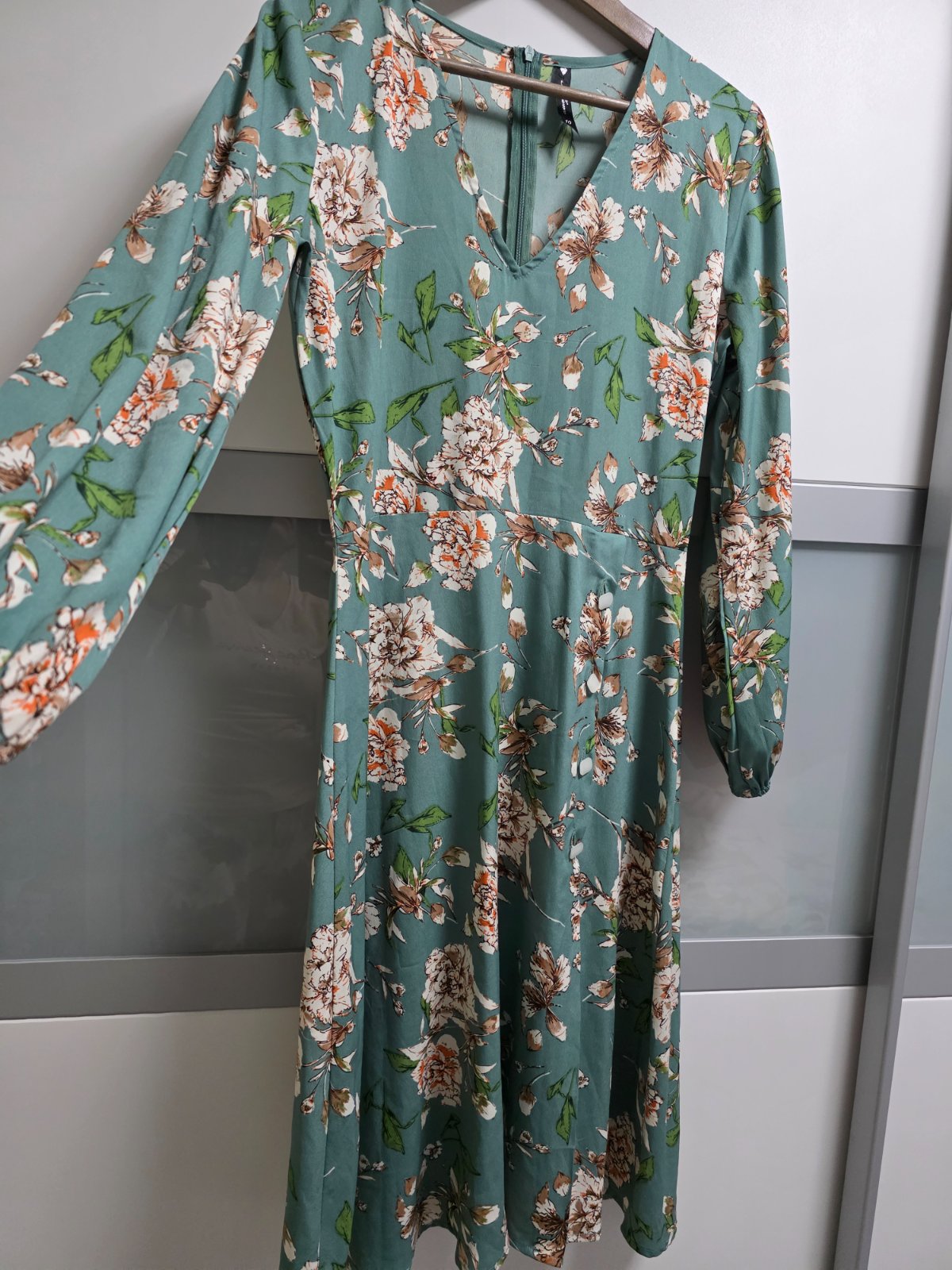 Kvalitna latka, jemne farby, vystrih do V, sukna aj rukávy mierne rozsirene do A, rozparok. Dlzka sukne 65 cm.