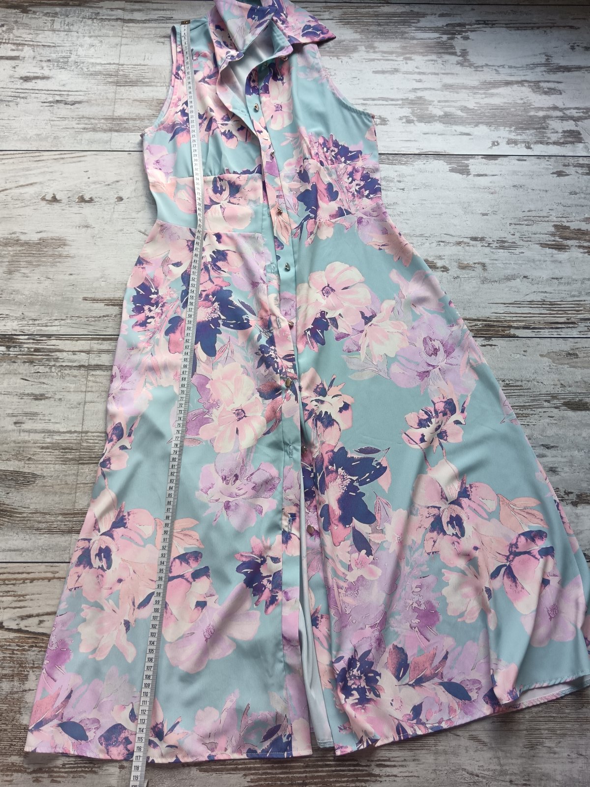 Strih: Dlhé šaty bez rukávov, elegantný košeľový golier, zapínanie vpredu na zlaté gombíky