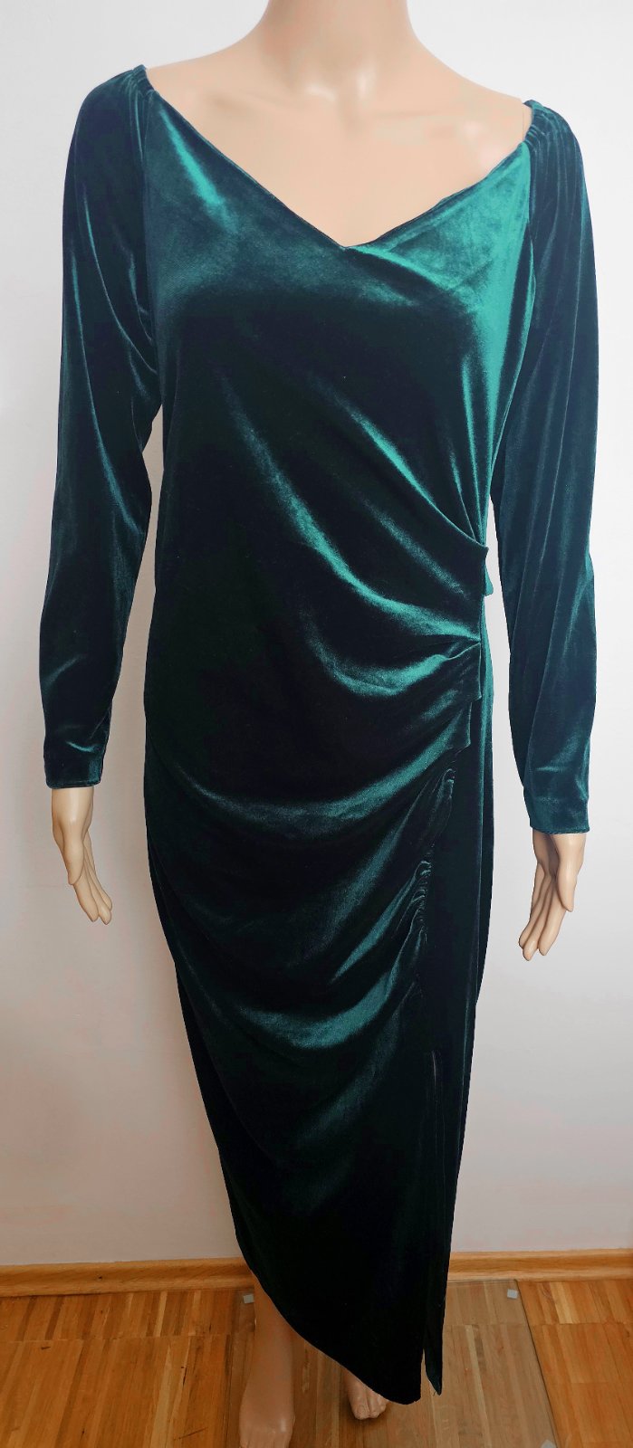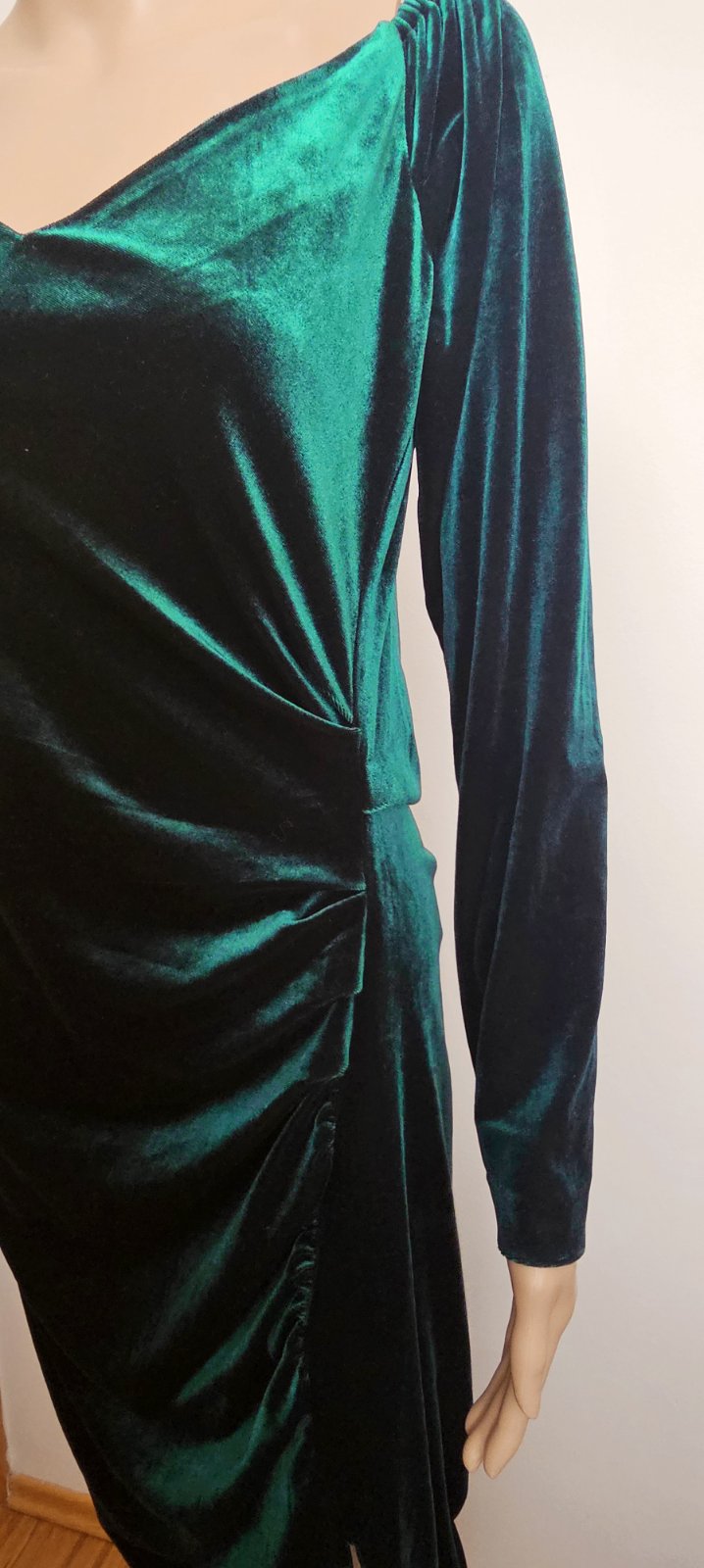 Nové. Dĺžka 129 cm, šírka v hrudníku v nenatiahnutom stave 52x2 cm. Materiál elastický a prispôsobí sa postave. Na boku riasenie s výstrihom.