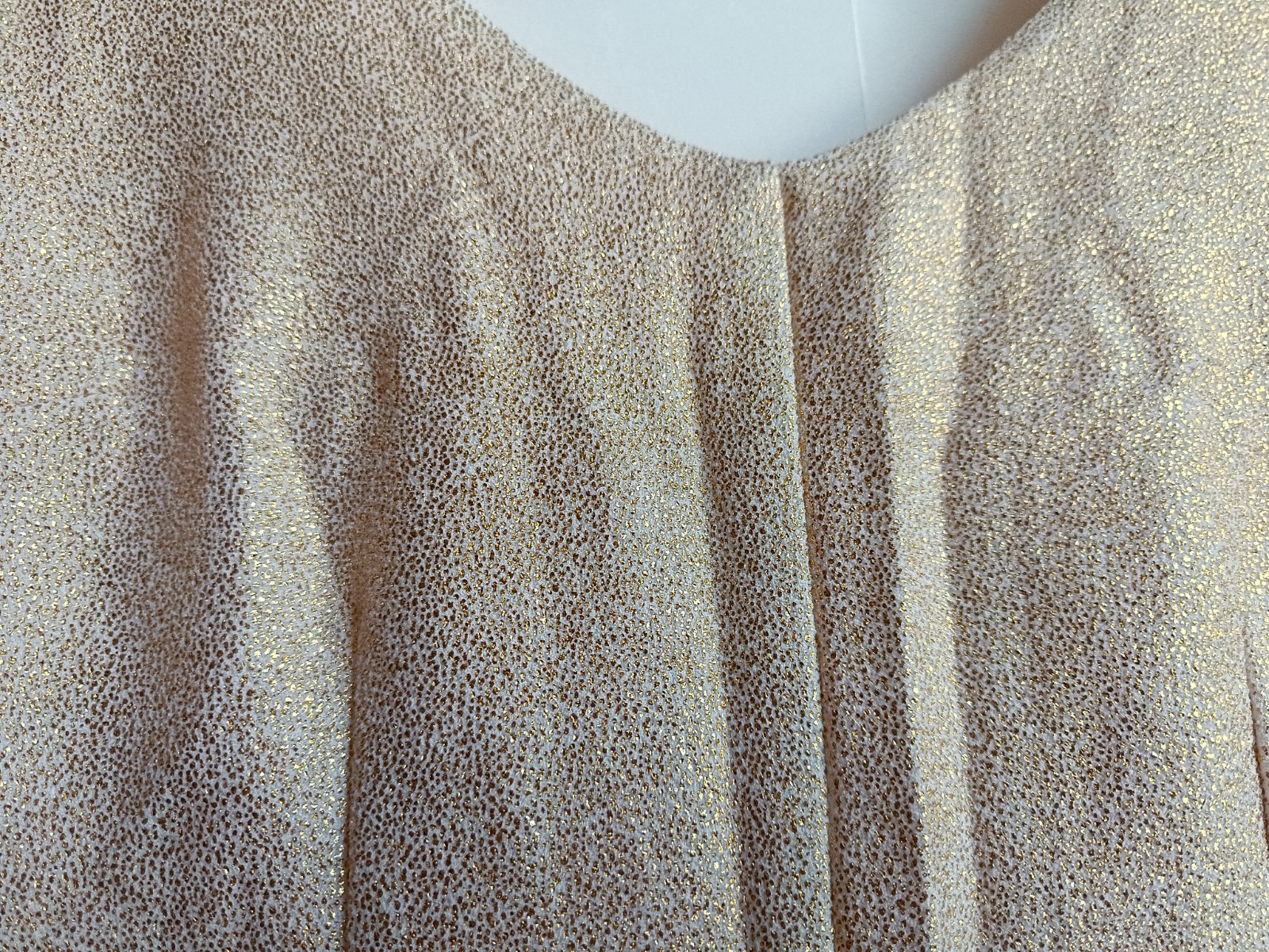 Jedinečné spoločenské šaty lesklej svetložltej až zlatistej farby, zaujímavého strihu s ozdobnými výšivkami a aplikáciami organzových listov. Látka je pokrčeného vzhľadu od výroby. Pri výstrihu bol...