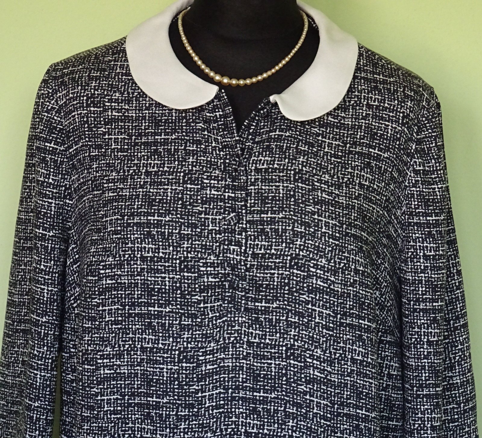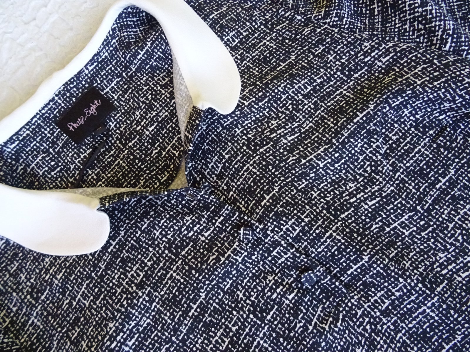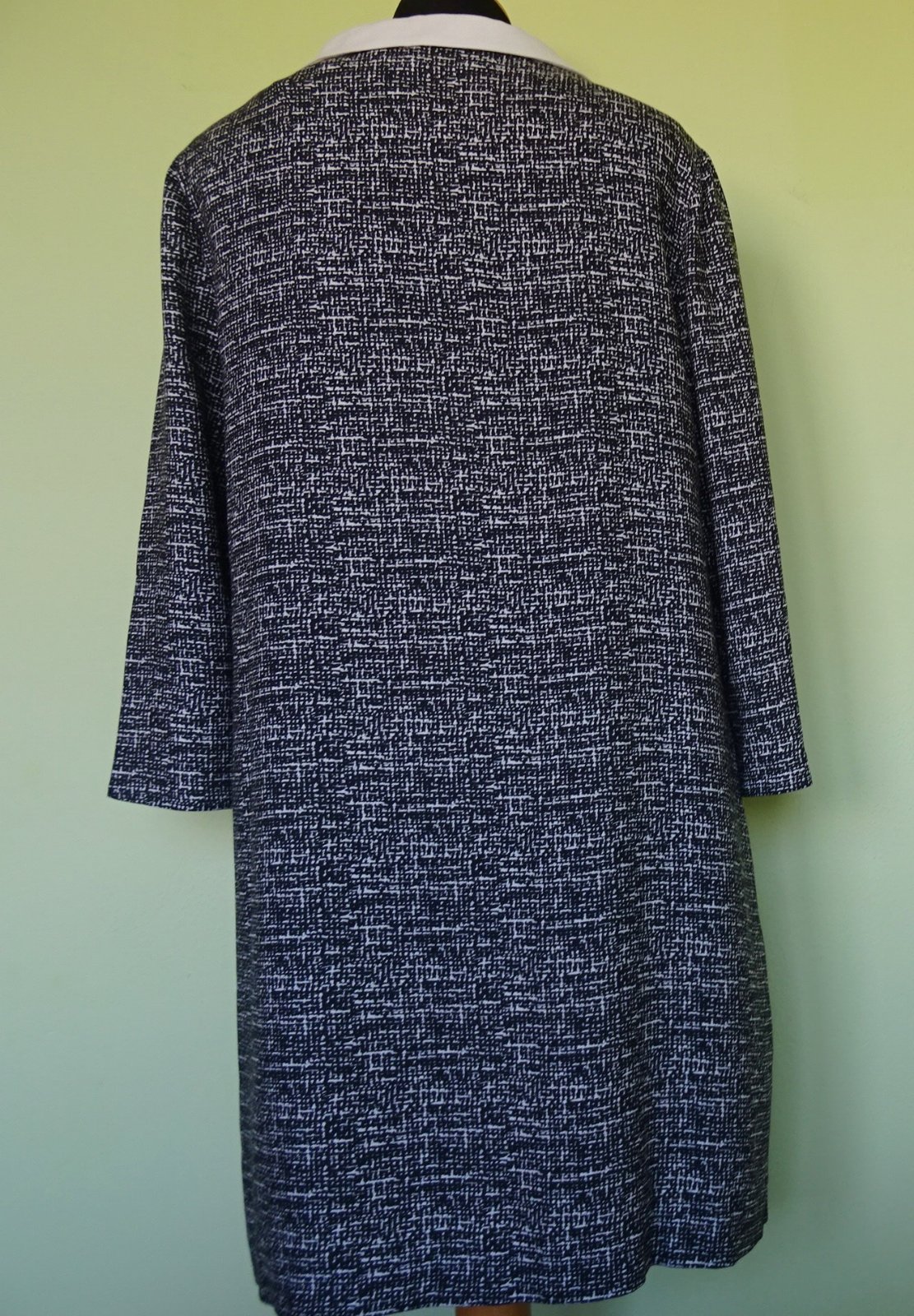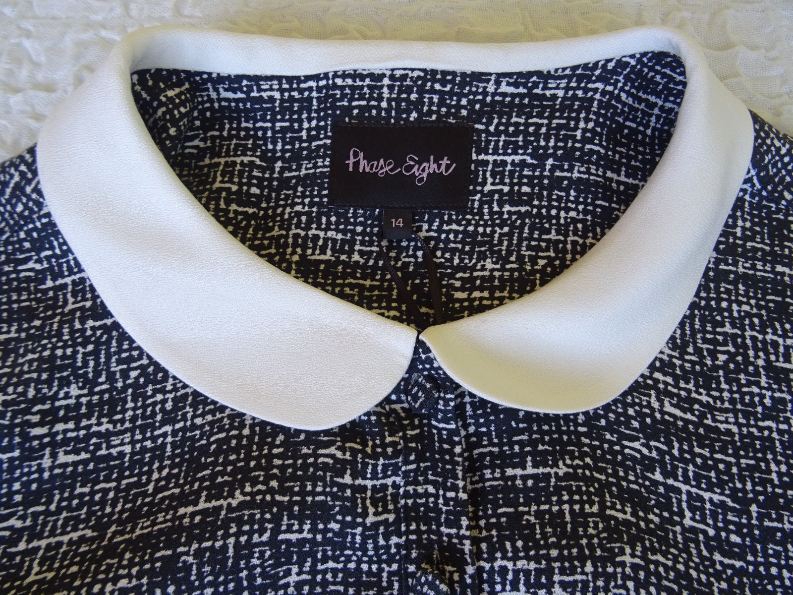 Elegantné dámske šaty značky Phase Eight, veľkosť L, rozmery: dĺžka šiat je 90cm, pod pazuchami 2x53cm, rukáv je 3/4 dlžky. Na čiernom podklade jemný biely vzor, biely golierik a rukávy sa dajú vyhnúť- podšité bielou. Šaty majú bočné vrecká.