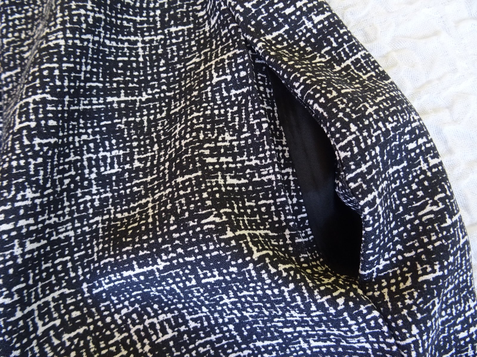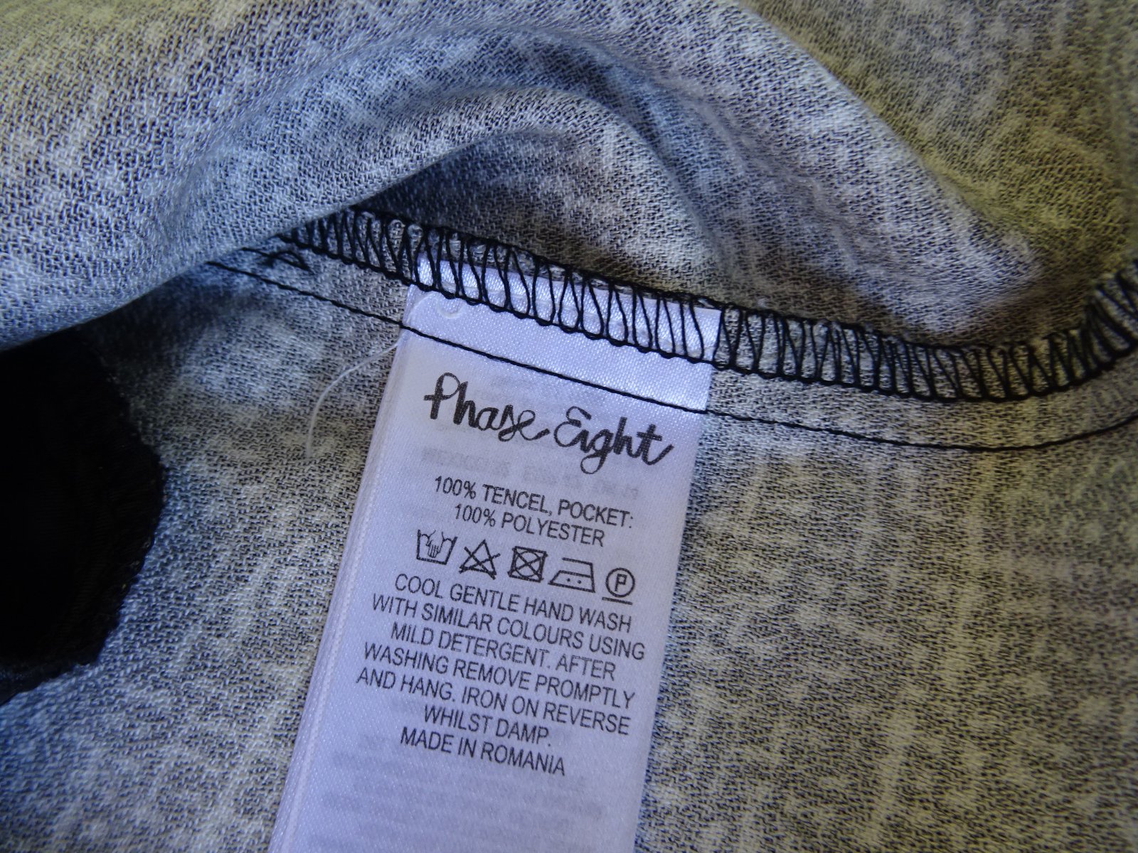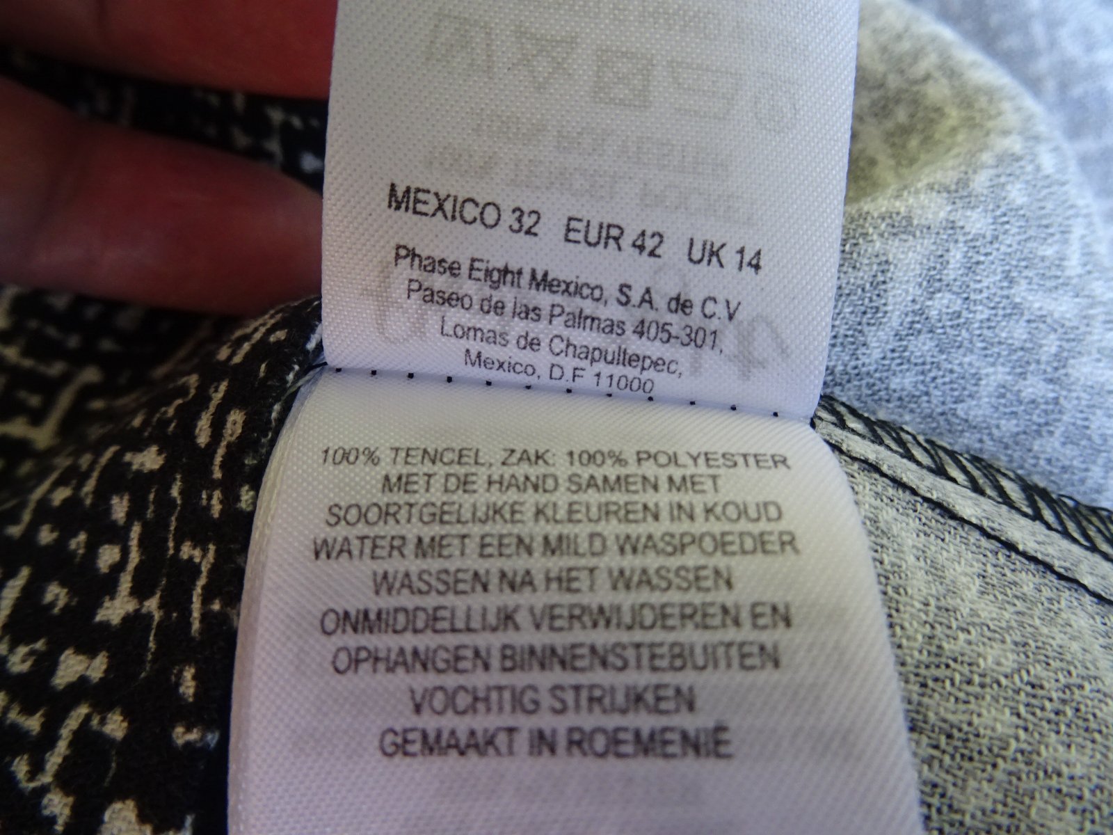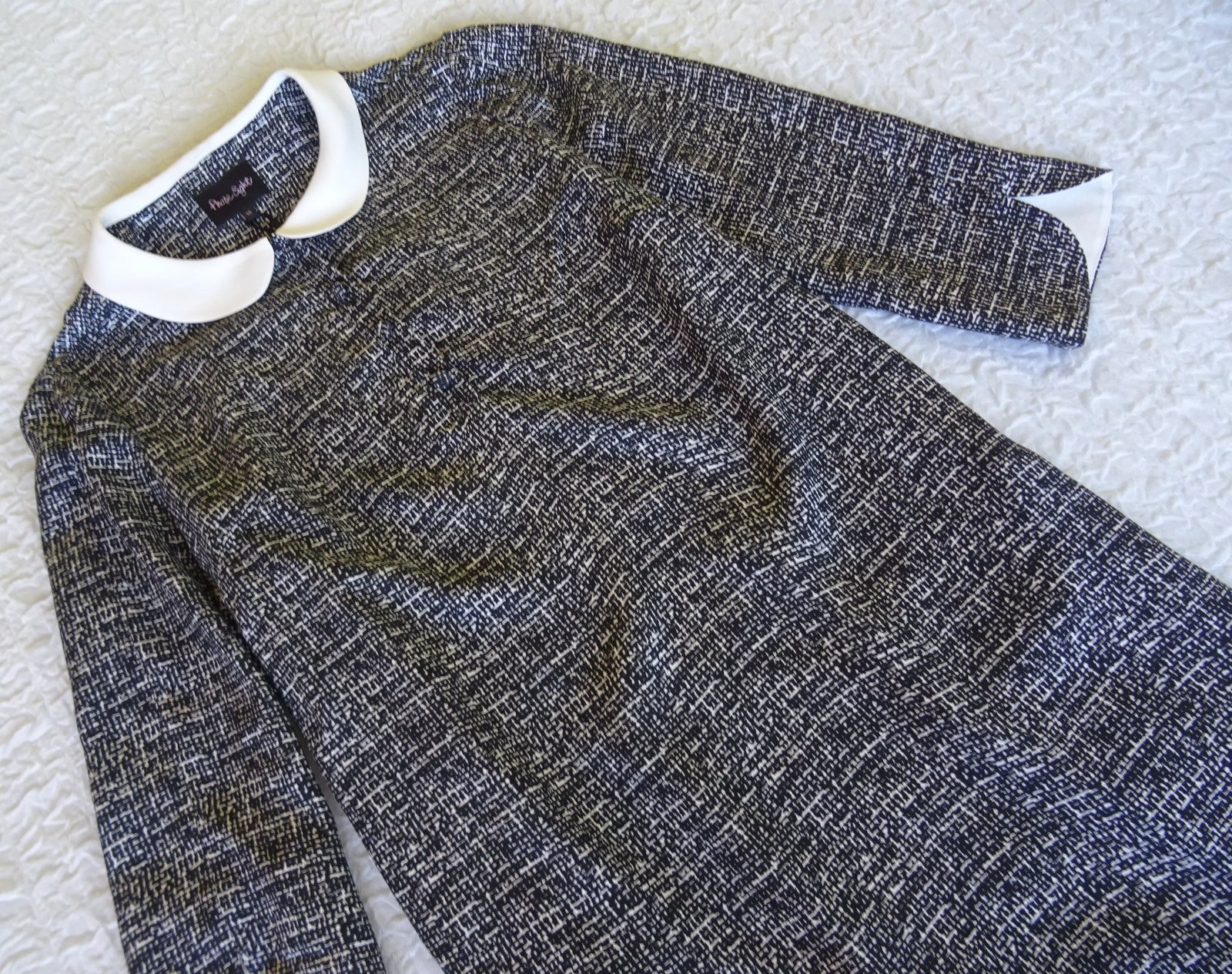 Elegantné dámske šaty značky Phase Eight, veľkosť L, rozmery: dĺžka šiat je 90cm, pod pazuchami 2x53cm, rukáv je 3/4 dlžky. Na čiernom podklade jemný biely vzor, biely golierik a rukávy sa dajú vyhnúť- podšité bielou. Šaty majú bočné vrecká.