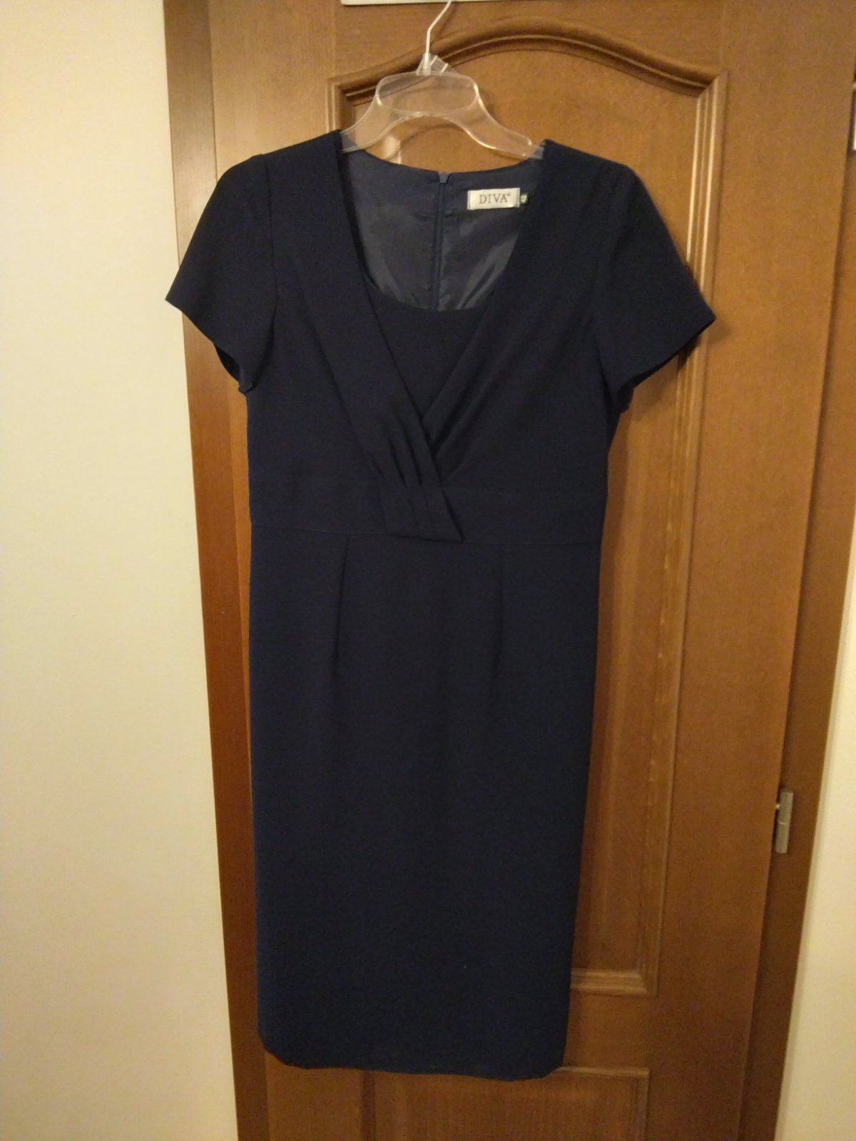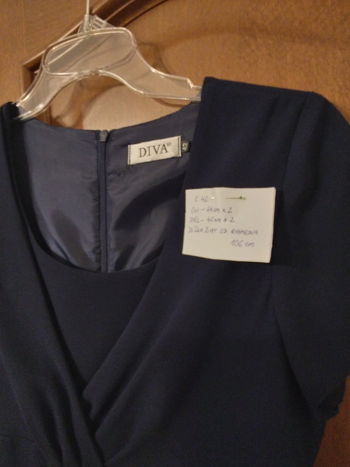 Raz oblečené bezchybné spoločenské šaty tmavomodrej farby Rozmery: Cez prsia 46,5 cm Pás 44 cm Dĺžka šiat 107 cm .....pri mojej výške 166 cm sú mi presne pod kolená....látka nie je naťahovacia, t...