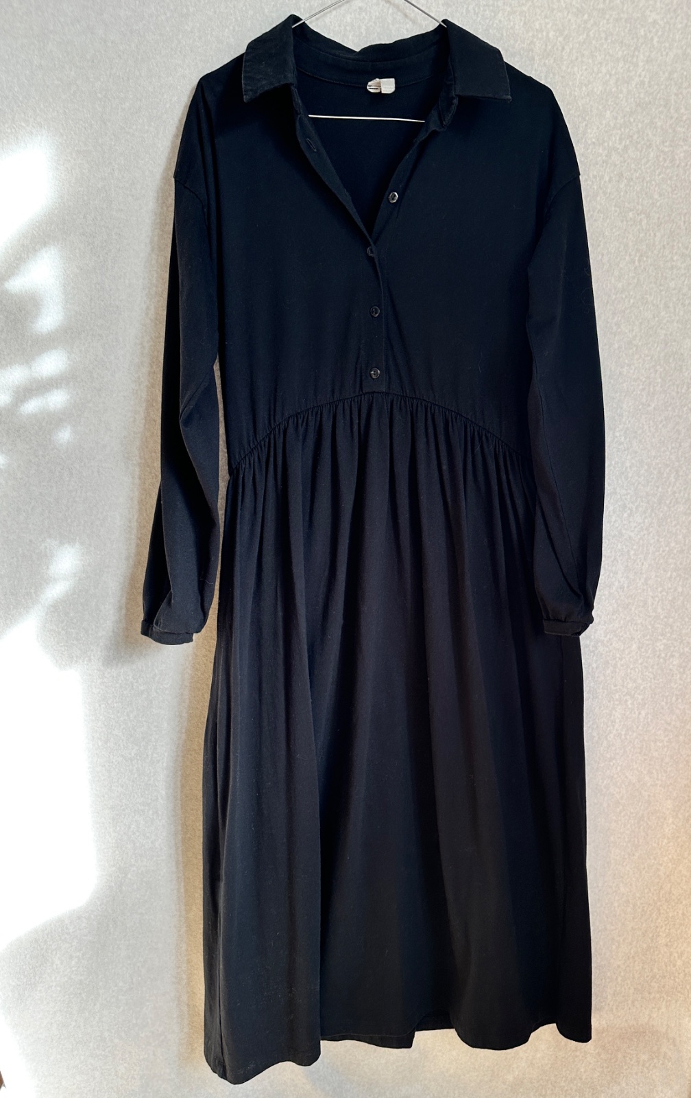 Čierne šaty košeľové strihu s prestrihnutým pásom a nariasenou sukňou. Materiál je bavlnený úplet (100% bavlna). Rukávy sú nariasené do úzkeho prúžku (patentu). V super stave, bez poškodení. Na fotkách farba pôsobí akoby bola miestami vyblednutá. V skutočnosti je rovnomerná a sýta čierna. Značka ASOS.