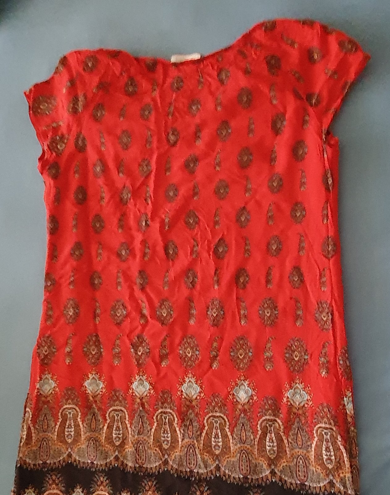 Ľahké letne šatky, dvojvrstvové. Červená pružná podšívka, vrchné šaty indického vzoru so šnúrkou na uviazanie (farba tmavšia ako na fotke, tmavá červená). Veľmi príjemná viskóza. Veľkosť písaná S, ale ja nosím M a zmestila som sa. Nosené len na dovolenke.