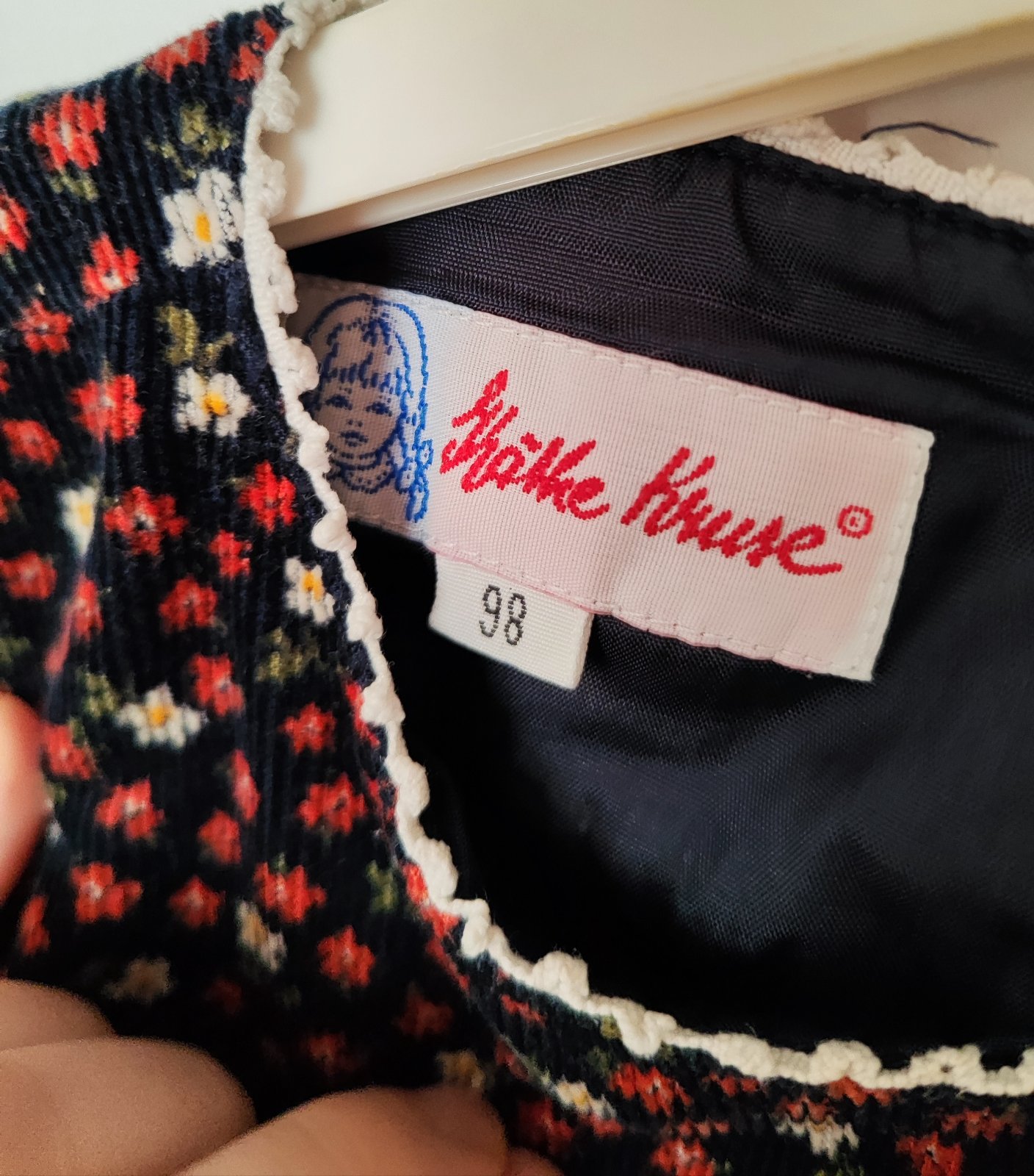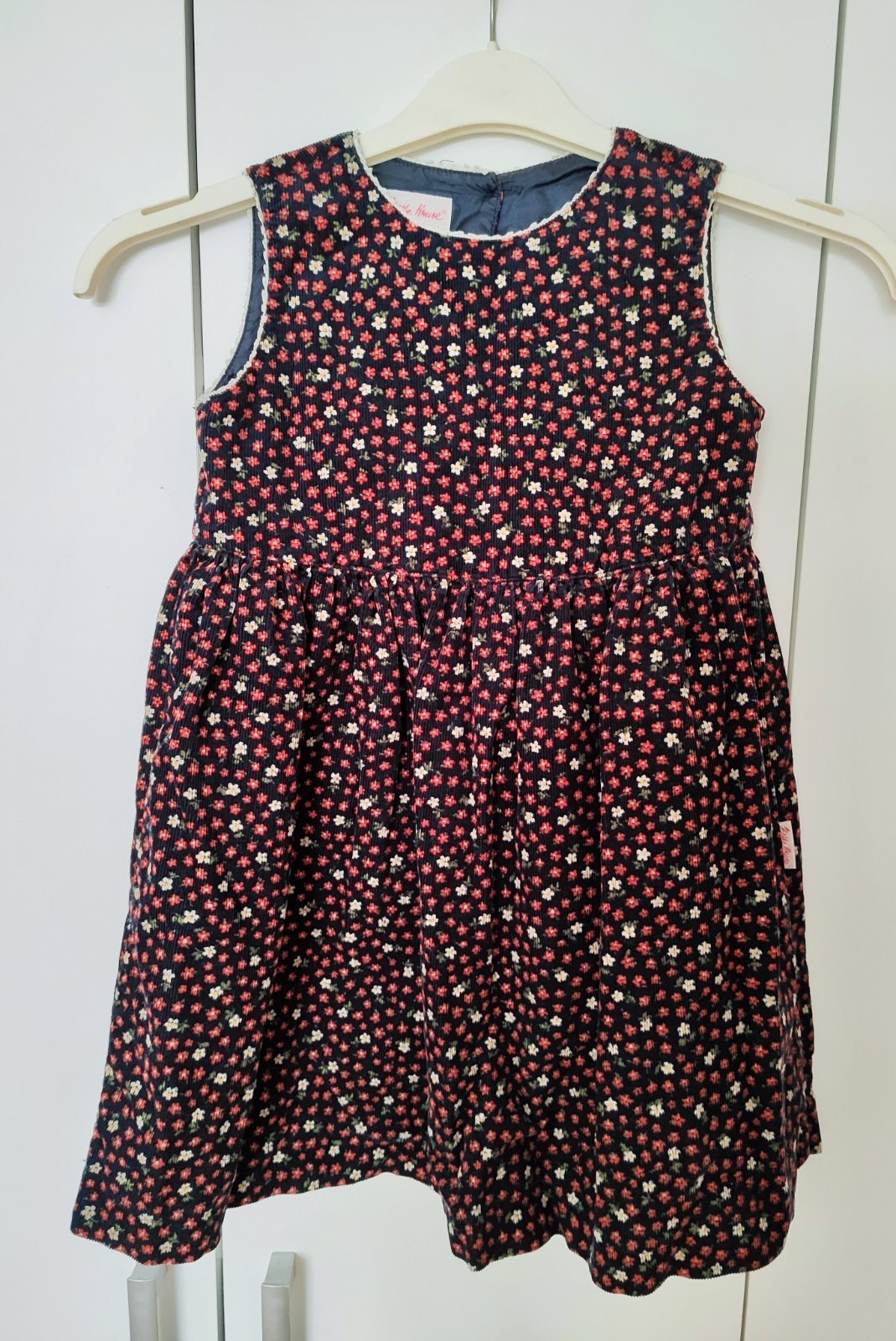 Slávnostné šatočky s plastickým vzorom a s ozdobnou brošničkou. Tmavomodrá farba, hrubšia látka, zn.Original Marines. Veľ.na štítku 4, mala by zodpovedať veku 3-4r a teda veľkosti 98-104, my sme ic...