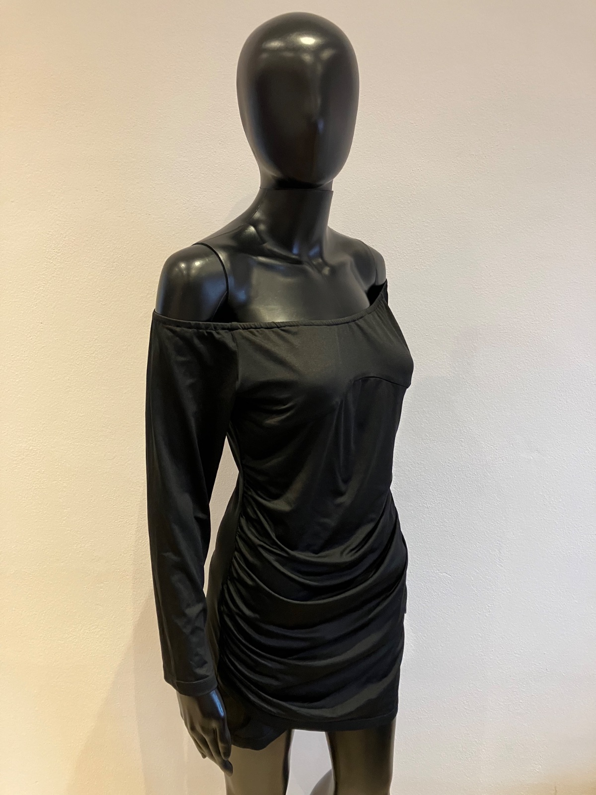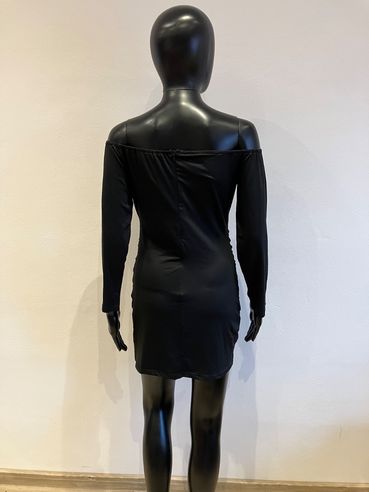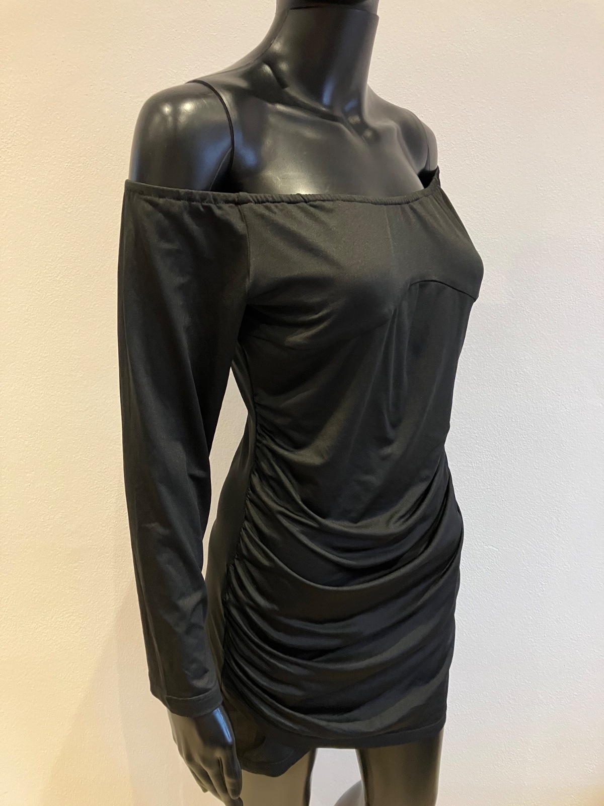 Dámske čierne kokteilové šaty s lodičkovým výstrihom, zariasené na boku, zapínanie vzadu na zips, veľmi tenké, elastické, výstrih na gumu, materiál 95% polyester,5%spandex.