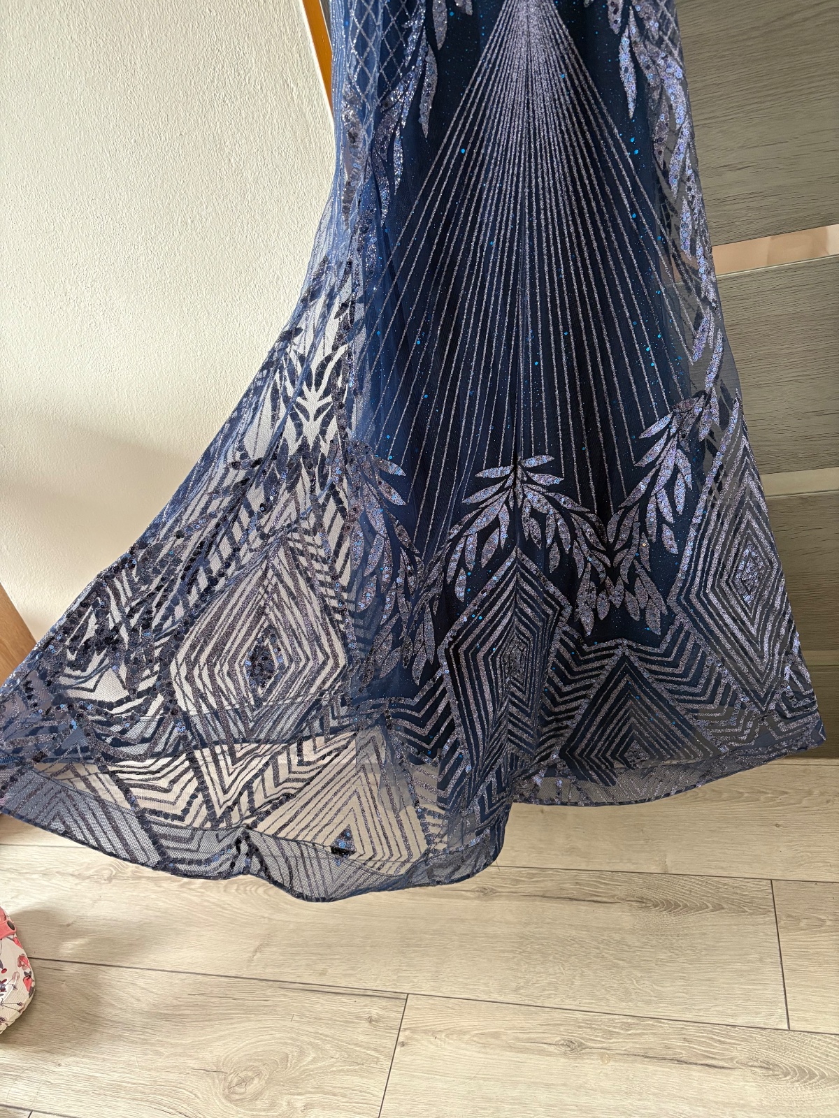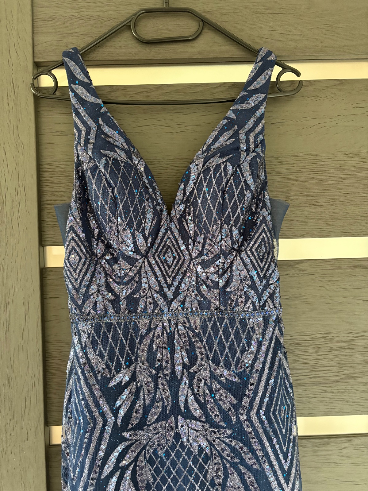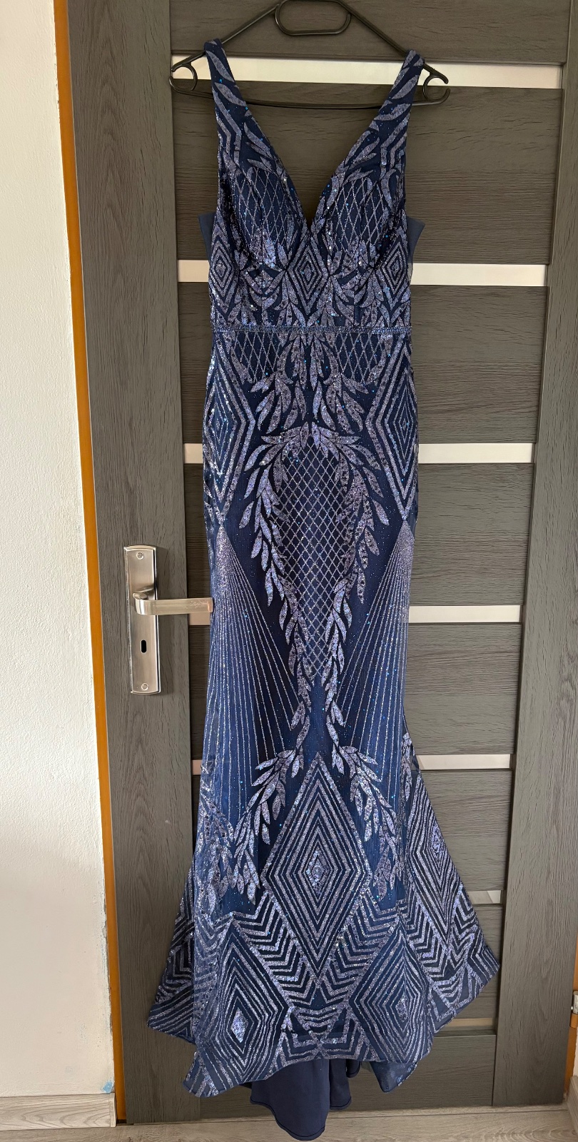 Elegantné večerné šaty, zdobené jemnými flitrami. Rybí strih krásne zvýrazňuje siluetu, pás je na šatách vykamienkovaný. Sú vhodné na XS až XXs
