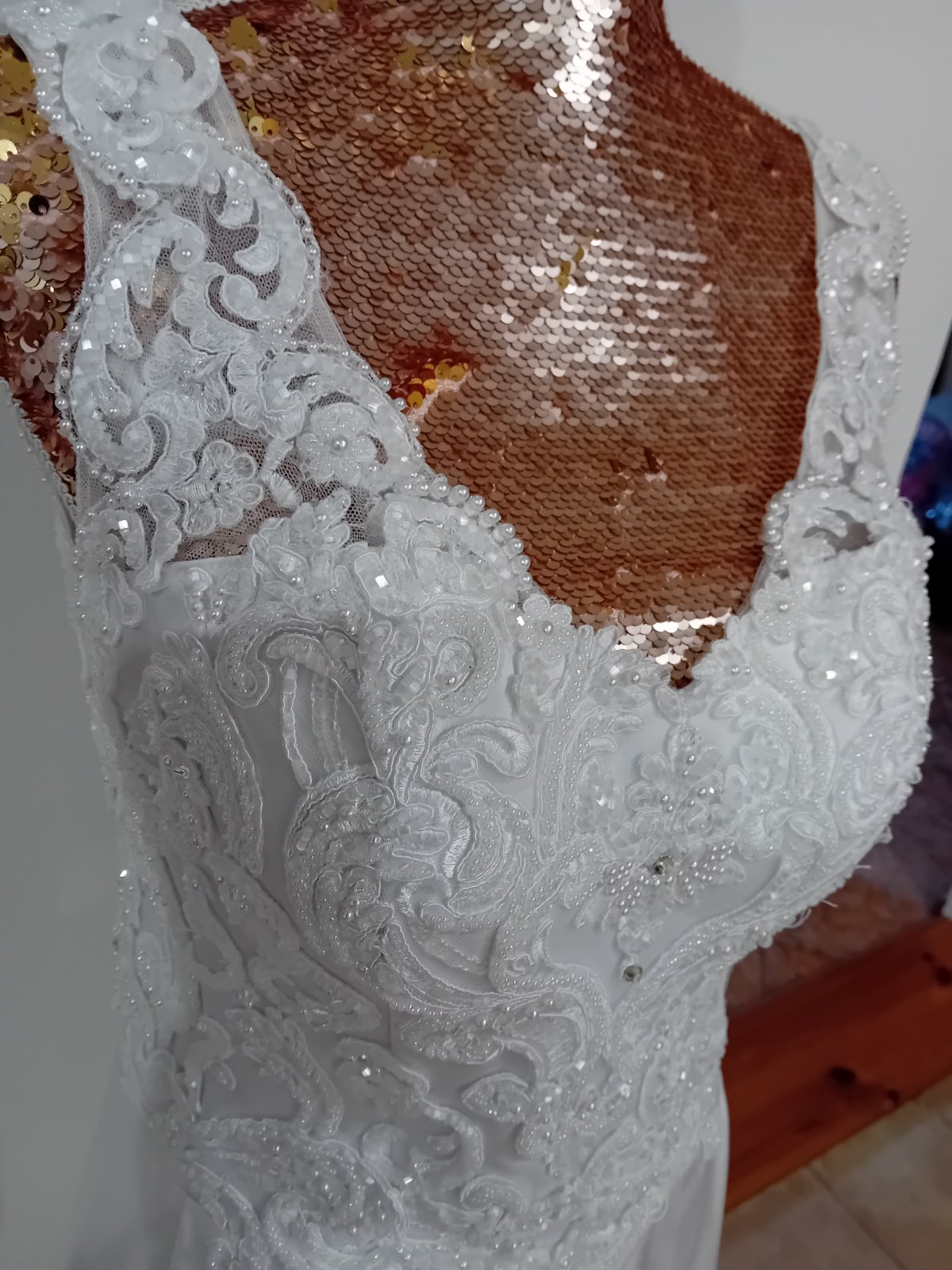 Svadobné bohato zdobené šaty vo veľkosti XS/S/M /sú na viazanie, vďaka čomu si ich prispôsobíte presne na Vašu postavu. Pod šaty nie je nutná spodnica, sú bohato riasené.