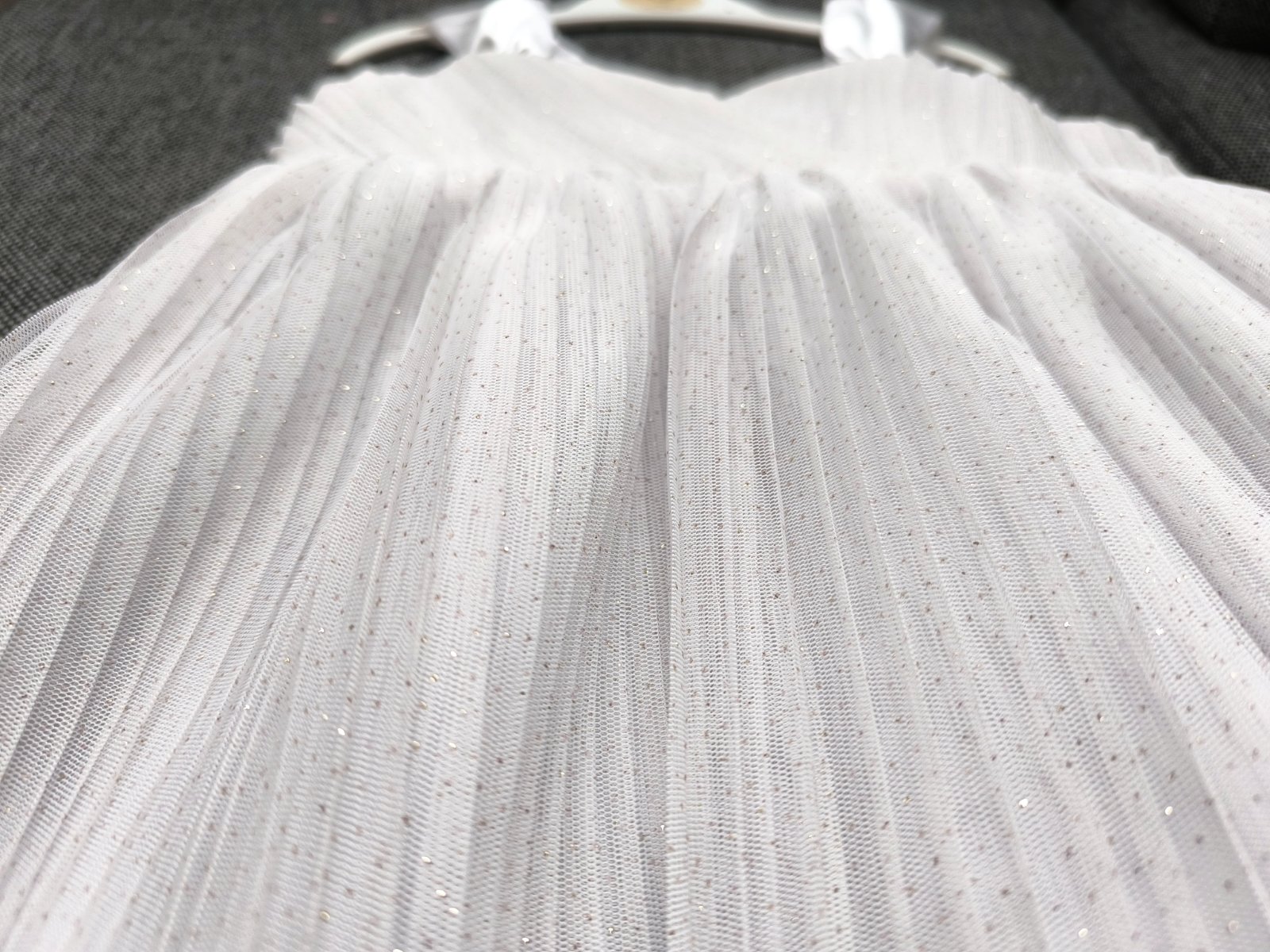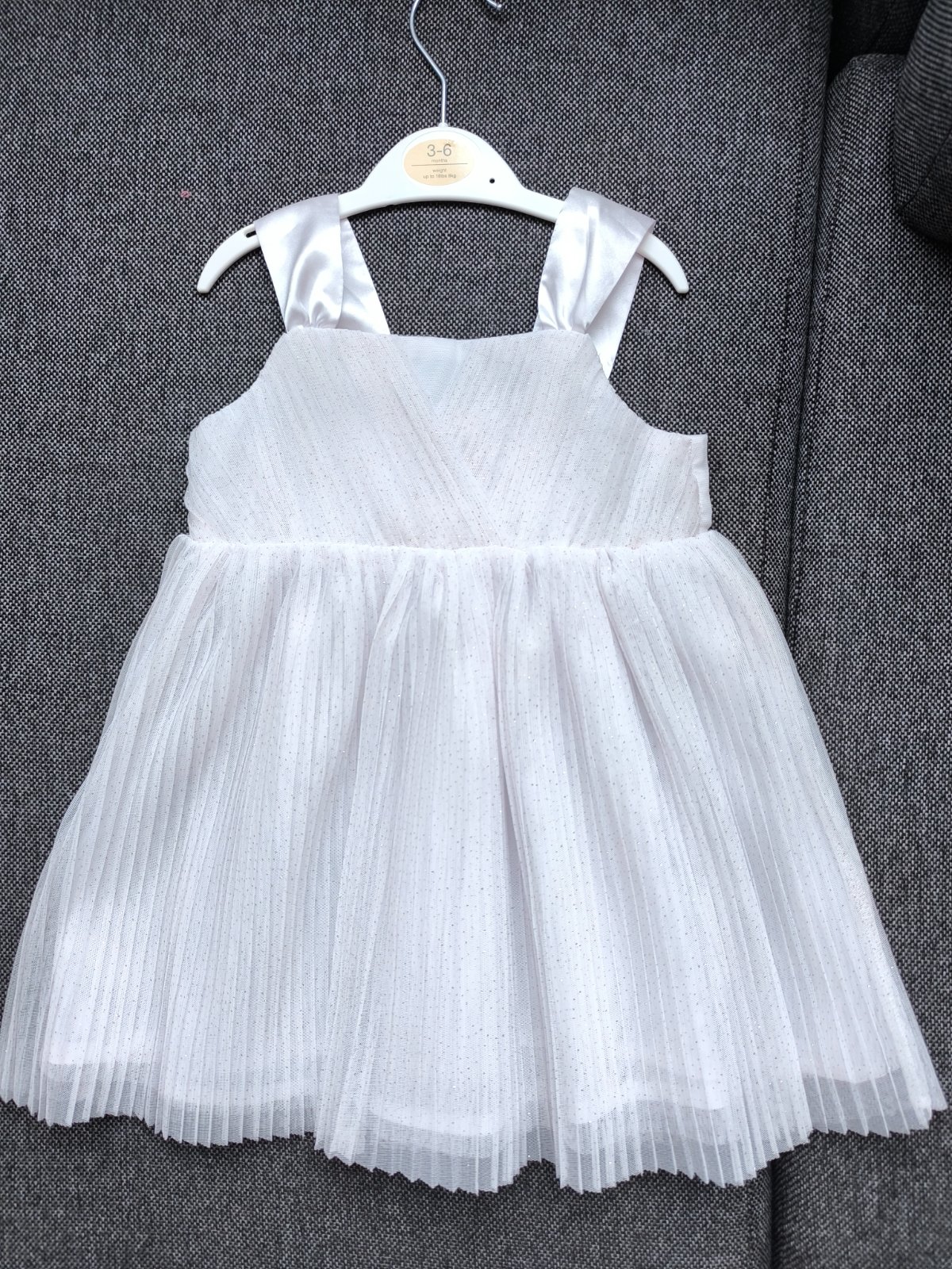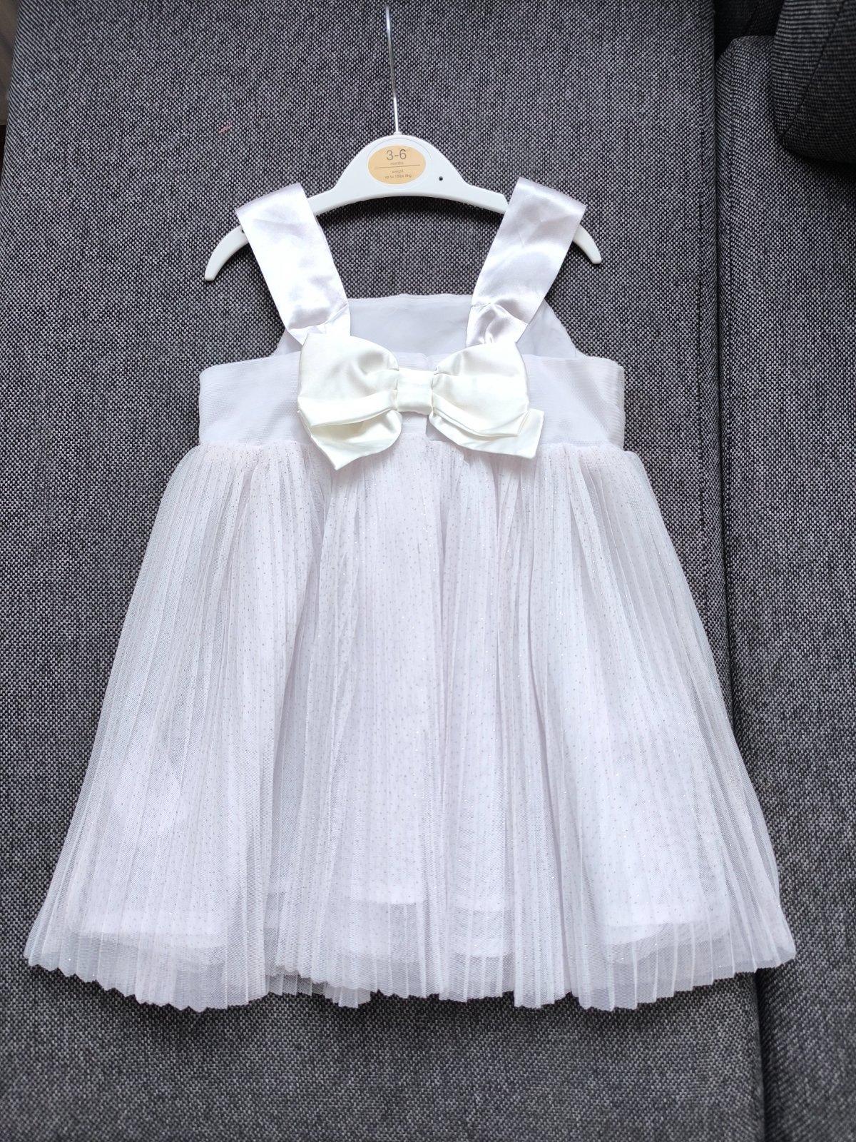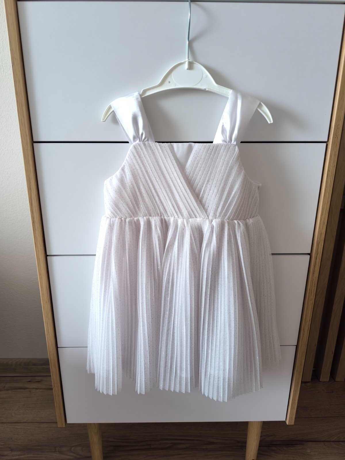 Šaty boli oblečené raz na svadbe a raz na fotenie, bez poškodenia, značka H&M, veľkosť 86, ale pokiaľ ich nechcete dlhé, môžu byť aj na 92, možno aj 98.