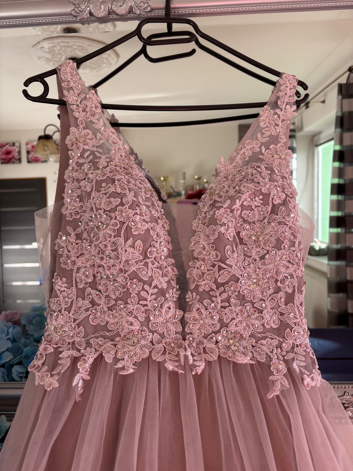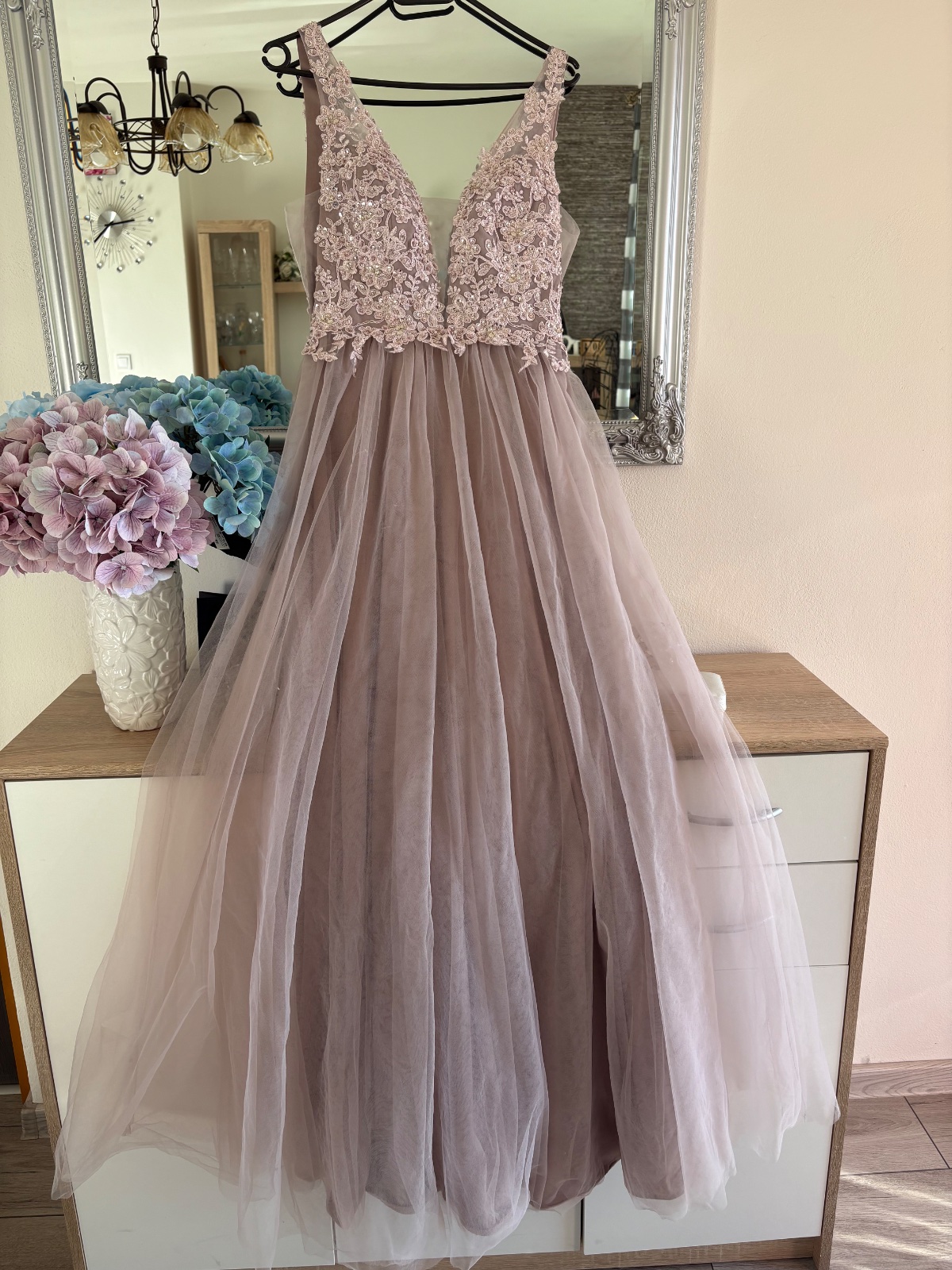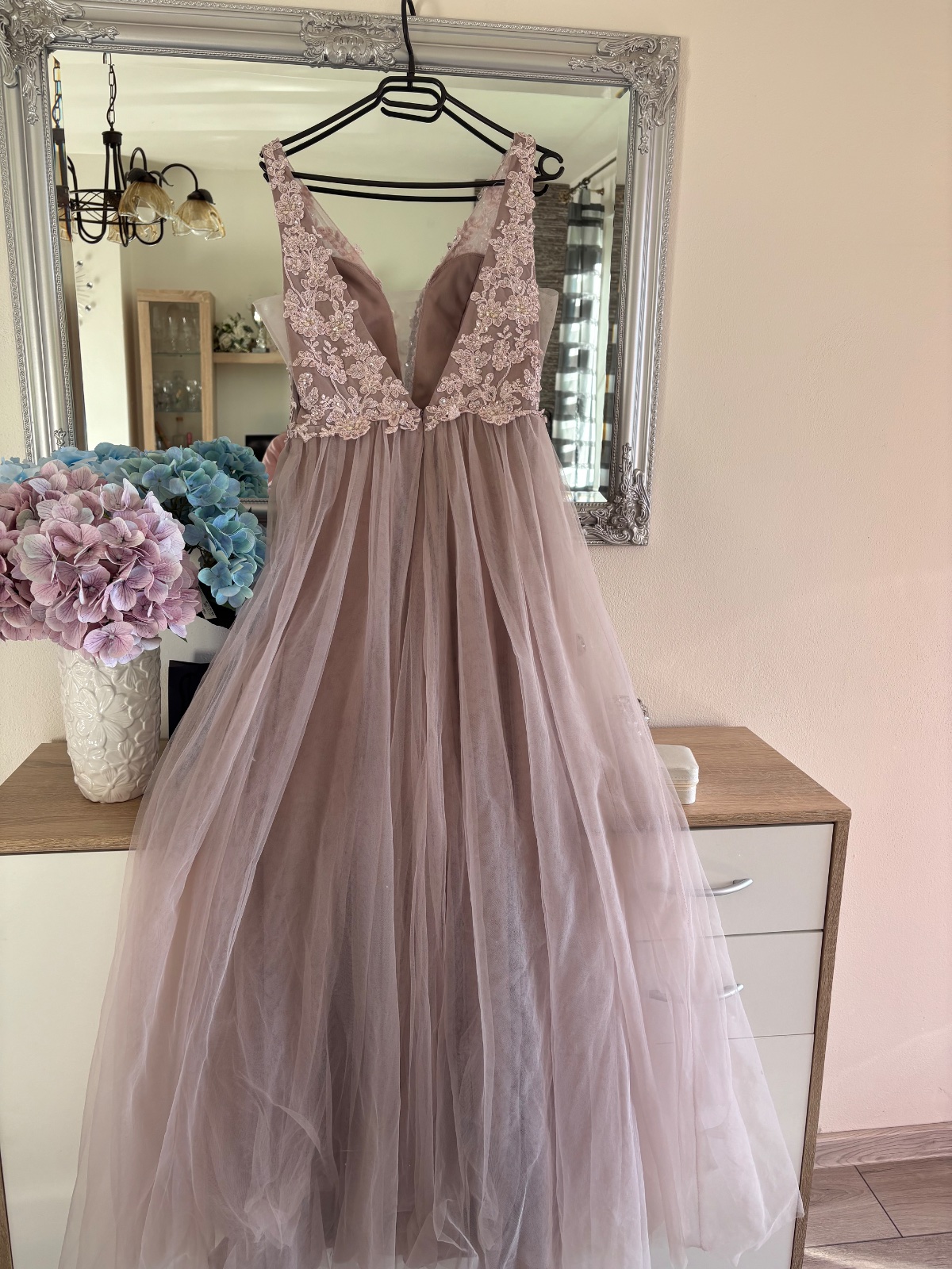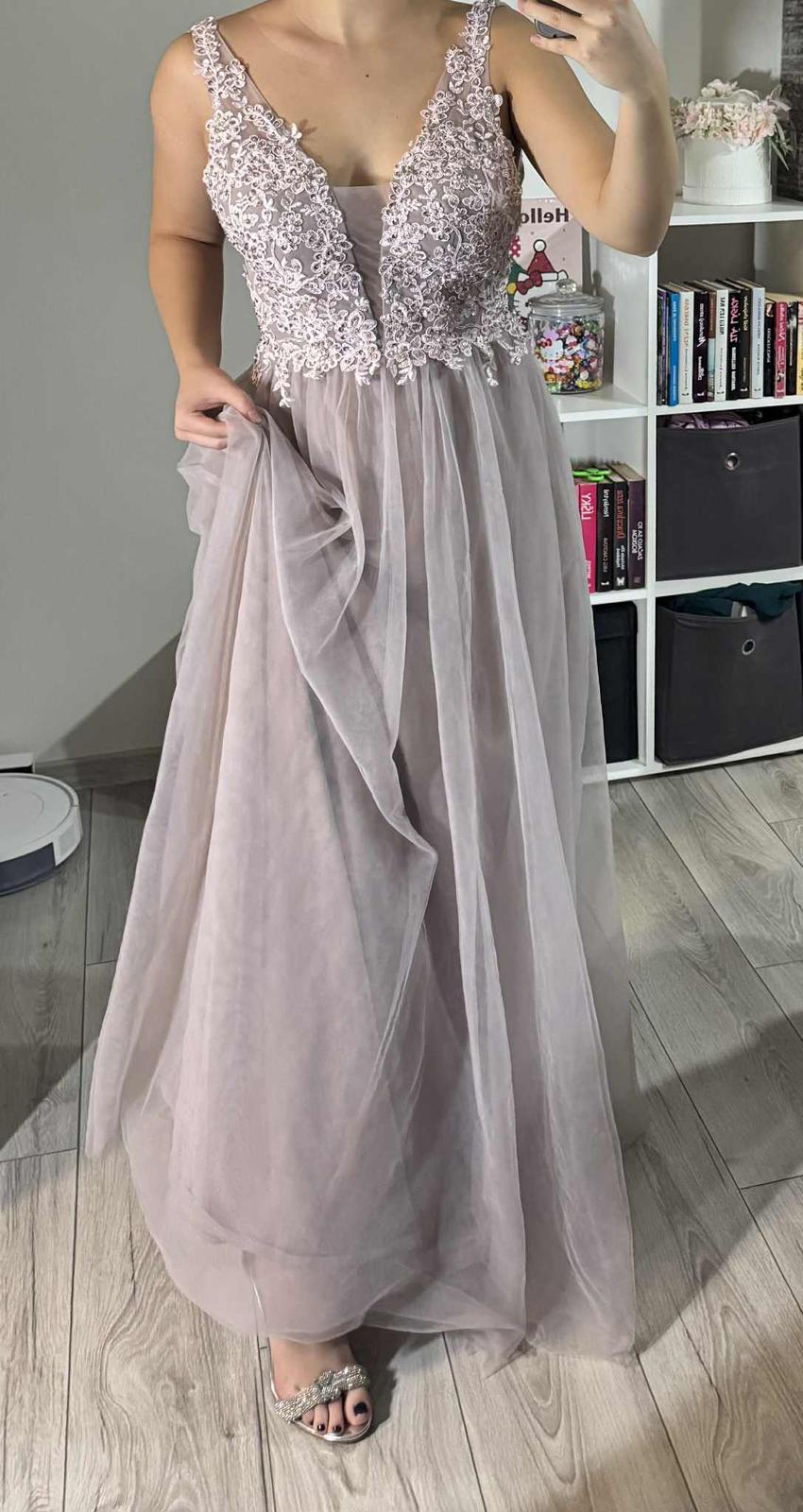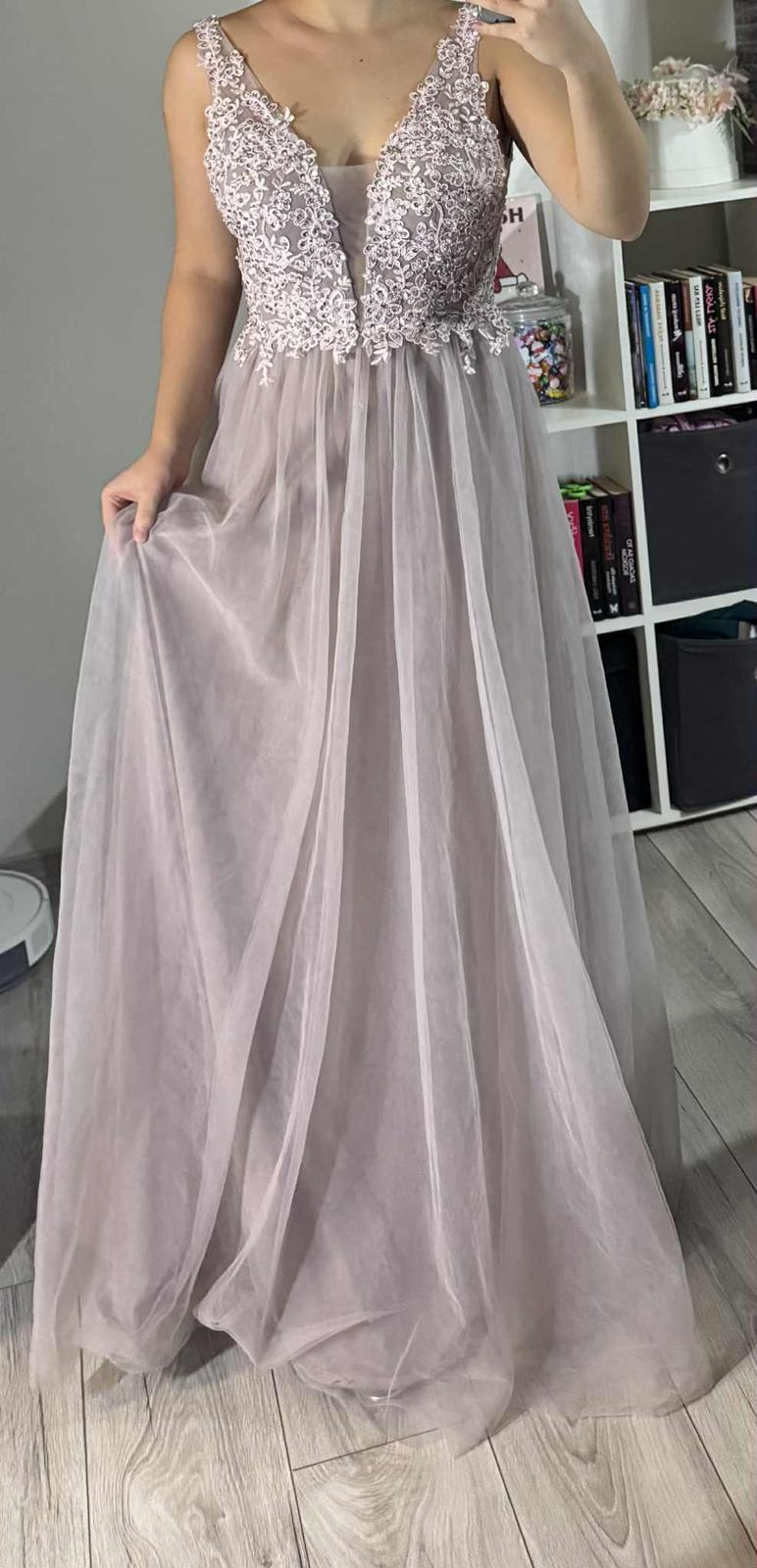 Krásne dlhé šaty večer s tylovým spodkom a vrchom zdobeným nádhernou výšivkou a ozdobami v podobe trblietavých kryštálov. Krásne odhaľuje ženské tvary. Šaty krásne odhaľujú chrbát - výstrih v tvare V. Šaty snov maxi dĺžka s odhalenými ramenami a zdobeným topom. Šitie dáva úžasný efekt. Výstrih do V. Zúžená v páse dokonale zvýrazní pás. Zadná strana je úžasne strihaná, v tvare písmena V. Šaty sú vyrobené z niekoľkých vrstiev svetlého tylu. Vpredu má všité košíčky, takže nemusíte nosiť podprsenku. Šaty sú dokonalé pre každú princeznú.