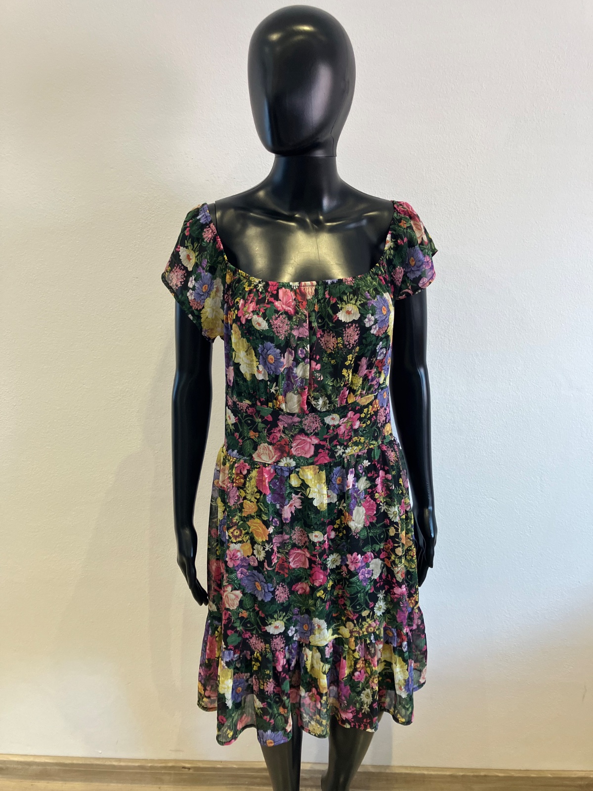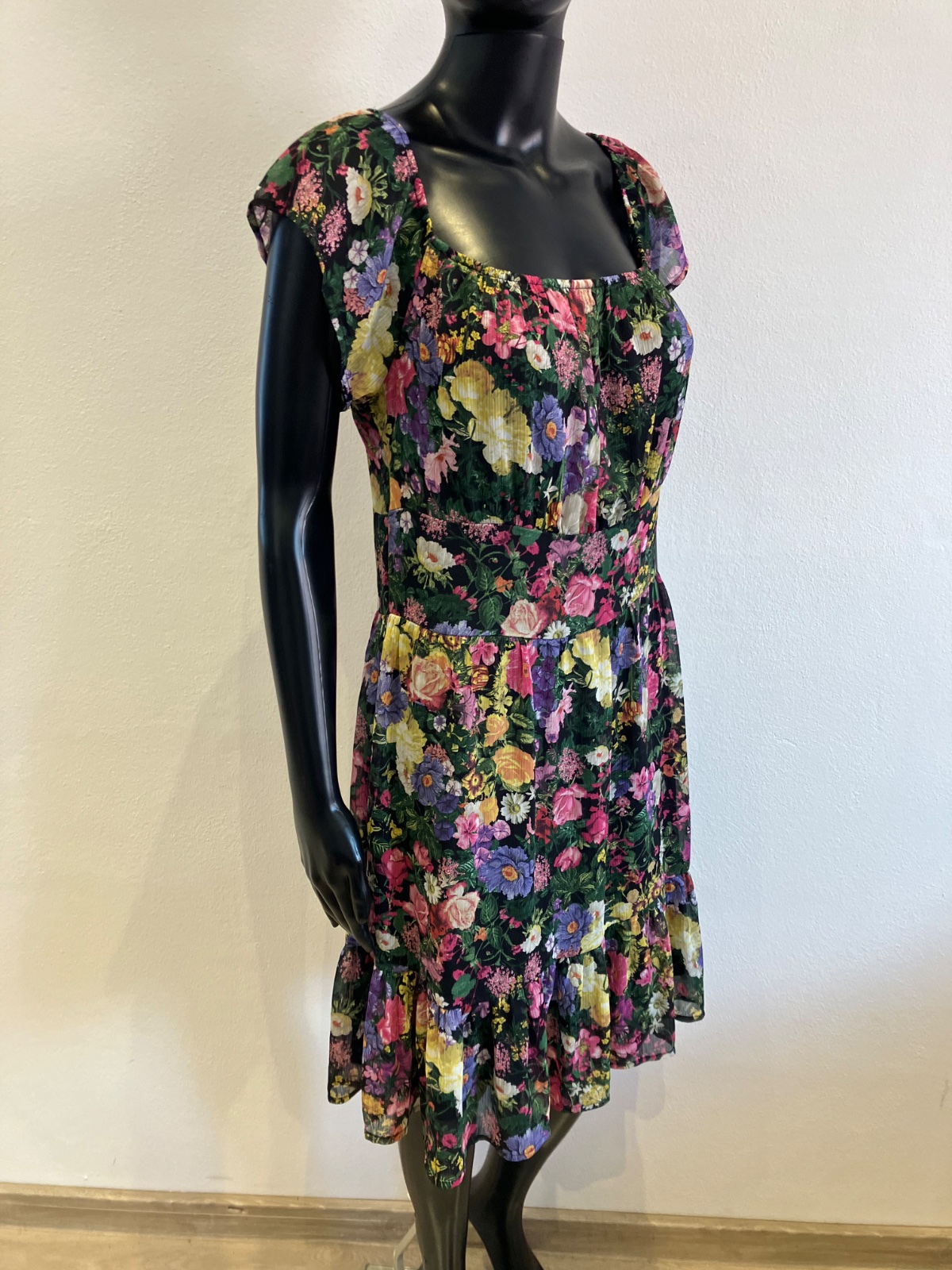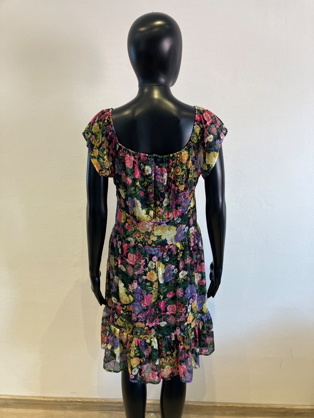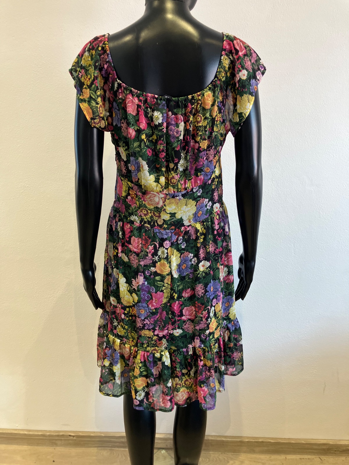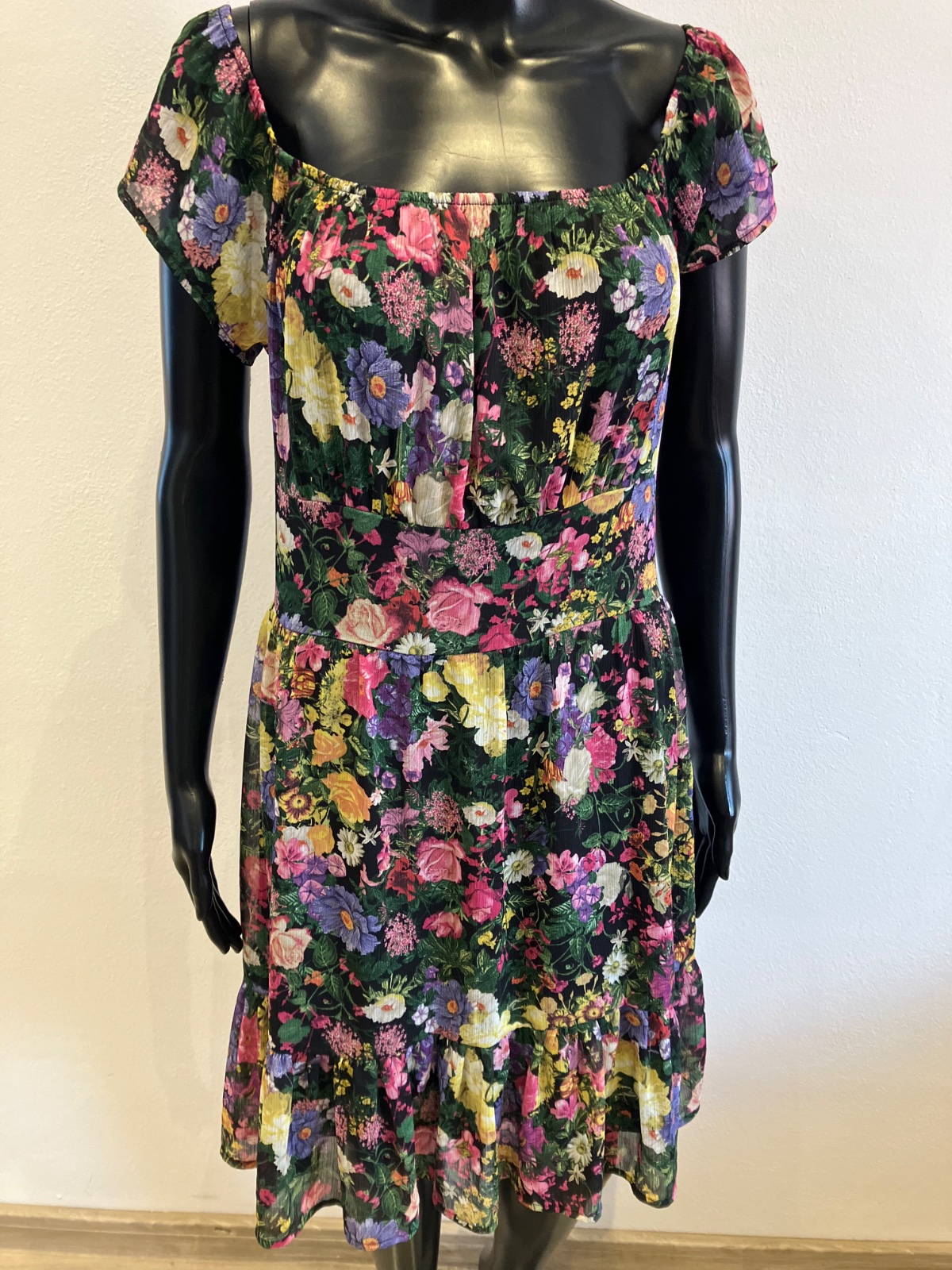 Dámske šaty s krátkym rukávom, kvetované, s volánmi na spodku, účkový výstrih, zapínanie na boku na zips, farba čierno-žlto-zeleno-ružová. Sú malo elastické. Veľkosť cca M.