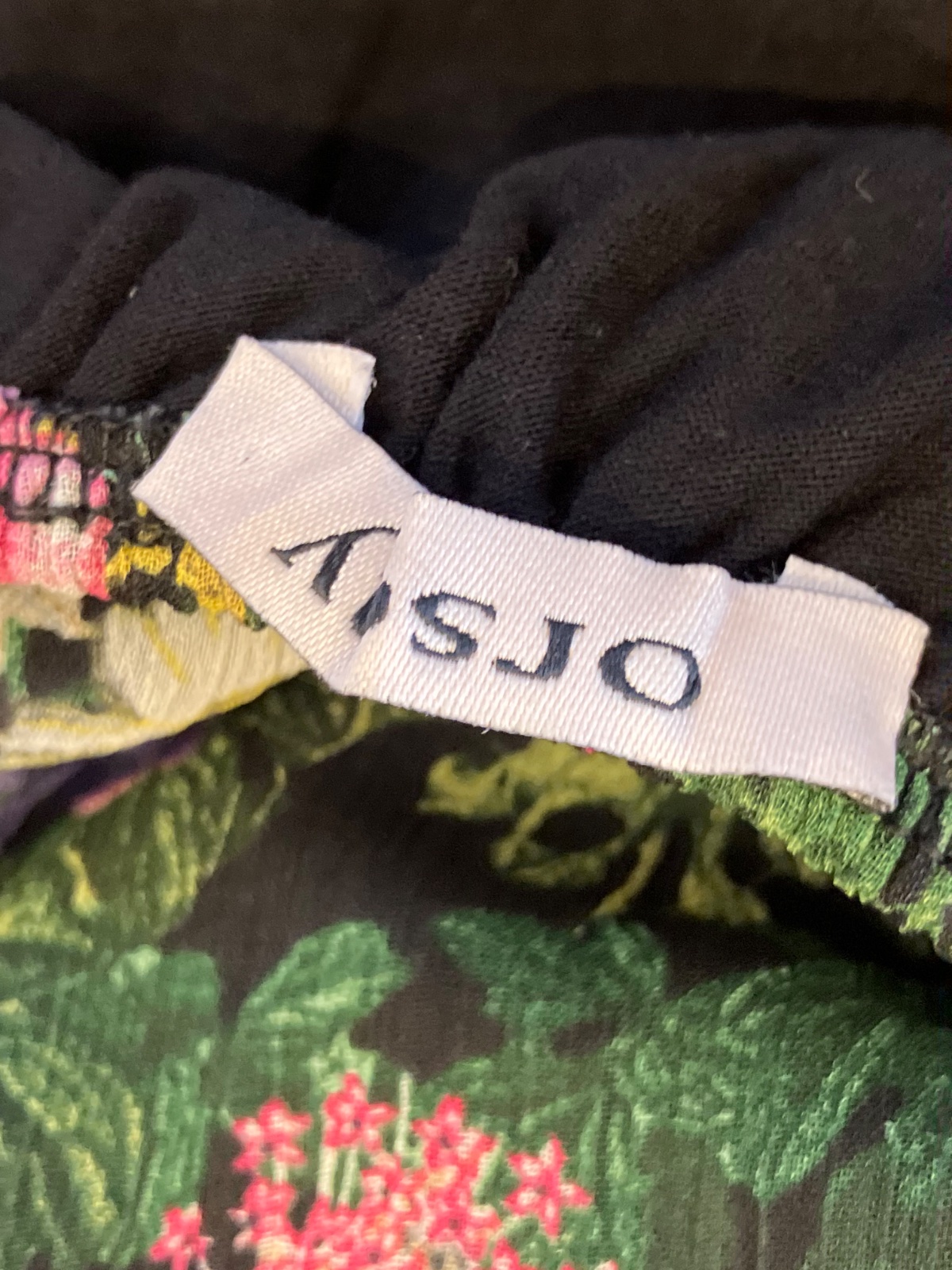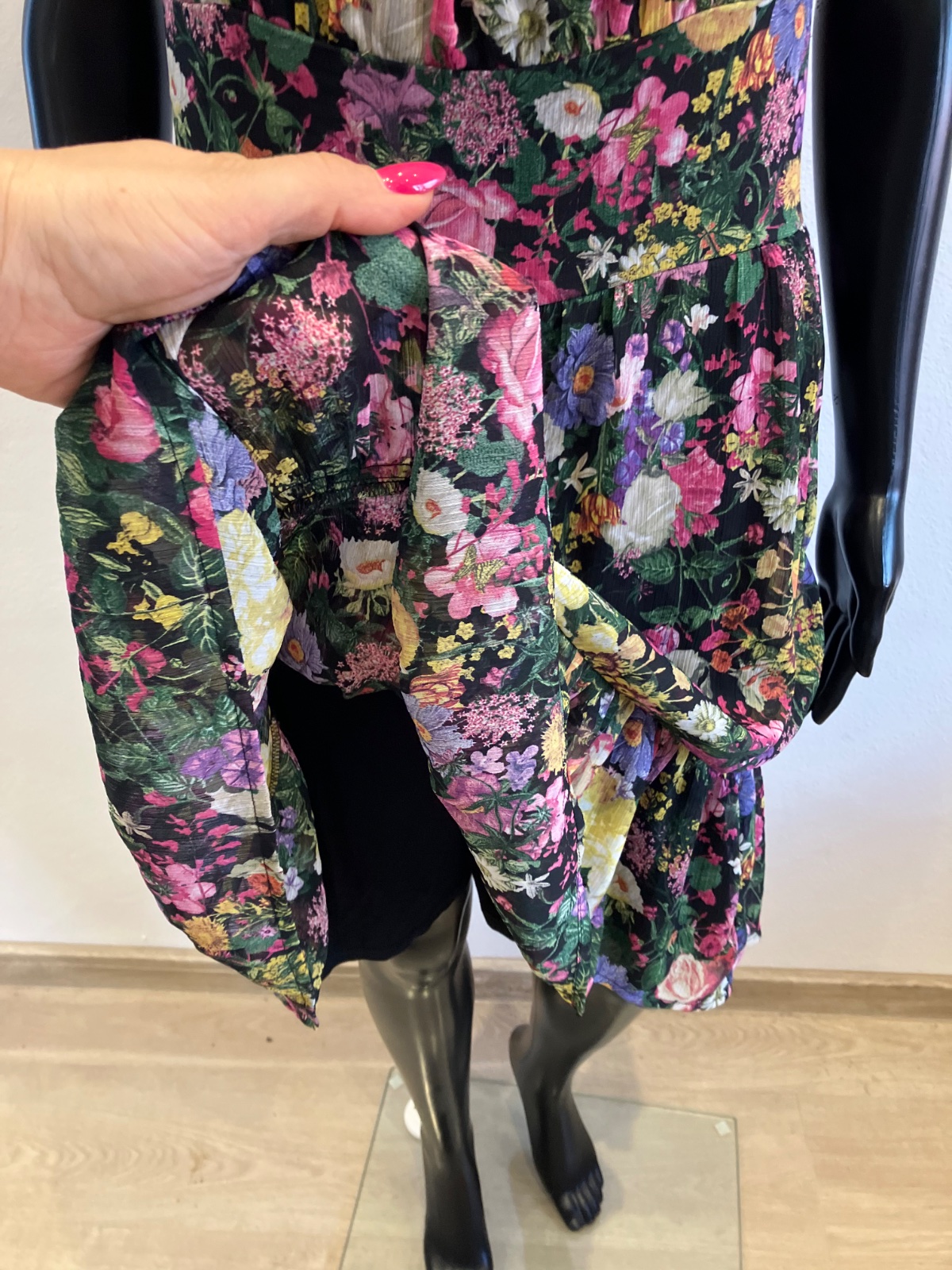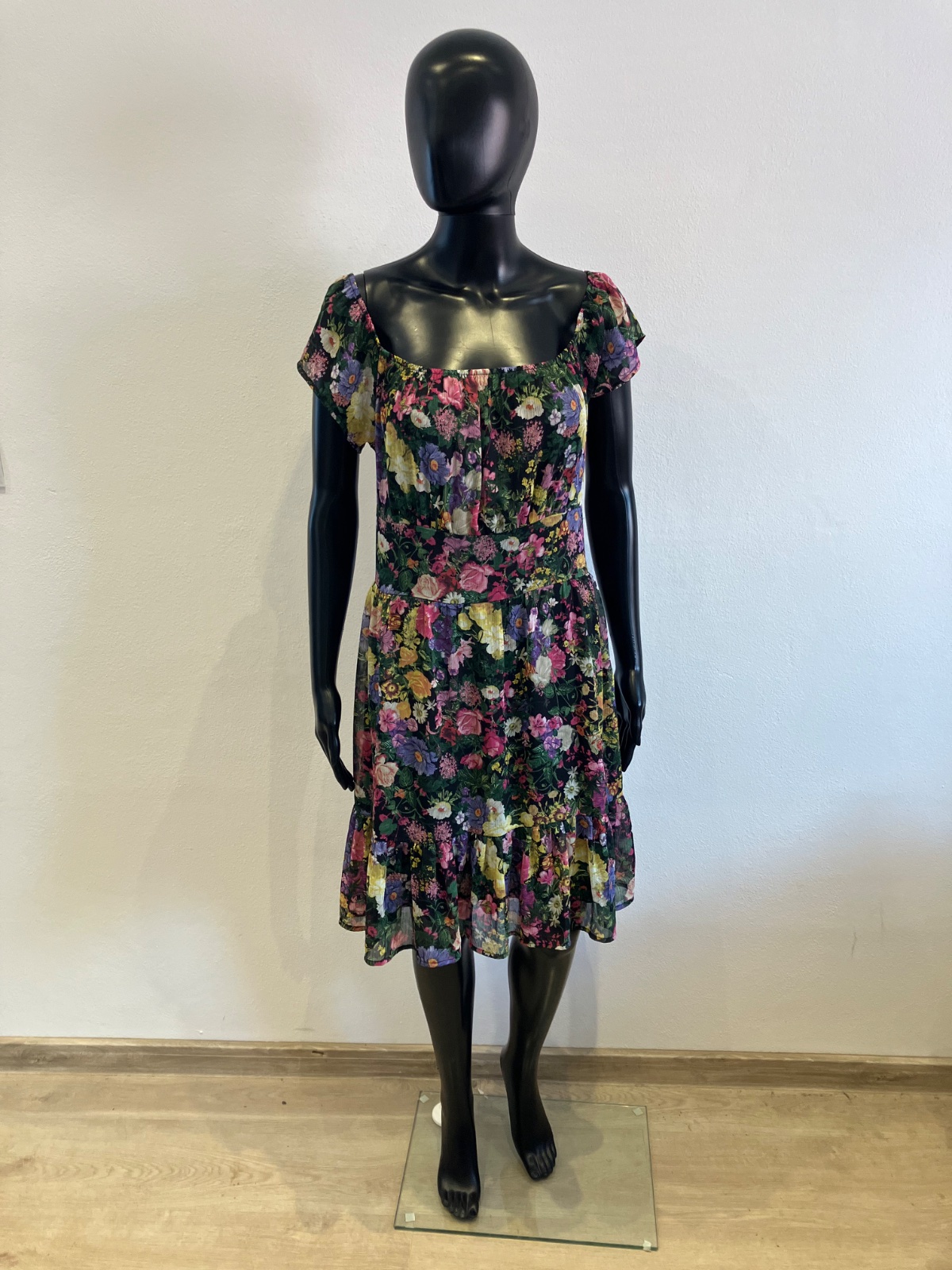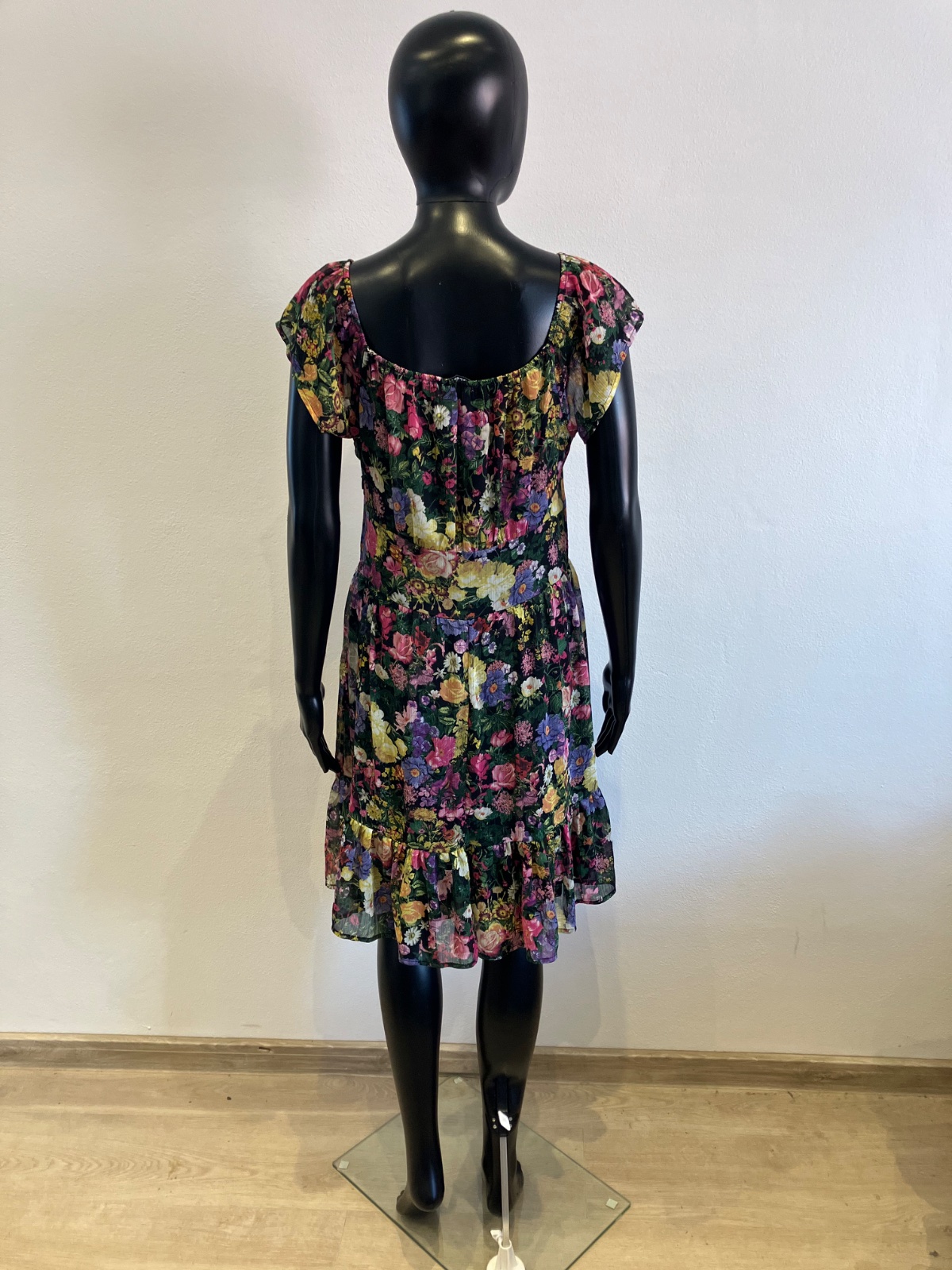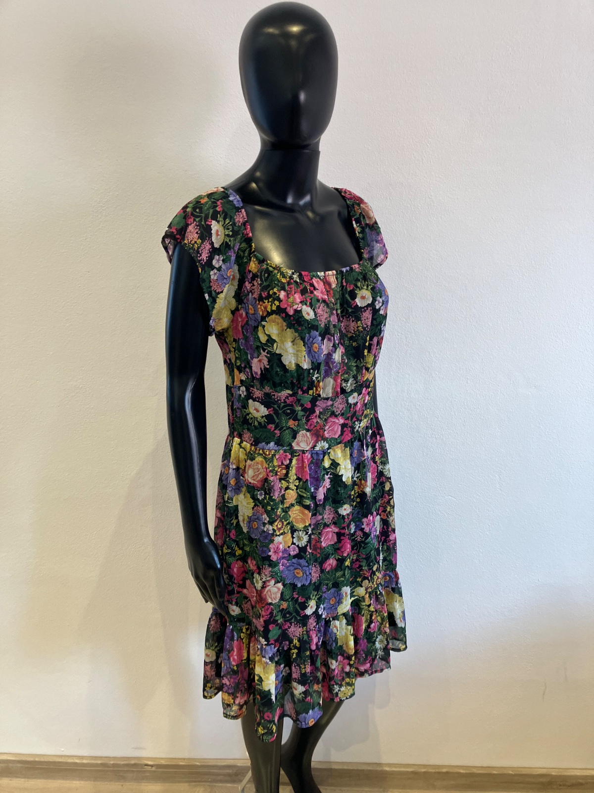 Dámske šaty s krátkym rukávom, kvetované, s volánmi na spodku, účkový výstrih, zapínanie na boku na zips, farba čierno-žlto-zeleno-ružová. Sú malo elastické. Veľkosť cca M.