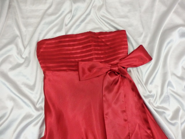 Kvalitné saténové šaty, červenobordovej farby, bez ramienok, vzadu nariasený do gumiek, podšité, super stav.