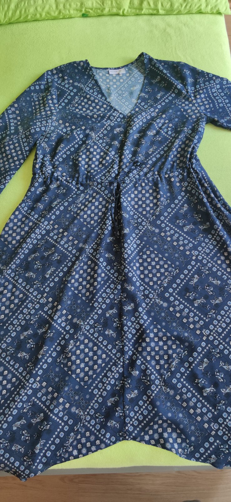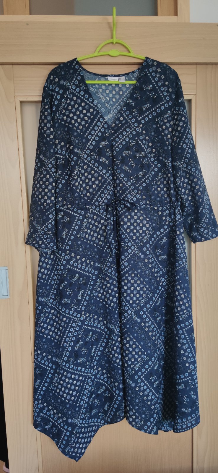 Predám málo používané dámske šaty s asymetrickým strihom. Príjemný nekrčivý materiál. Veľkosť 46. Dĺžka midi. Rukáv 3/4. Farba tmavomodrá vzorovaná.