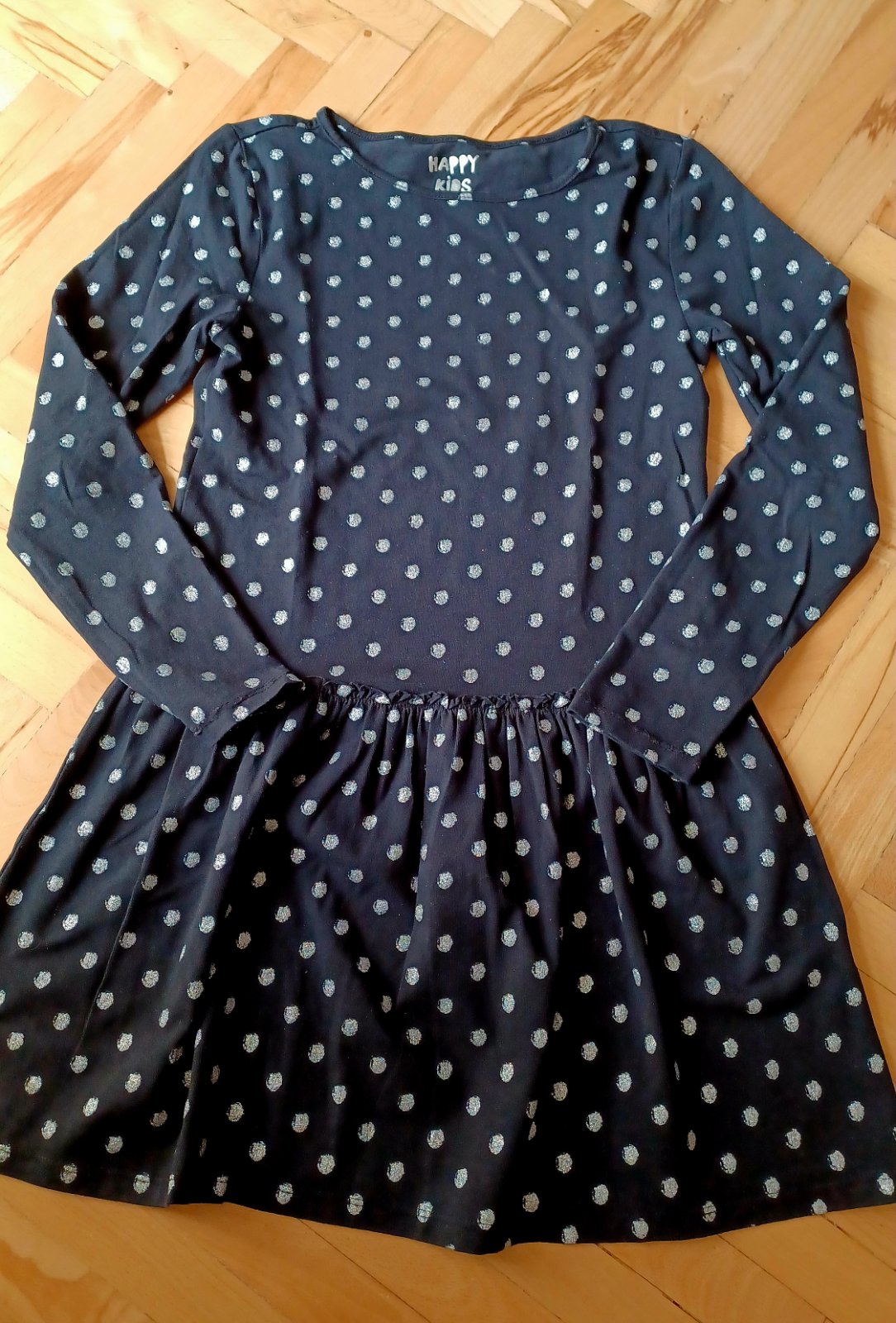 Krásne šatičky kvalitnej značky Tchibo TCM, veľ. 134/140. Čierne so striebornými bodkami. Oblečené len príležitostne, bez poškodení. Rozmery na fotkách.