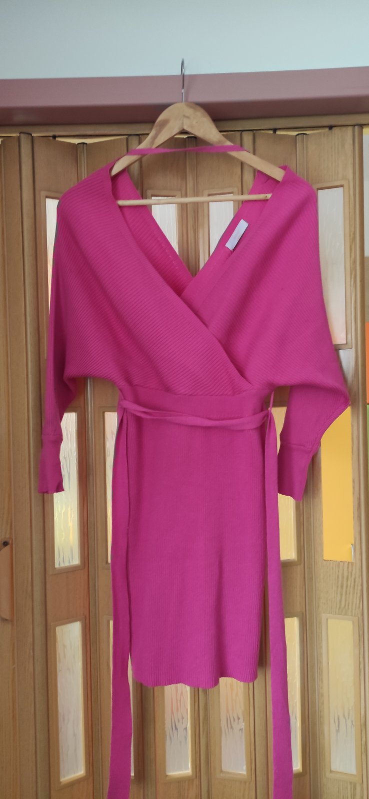 Svetrove ružové šaty sú elastickeho materiálu .dĺžka šiat 81cm.obvod pásu 74cm.dlzka rukáva 63cm
