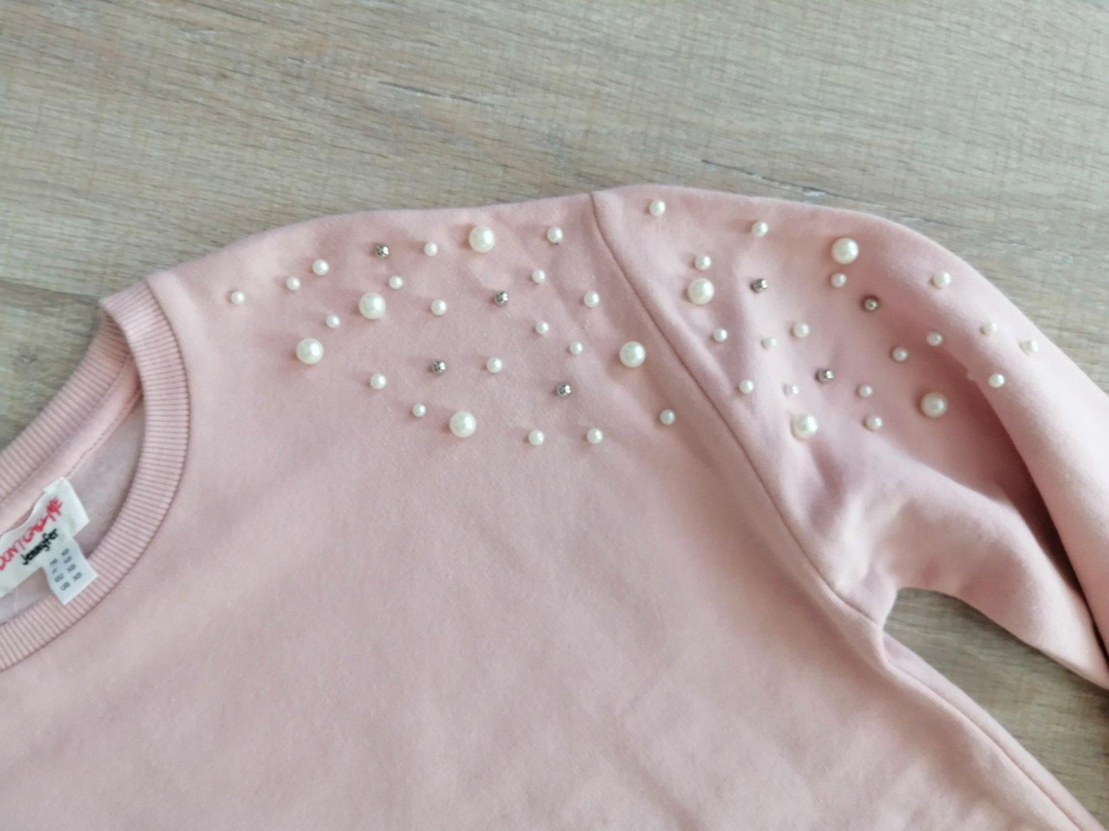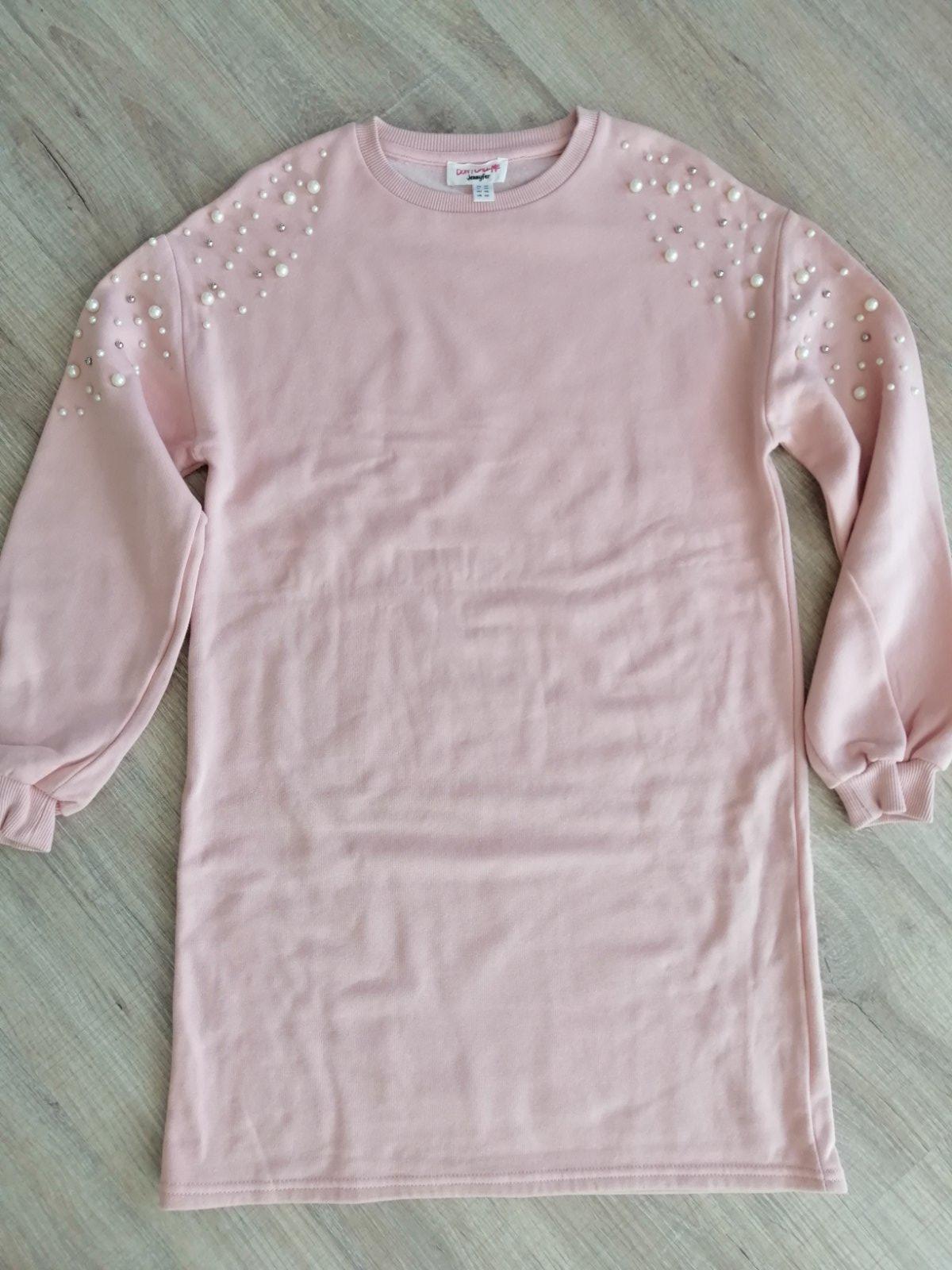Bledoruzové šaty zdobené perleťovými korálkami, nové, nesadla nám veľkosť, dĺžka 83cm, šírka 47cm x2, rukáv od krku 72cm.