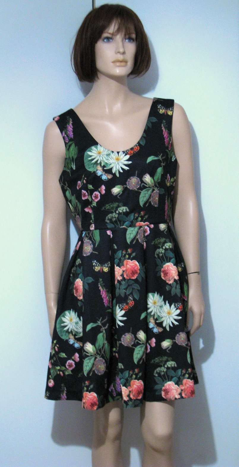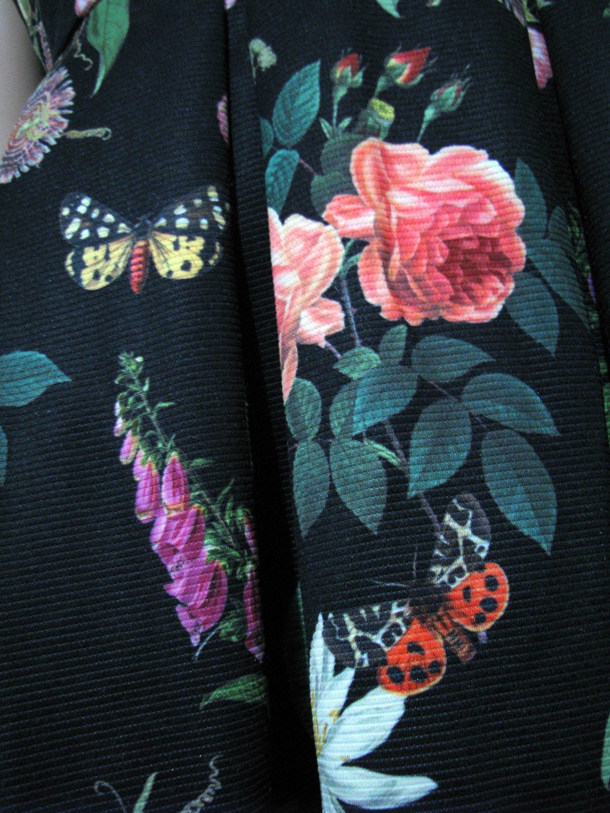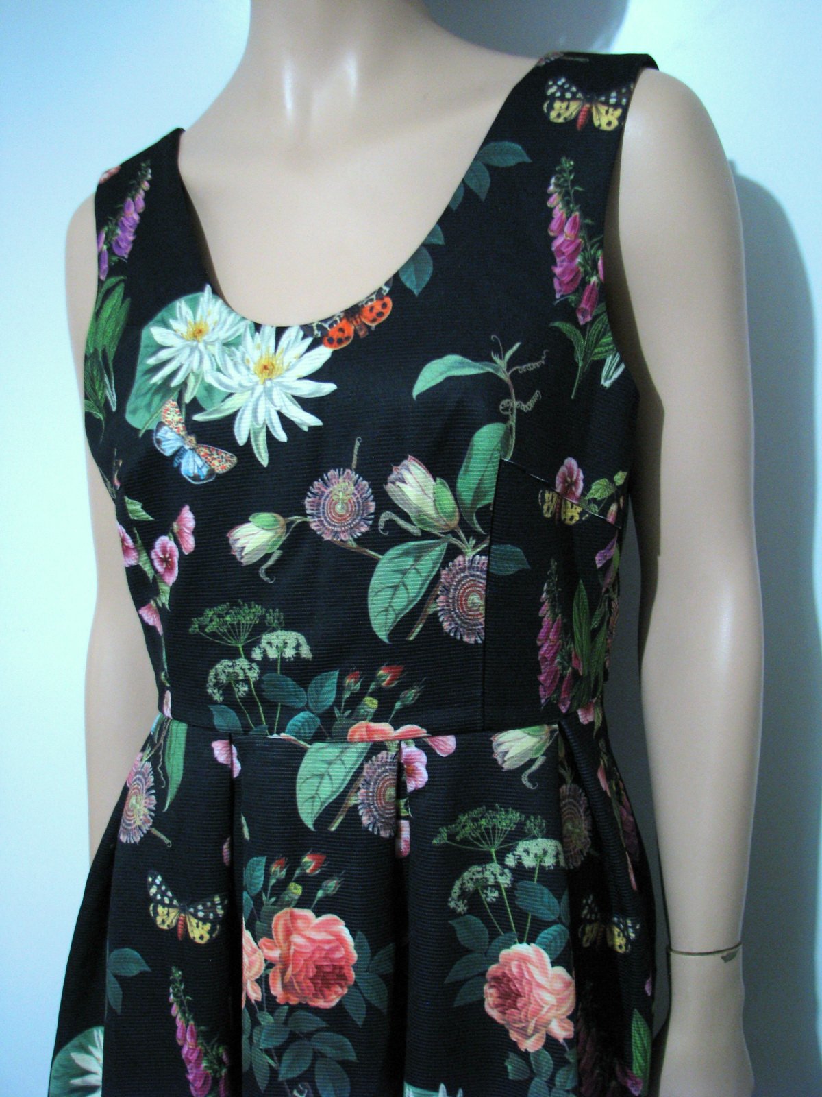 Nádherné letné slávnostné šaty s krásnym farebným vzorom kvetov a motýlikov na čienom podklade. Bohatá sukňová časť, skrytý zips na boku. Výborne zachovalé, bez poškodení. Materiál polyester + elastan, bavlnená podšívka. Veľkosť 42, myslím, že aj sedí, no sú skôr na nižšiu postavu. V prípade záujmu premeriam.