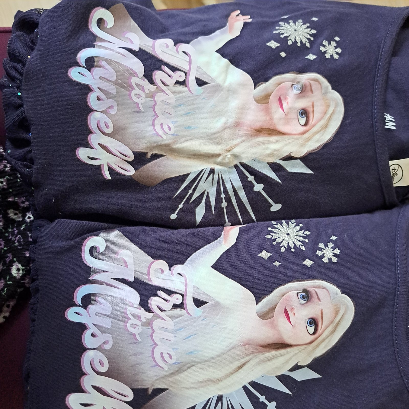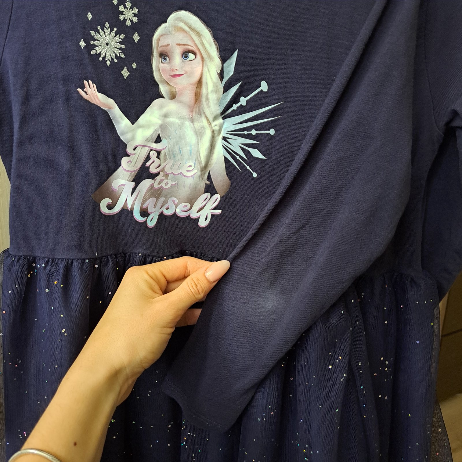 Dvoje krásne tmavomodré šaty s Elsou z Frozen, s trblietkami na tylovej sukni. Nepopukaná potlač. Jedny sú ošúchané na lakti. Inak pekný stav.