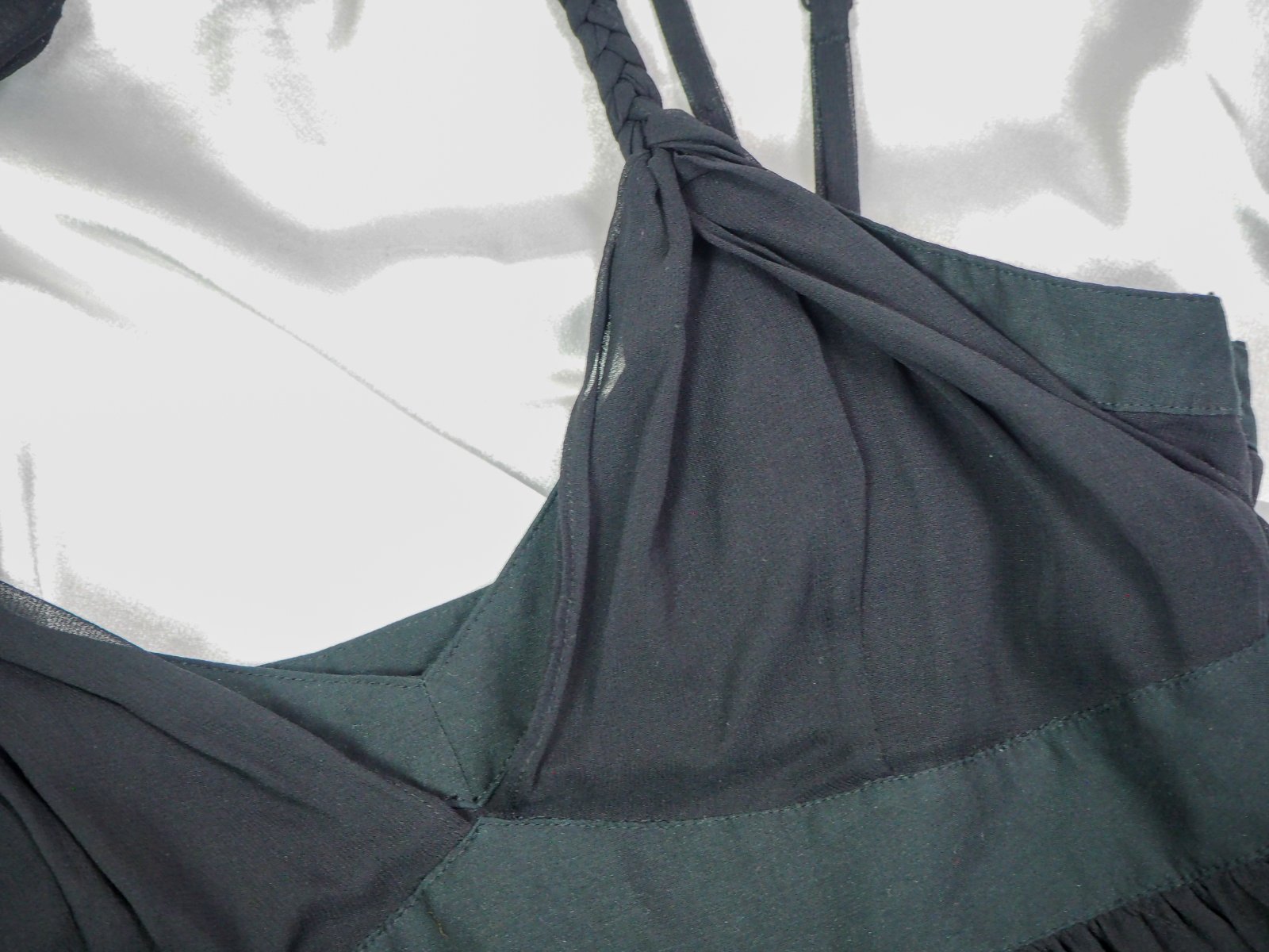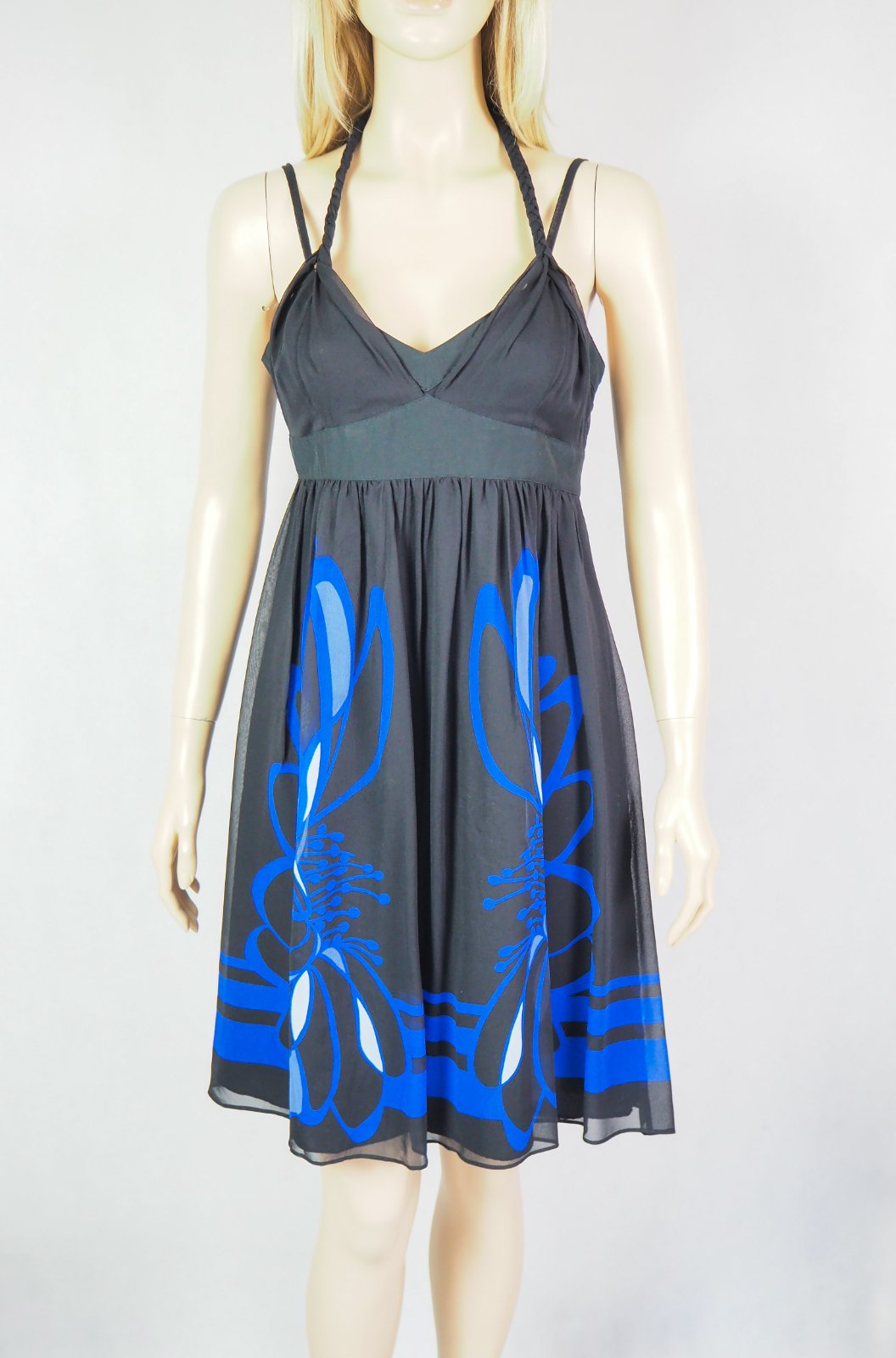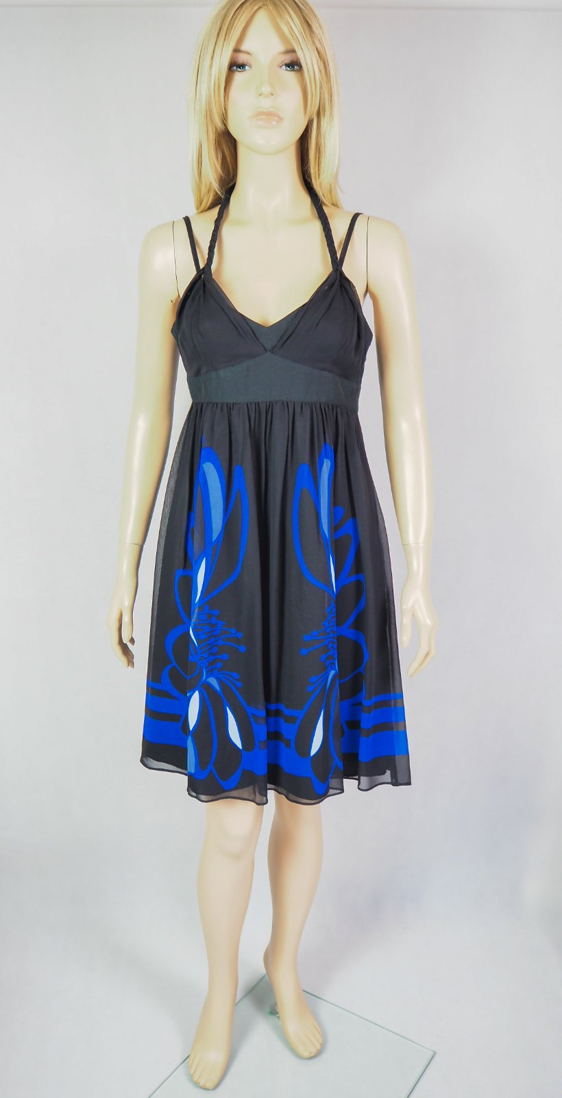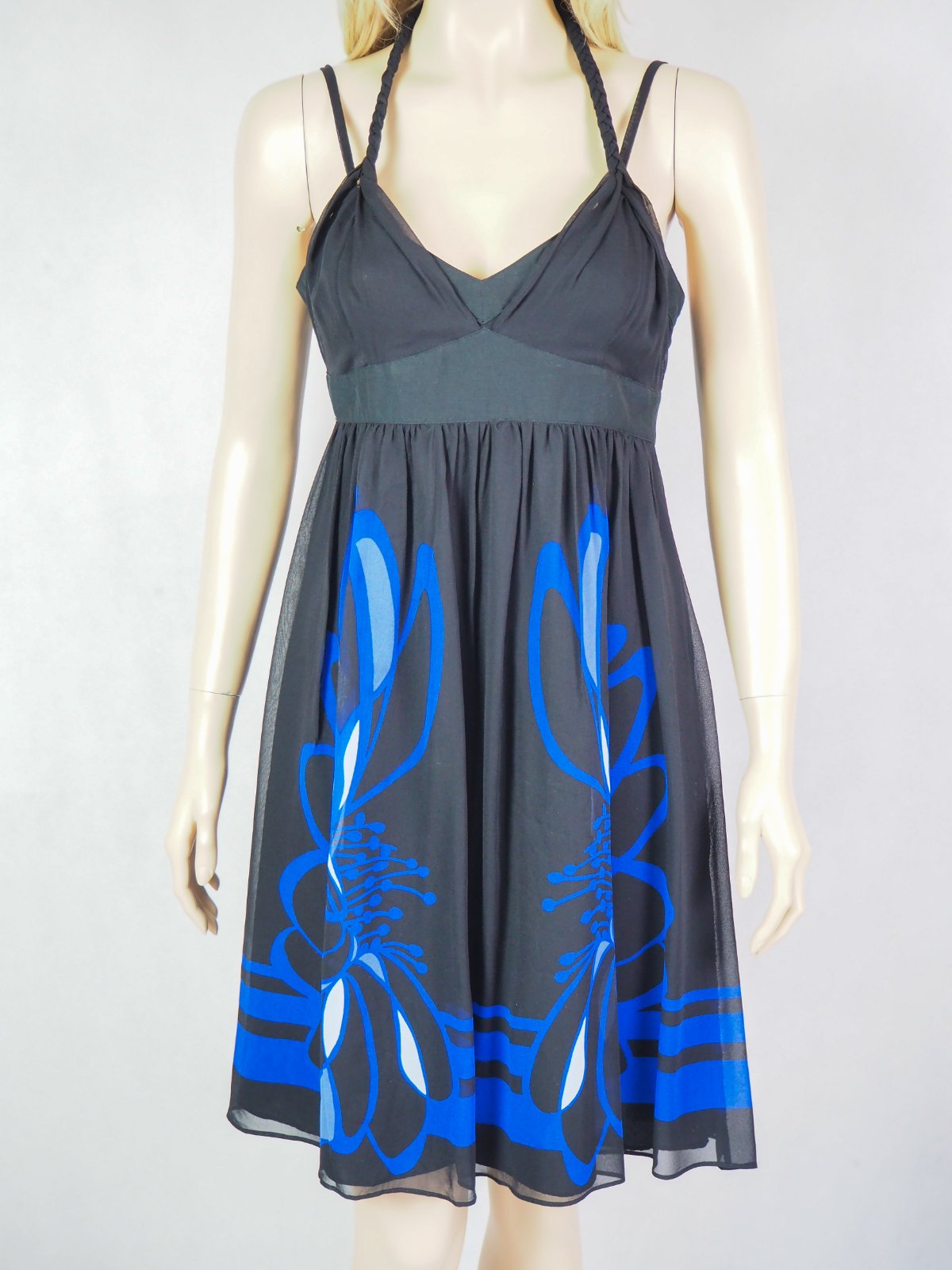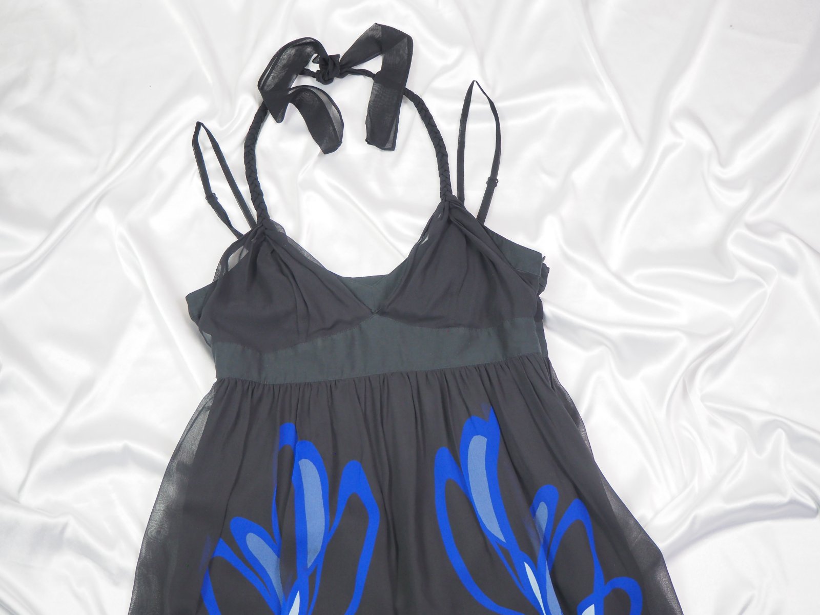 Luxusné hodbáne šaty čiernej farby, zdobené modrou potlačou, materiál 100% hodváb, regulovateľné ramienka, viazanie okolo krku, super stav.