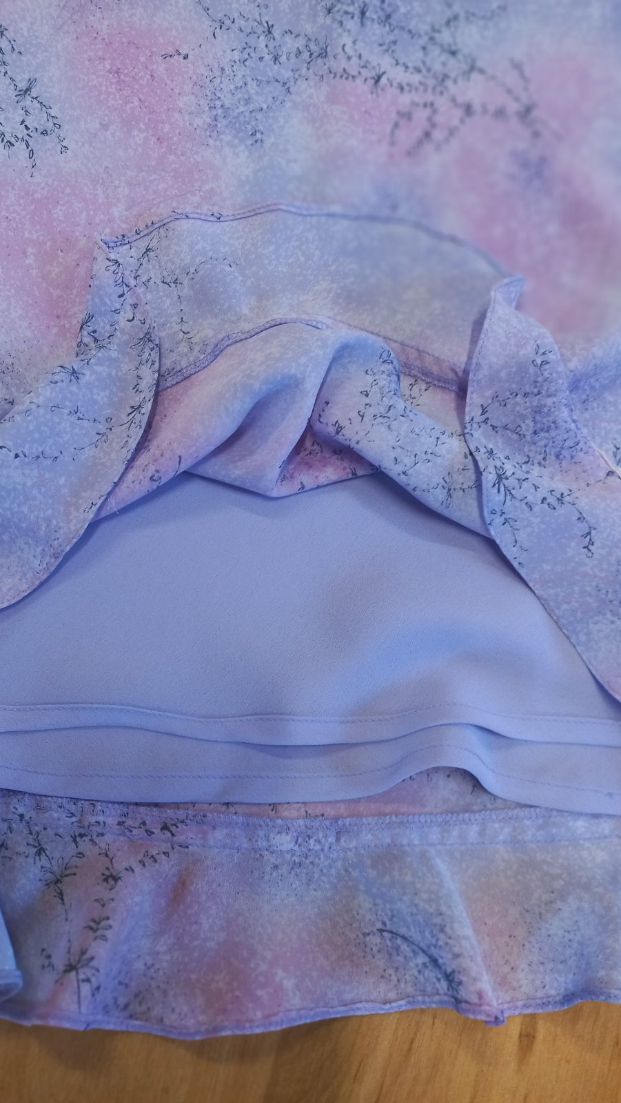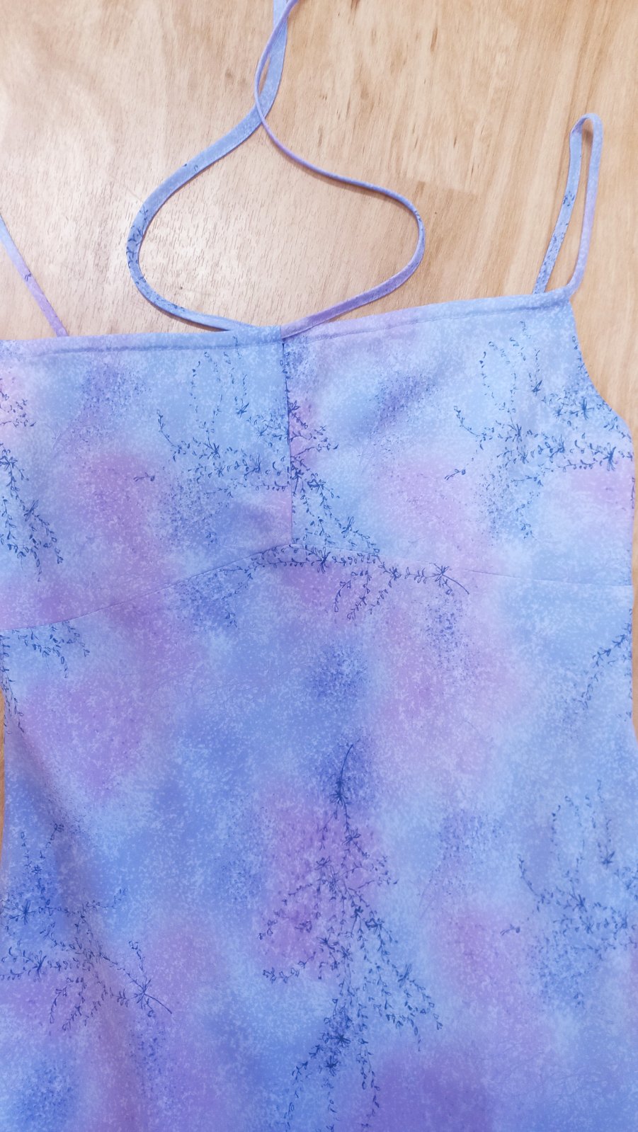 Zaujímavé šaty na ramienka, v dolnej časti volán malý. Zaväzovanie aj za krkom z prednej časti vstrede. Dĺžka 108 cm, 42 prsia. Podšité podšívkou a nekrčivé. Materiál umožňuje nosenie aj na malé spoločenské udalosti.