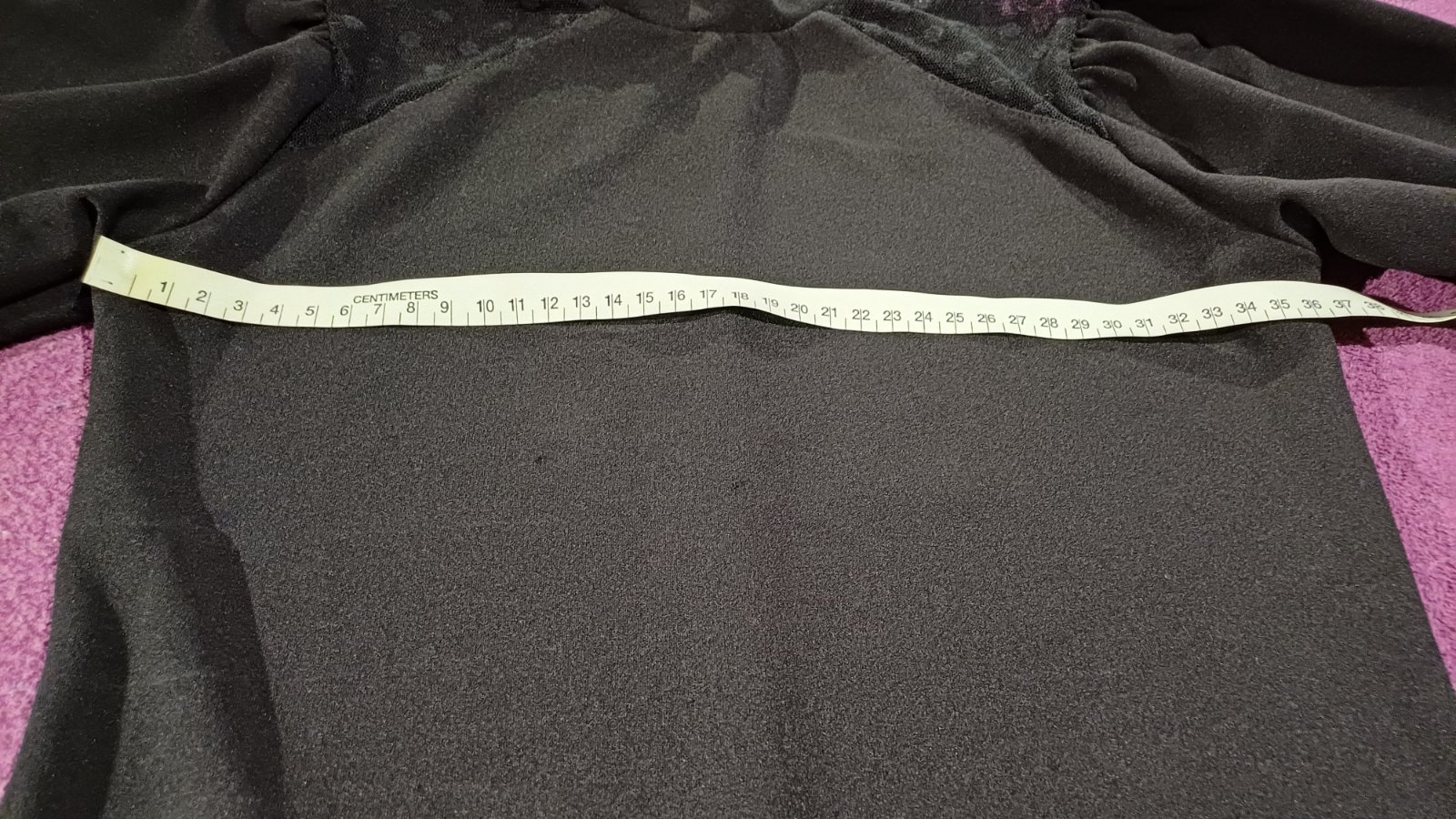 Vzadu gombíky. Dĺžka je 81,5 cm, rukáv od krku je 44,5 cm a šírka pod pazuchami je 37 cm.